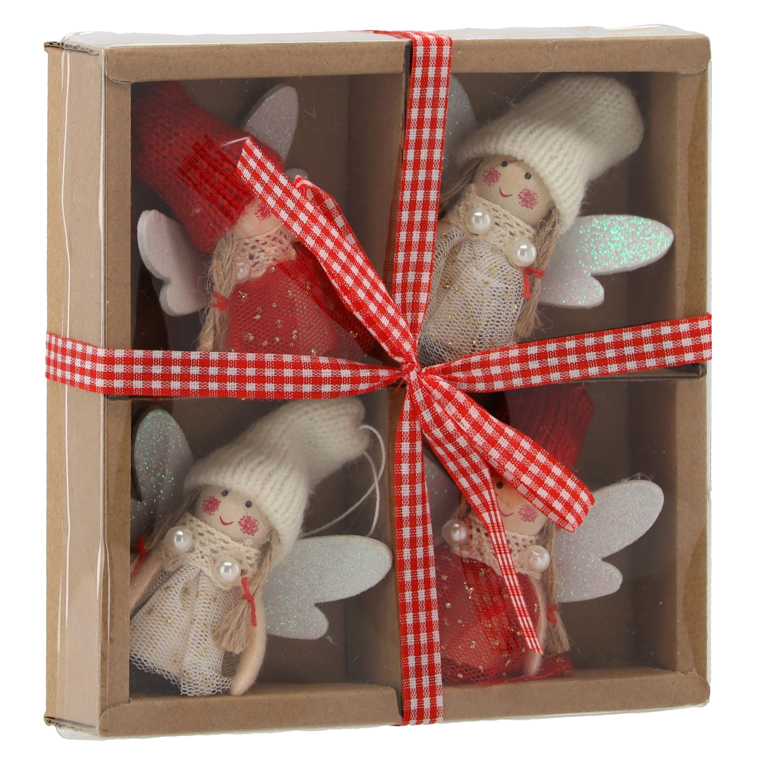 De set van vier engeltjes is verpakt in een kraftdoosje met venster en geruit lint – ideaal als kant-en-klaar kerstcadeau.