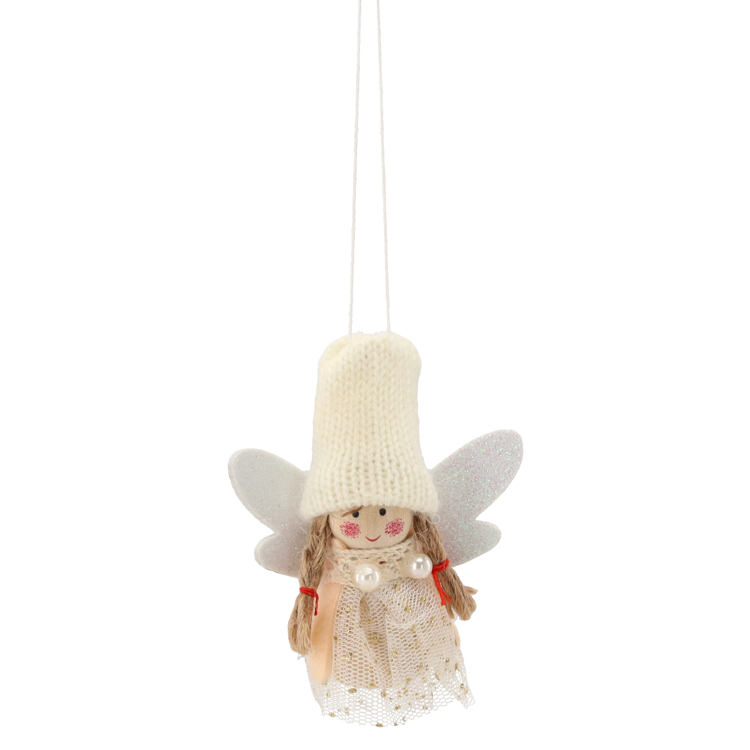 Een licht textielen ornament met glinsterende vleugels, tulejurkje met gouden stipjes en een lusje om eenvoudig op te hangen geeft je boom een warme, feestelijke touch.