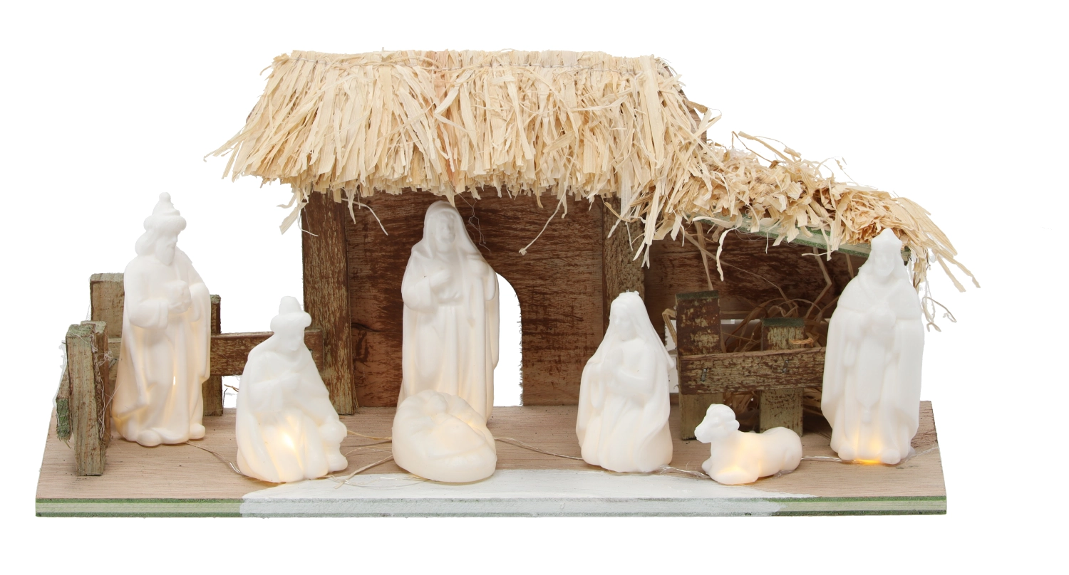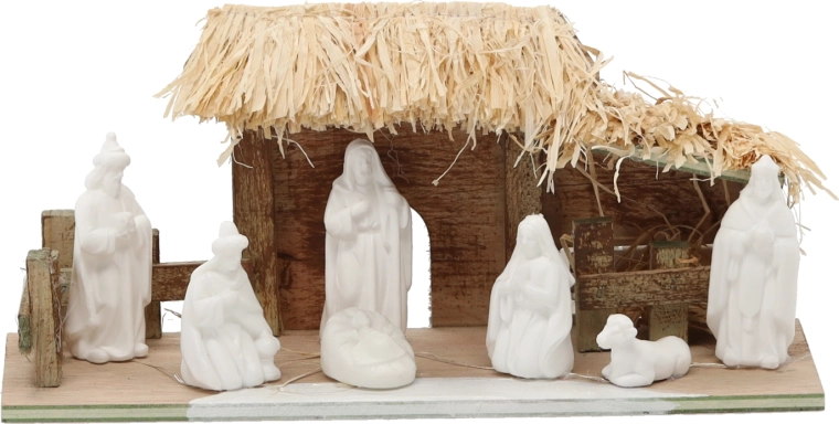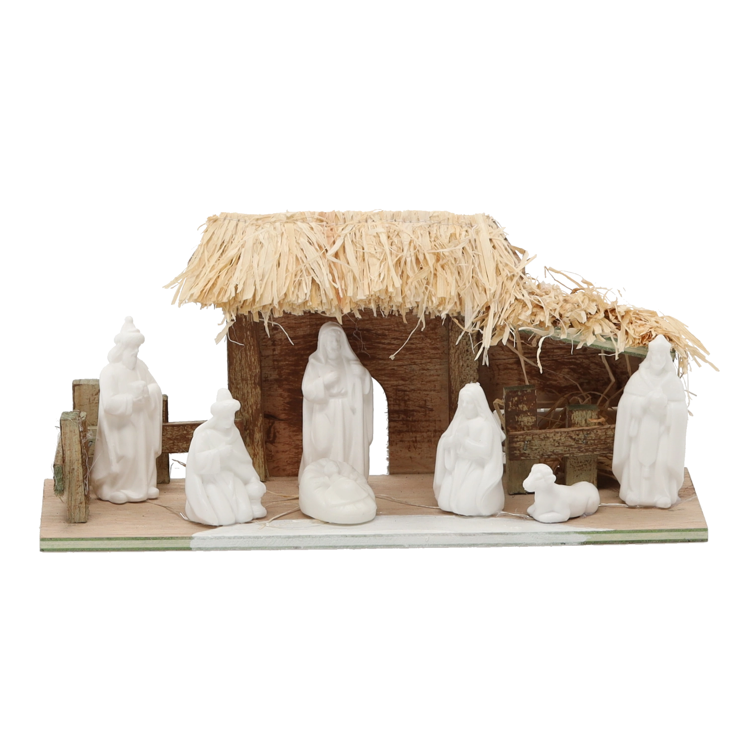 De combinatie van hout en een strodak oogt natuurlijk en knus. De kerststal past in een rustiek, boho of klassiek interieur.