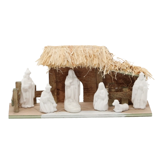 Deze elegante kerststal is gemaakt van hout en stro, waardoor hij een natuurlijke en gezellige uitstraling heeft. Zorgvuldig afgewerkte details van de afzonderlijke elementen benadrukken de traditionele look en passen perfect bij een boho-, rustieke of klassieke stijl.