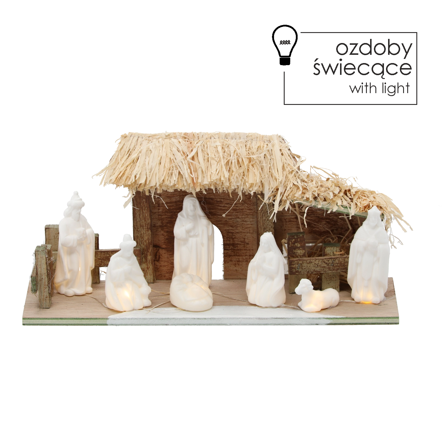 Creëer thuis een echte feestelijke sfeer met deze natuurlijke kerststal met LED-verlichting. Hij combineert een traditionele look van hout en stro met warm, energiezuinig LED-licht dat je interieur charme en gezelligheid geeft. Dankzij de universele afmetingen 31 × 10,5 × 13,5 cm past hij perfect op een dressoir, vensterbank, tafel of onder de kerstboom.
