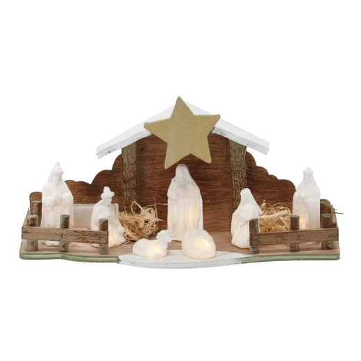 Deze stijlvolle tafelkerststal met houten stal en ster wordt aangevuld met witte figuren van de Heilige Familie, herders en dieren. De geïntegreerde warmwitte LED’s verlichten het tafereel subtiel en geven het interieur een prettig, niet-verblindend licht. Dankzij de rustieke elementen van hout en stro past hij bij klassieke, boho- en landelijke interieurs.