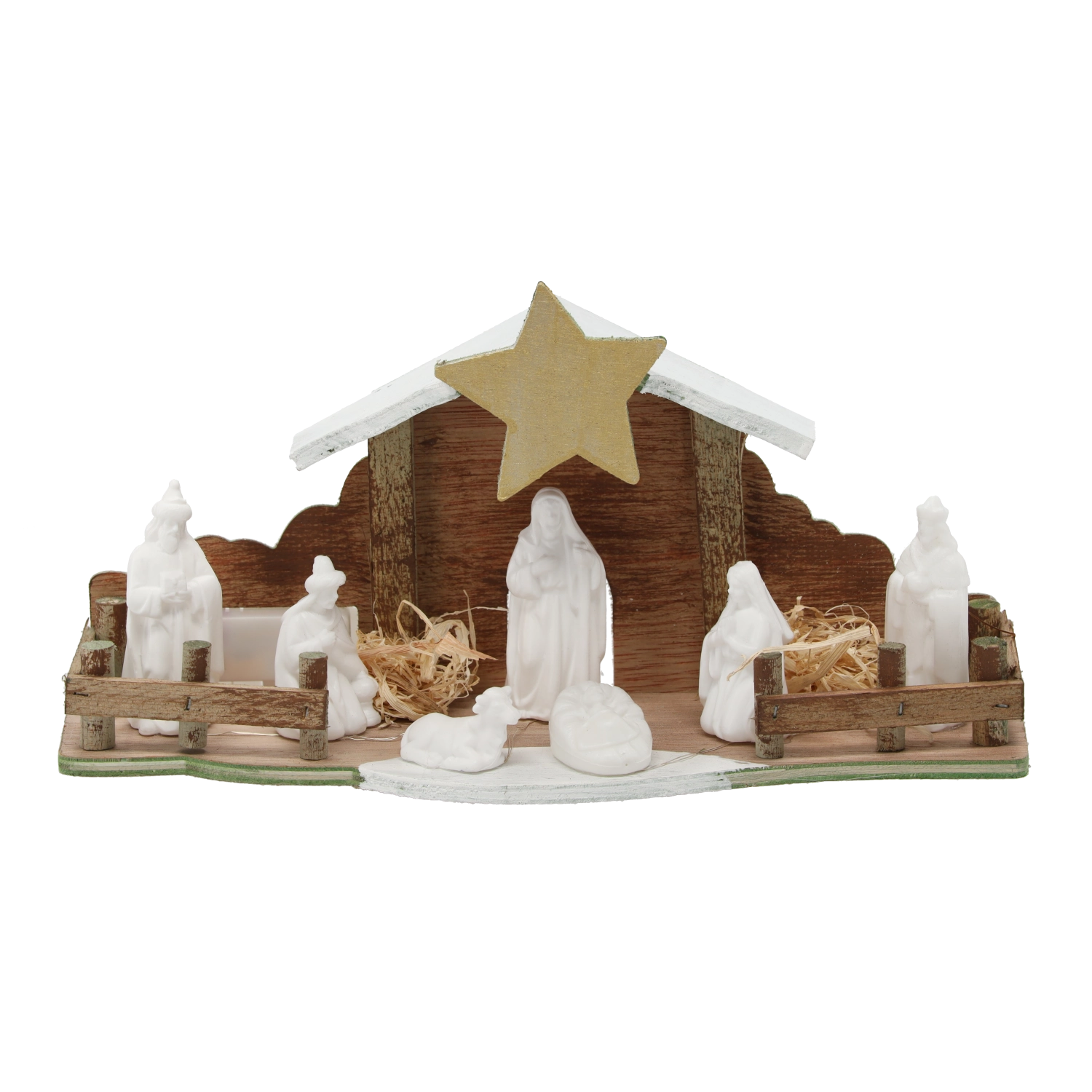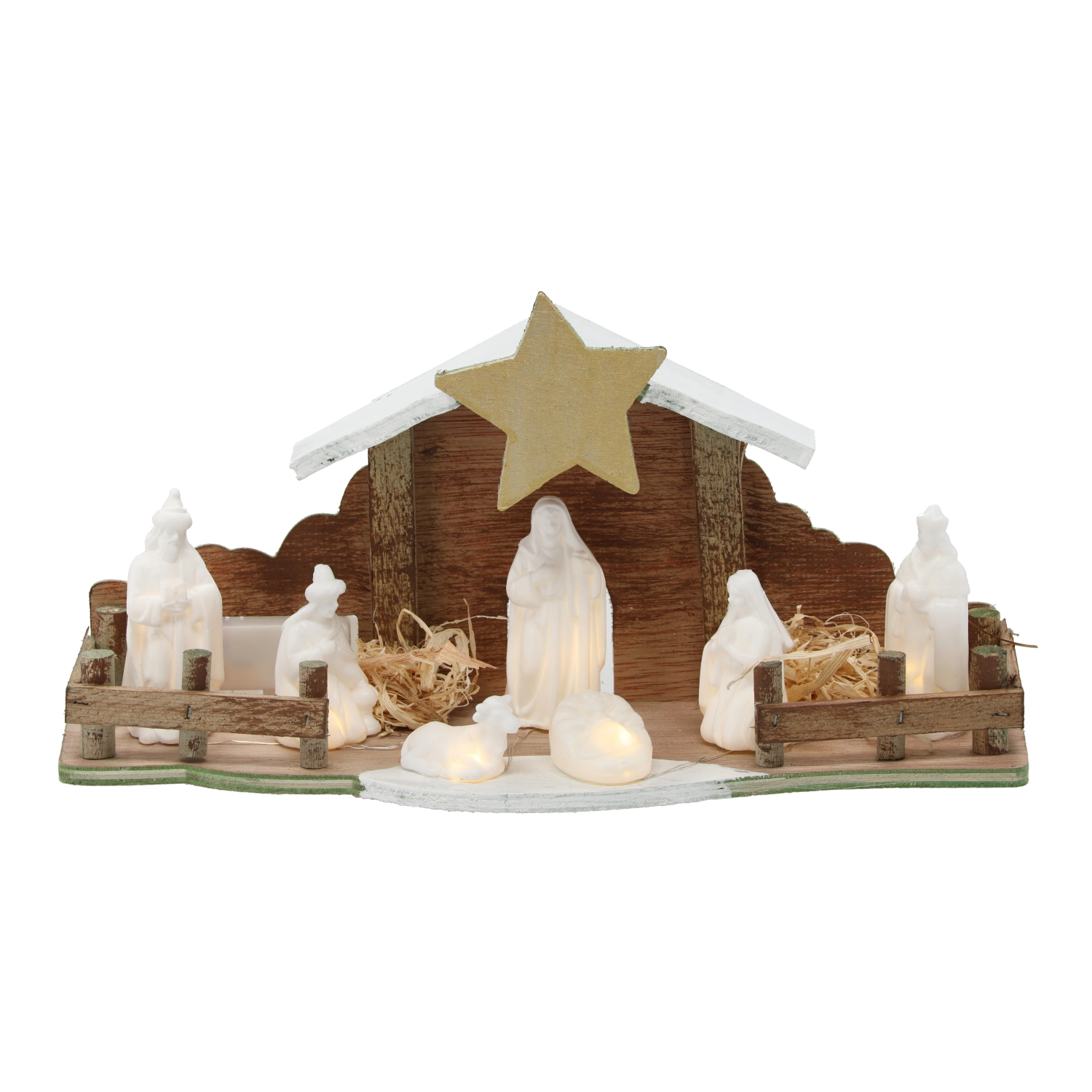 De stal van natuurlijk hout met hekwerk, ster en stroaccenten oogt authentiek en past perfect bij je kerstdecoratie.
