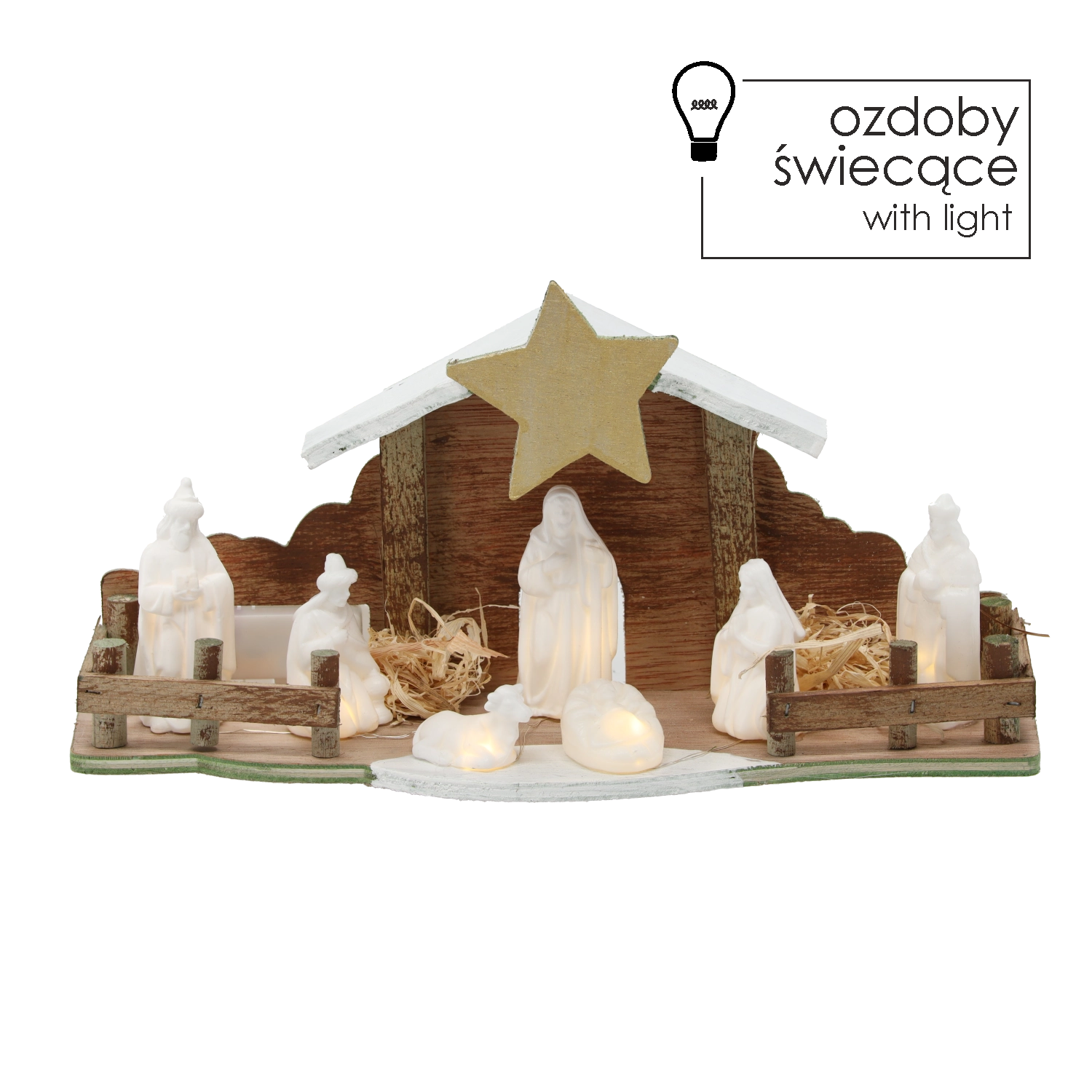 Geïntegreerde LED’s verlichten subtiel de stal en de figuren, accentueren details en zorgen voor aangenaam feestelijk licht met een laag energieverbruik.