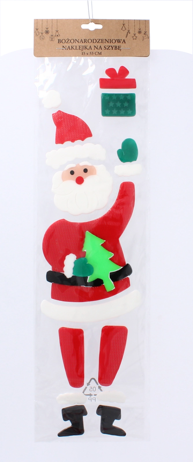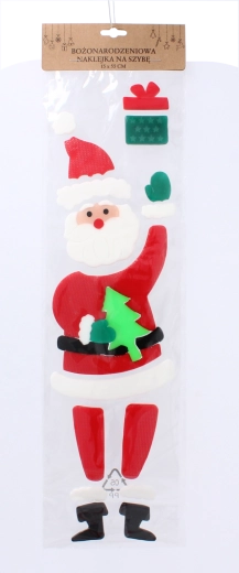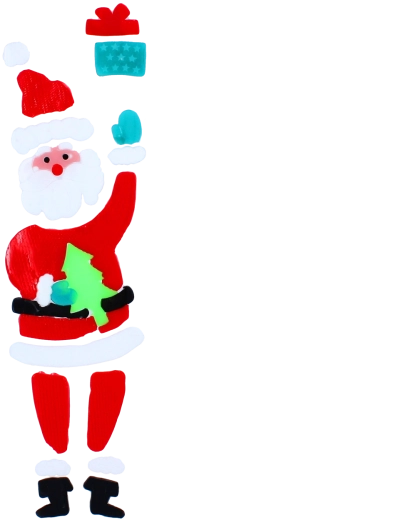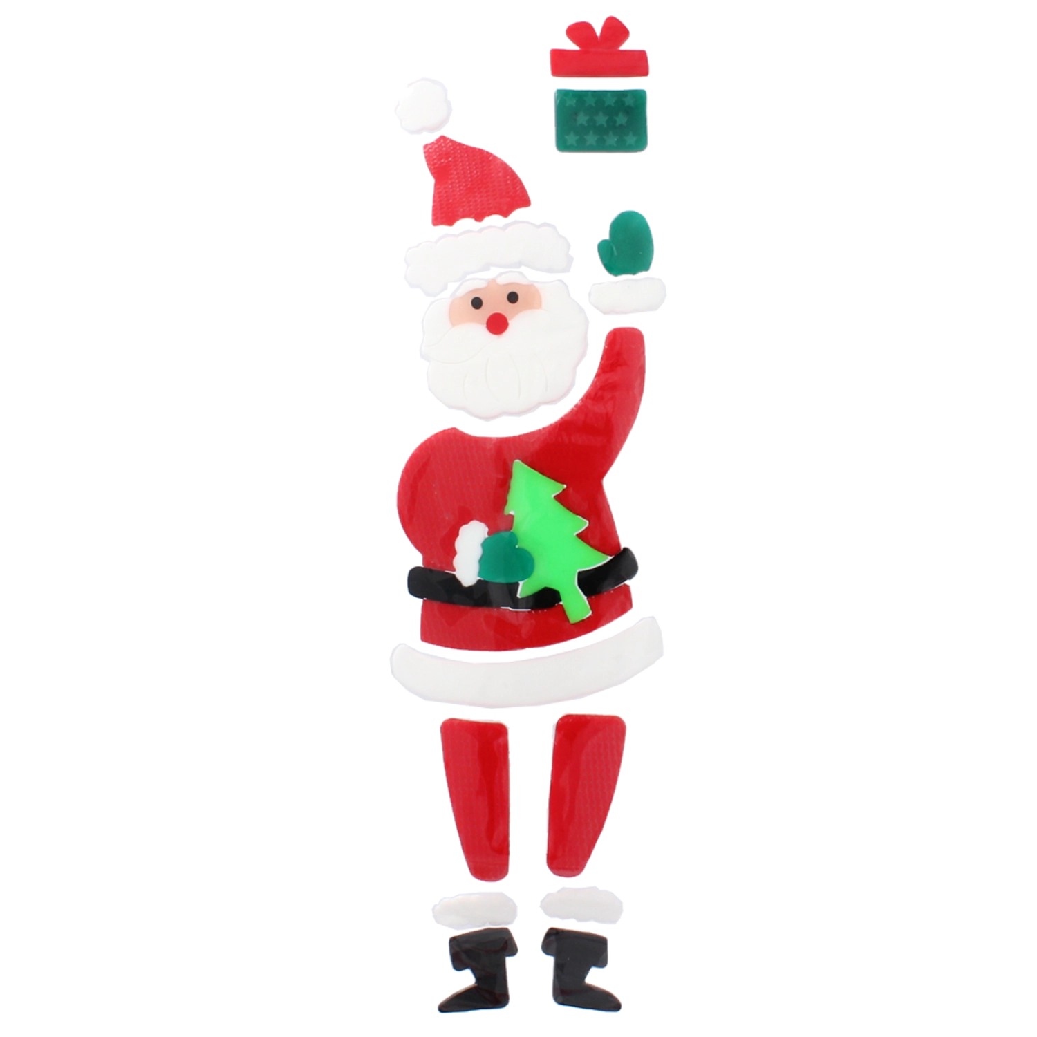 Het gesegmenteerde motief van de Kerstman met cadeau plaats je gemakkelijk op het glas en verplaats je wanneer je wilt – zonder lijm en zonder sporen.