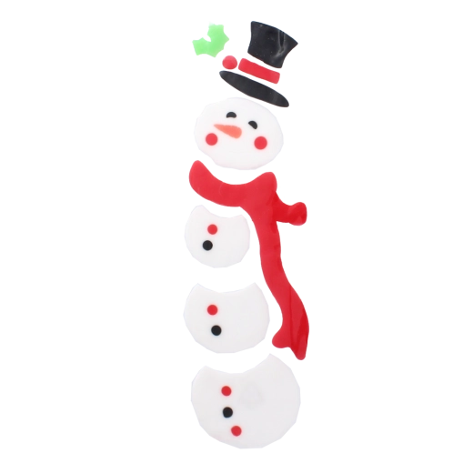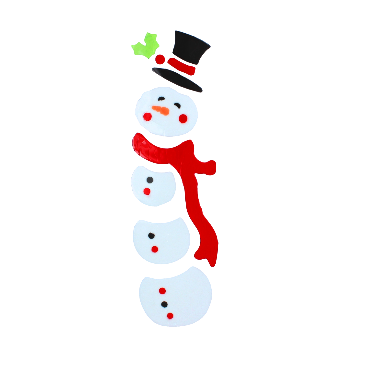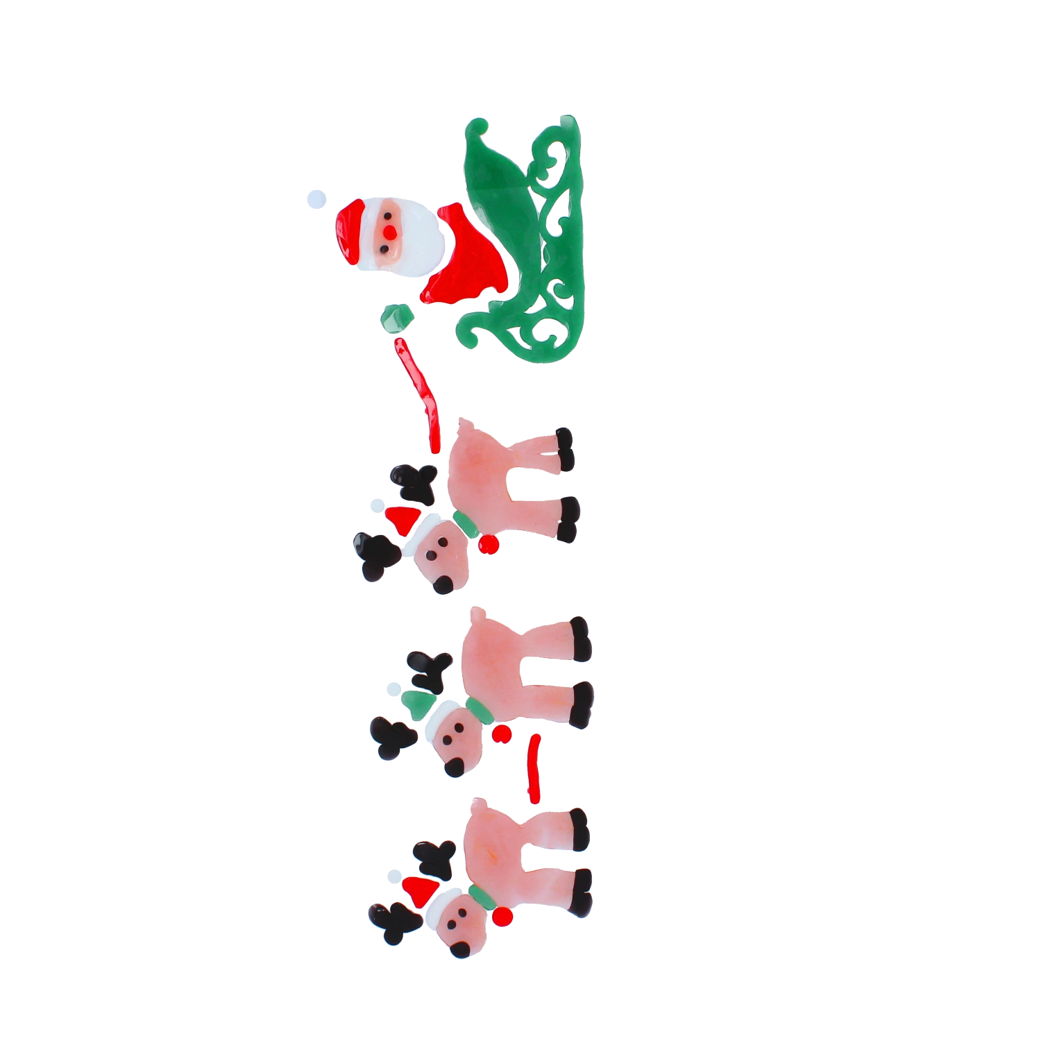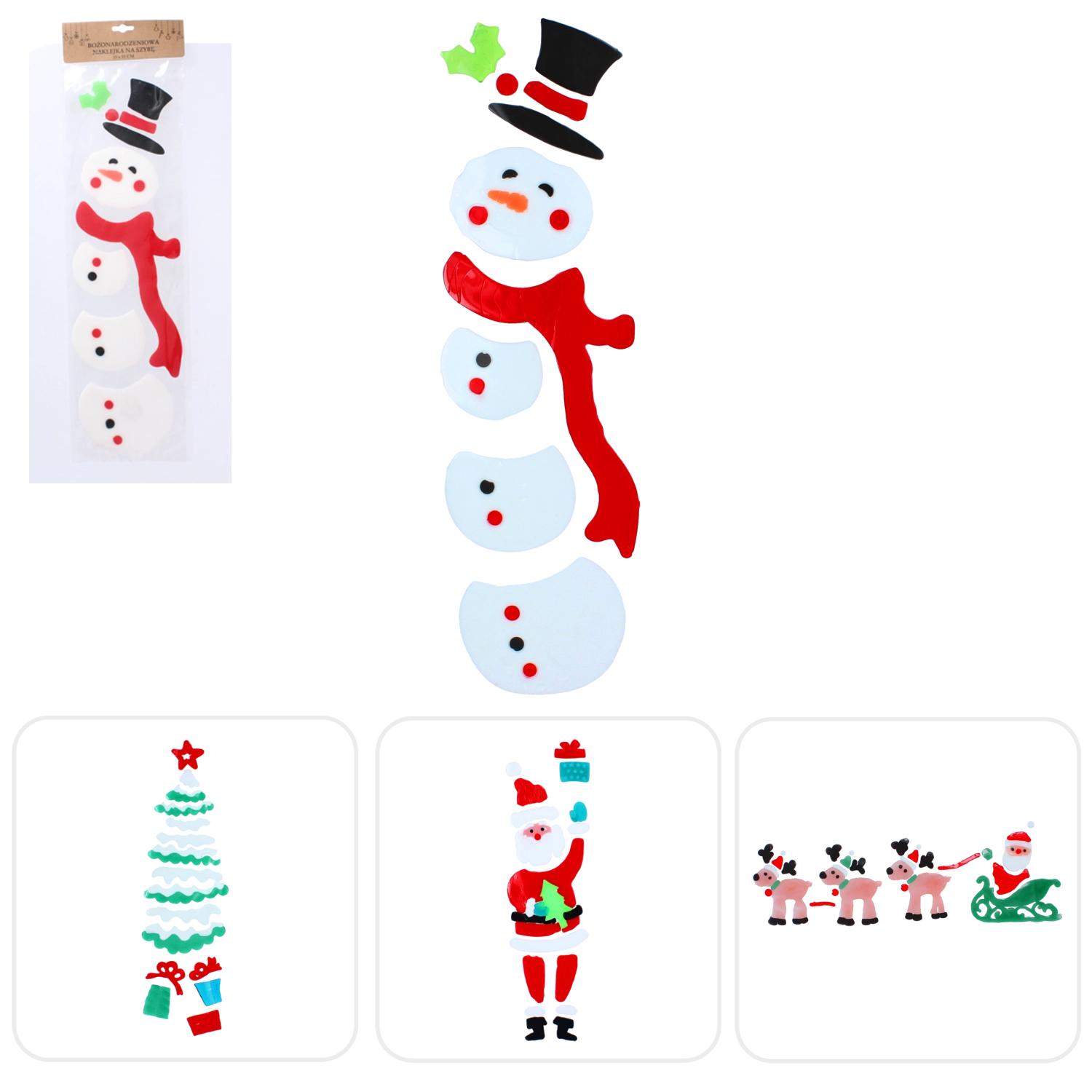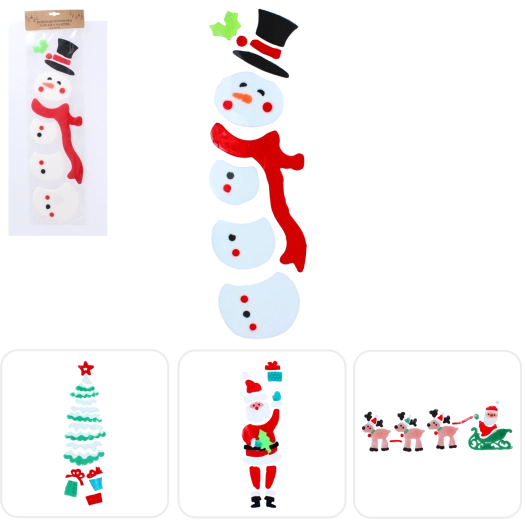 De set met vier designs laat je motieven combineren naar wens: de iconische Kerstman, een sneeuwman met sjaal en hoed, een kerstboom met ster en een slee met rendieren. De onderdelen zijn gesegmenteerd, zodat je ze creatief kunt rangschikken en unieke composities kunt maken op ramen, etalages en in kinderkamers.