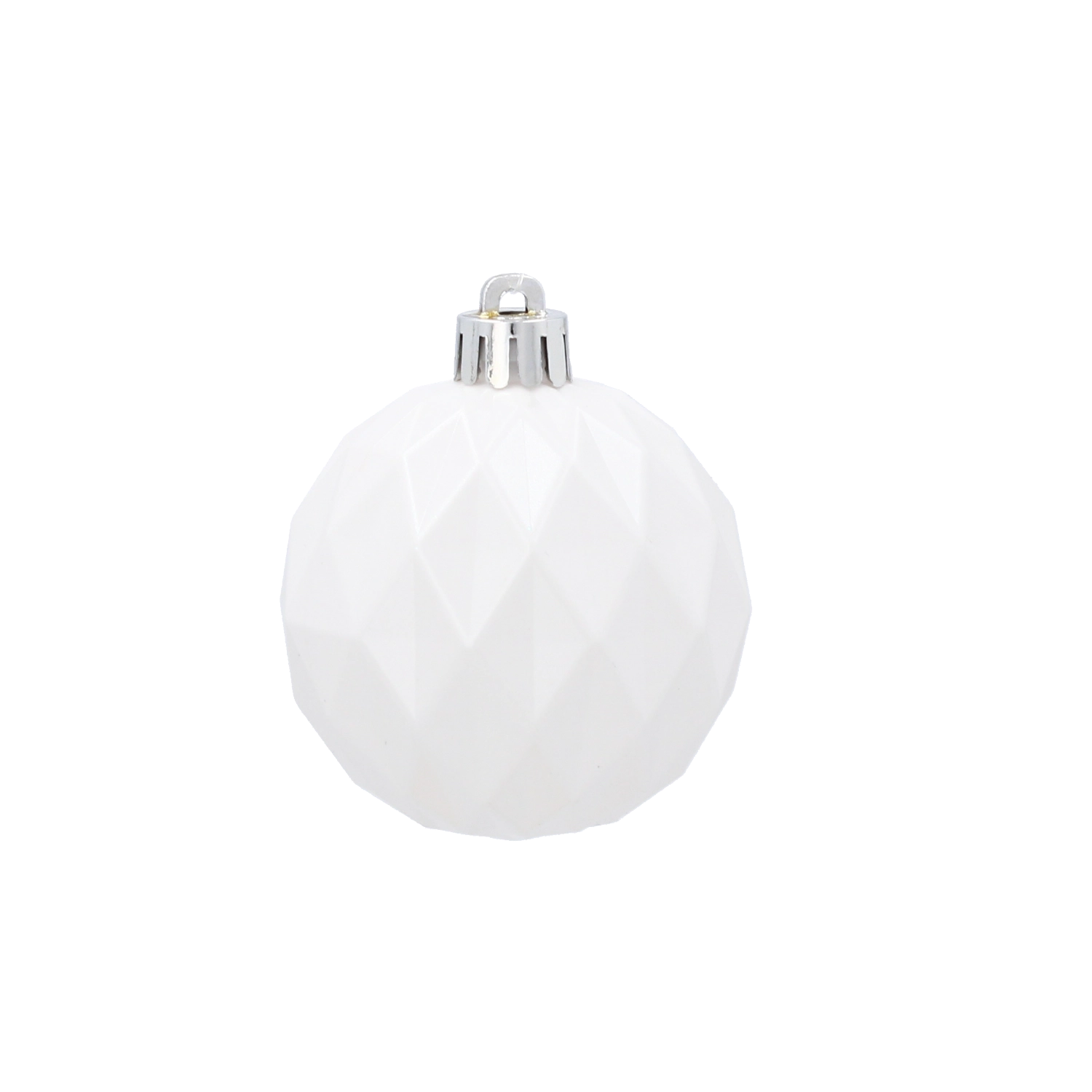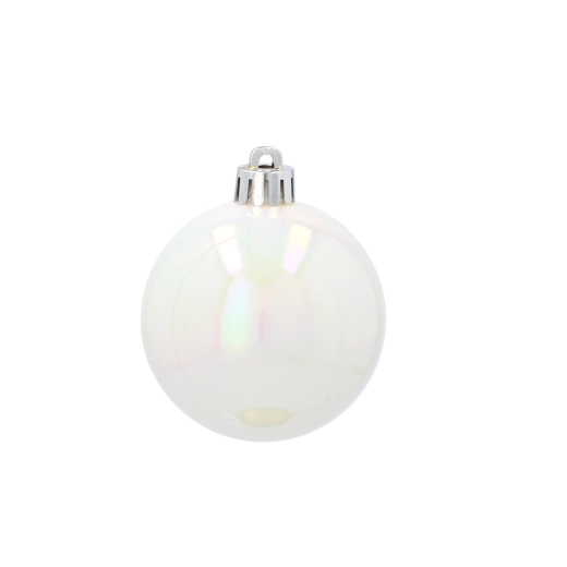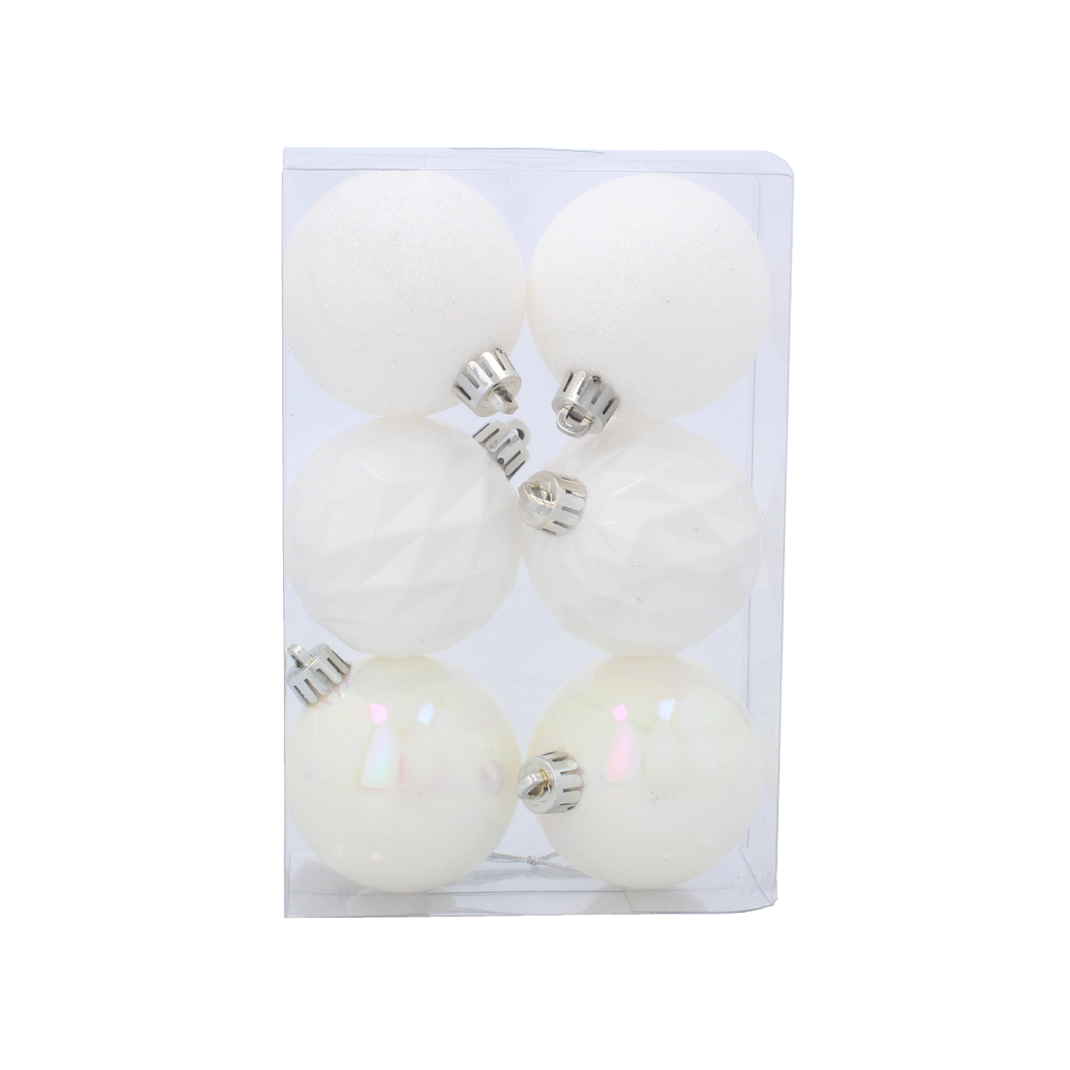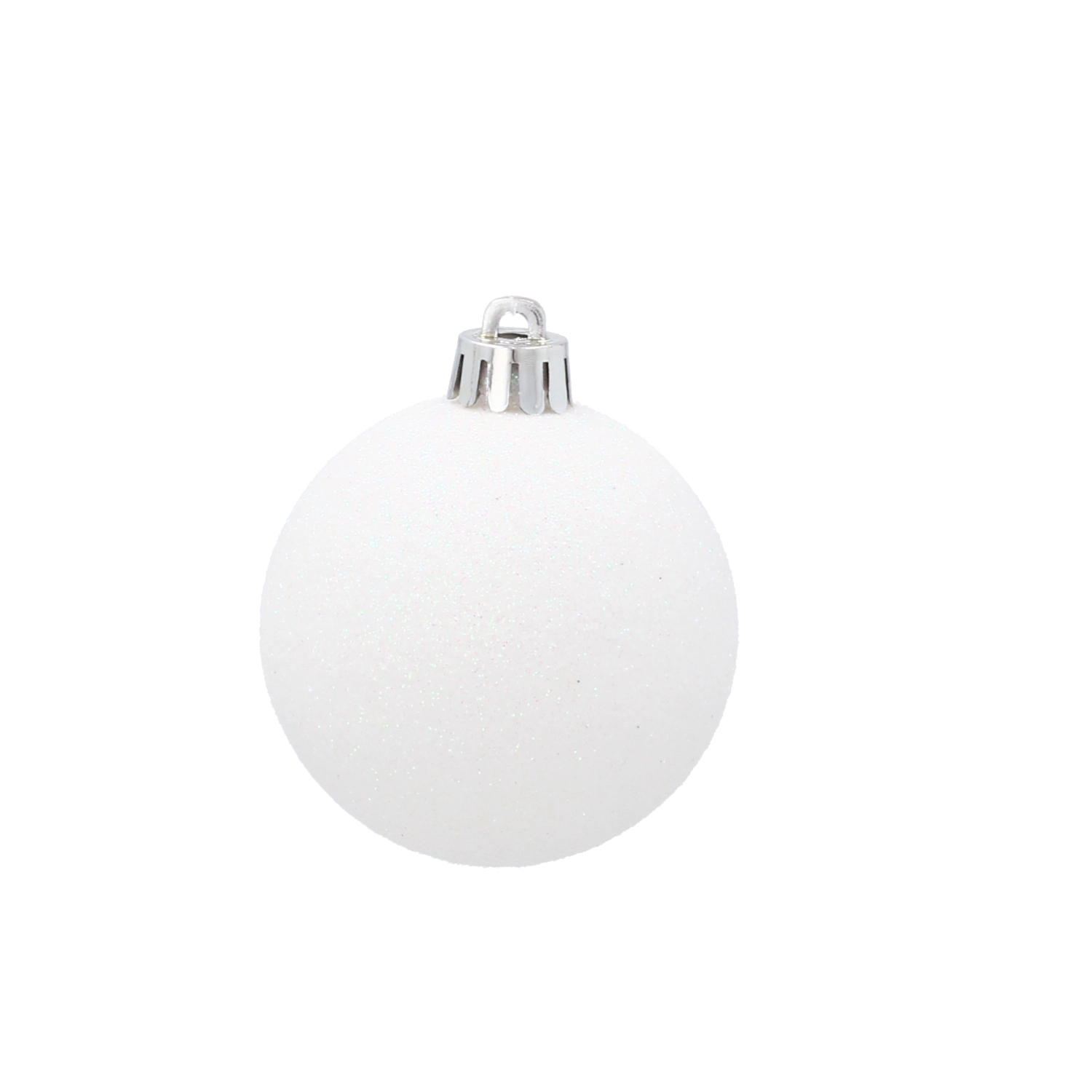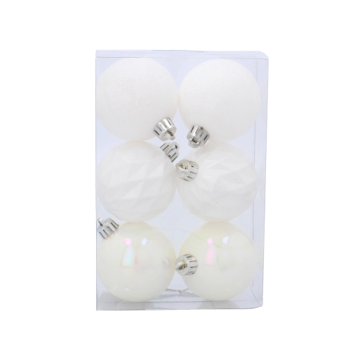Verfraai je boom met een elegante set van zes witte kerstballen met een diameter van 6 cm. De ornamenten van duurzaam kunststof zijn licht, onbreekbaar en klaar om op te hangen dankzij de metalen oogjes. De tijdloze witte kleur geeft het interieur een gevoel van zuiverheid en winterse charme, terwijl verschillende afwerkingen (mat, parelmoer, facet) diepte en glans aan de boom toevoegen.