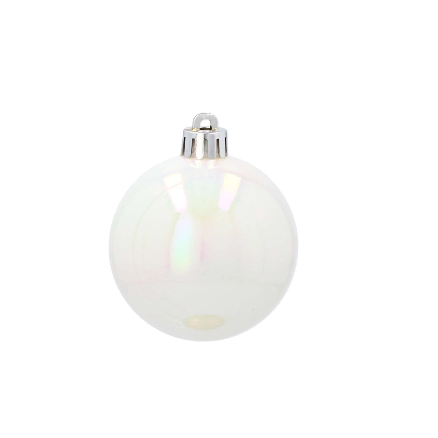 De set omvat matte, glanzende parelmoer- en facetballen die samen een elegante en harmonieuze contrastwerking in de boom creëren.