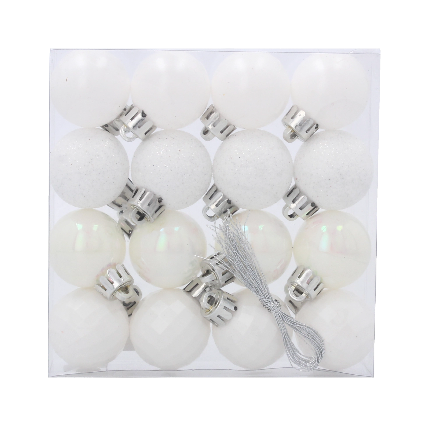 Set van witte kerstballen 3 cm – 16 stuks, mat, glanzend, glitter en discobal-effect