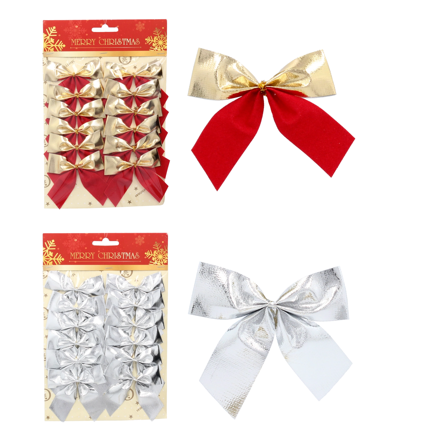 Creëer thuis de echte feestelijke sfeer met elegante strikjes in de combinatie zilver, rood en goud. De set bevat 12 stuks met een praktische draad voor eenvoudig bevestigen aan de kerstboom, krans of cadeaus. De hoogwaardige afwerking zorgt voor herhaald gebruik gedurende meerdere seizoenen.