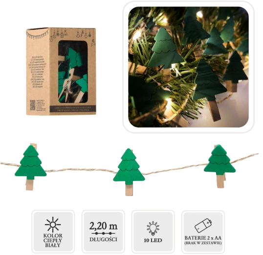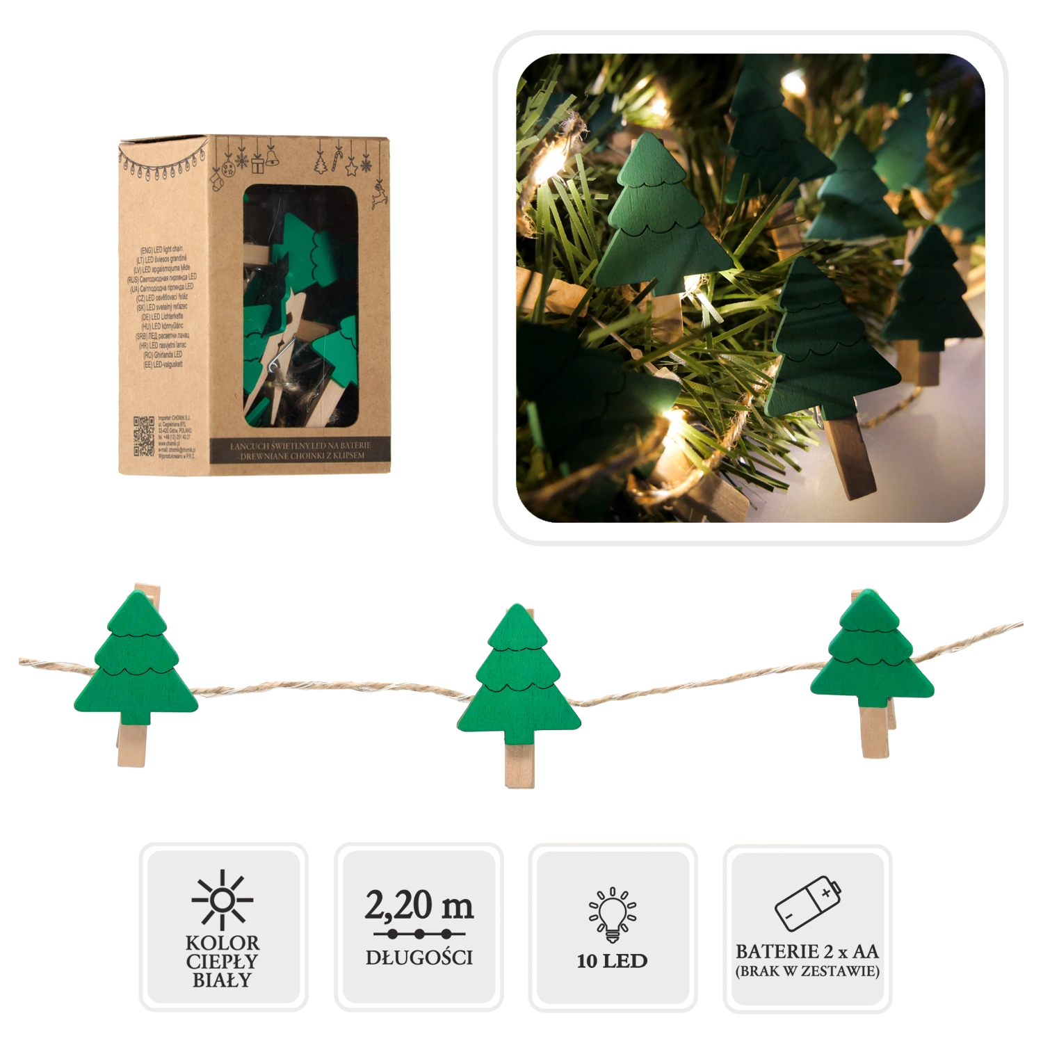 Dit decoratieve LED-lichtsnoer combineert licht en functionaliteit. Dankzij de houten knijpers in de vorm van kerstboompjes laat je gemakkelijk foto’s, ansichtkaarten, naambordjes of kleine versieringen zien. Warme witte LED’s creëren sfeervol licht dat de magie van Kerst onderstreept in de woonkamer, kinderkamer of op een feestelijk gedekte tafel.