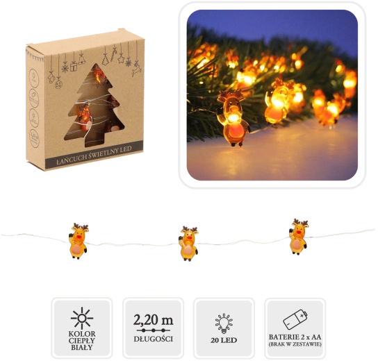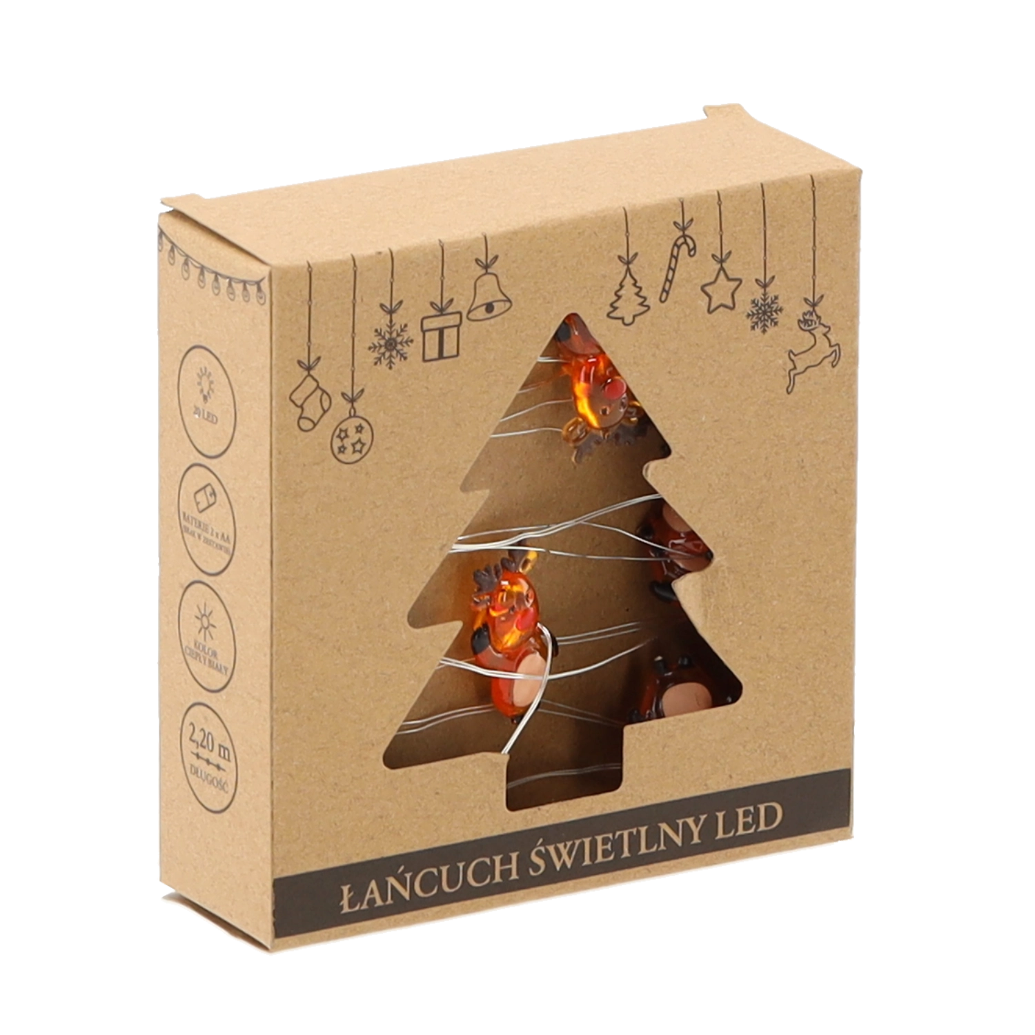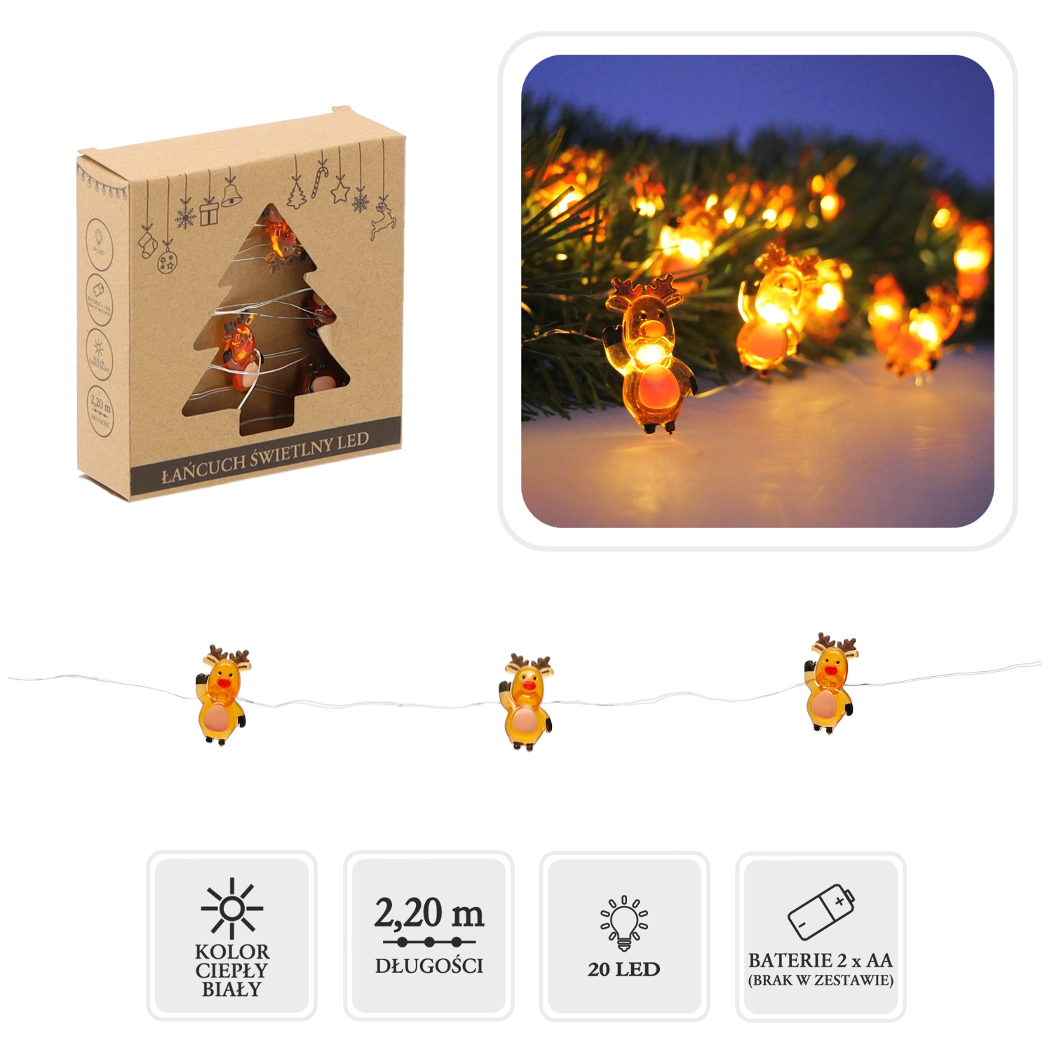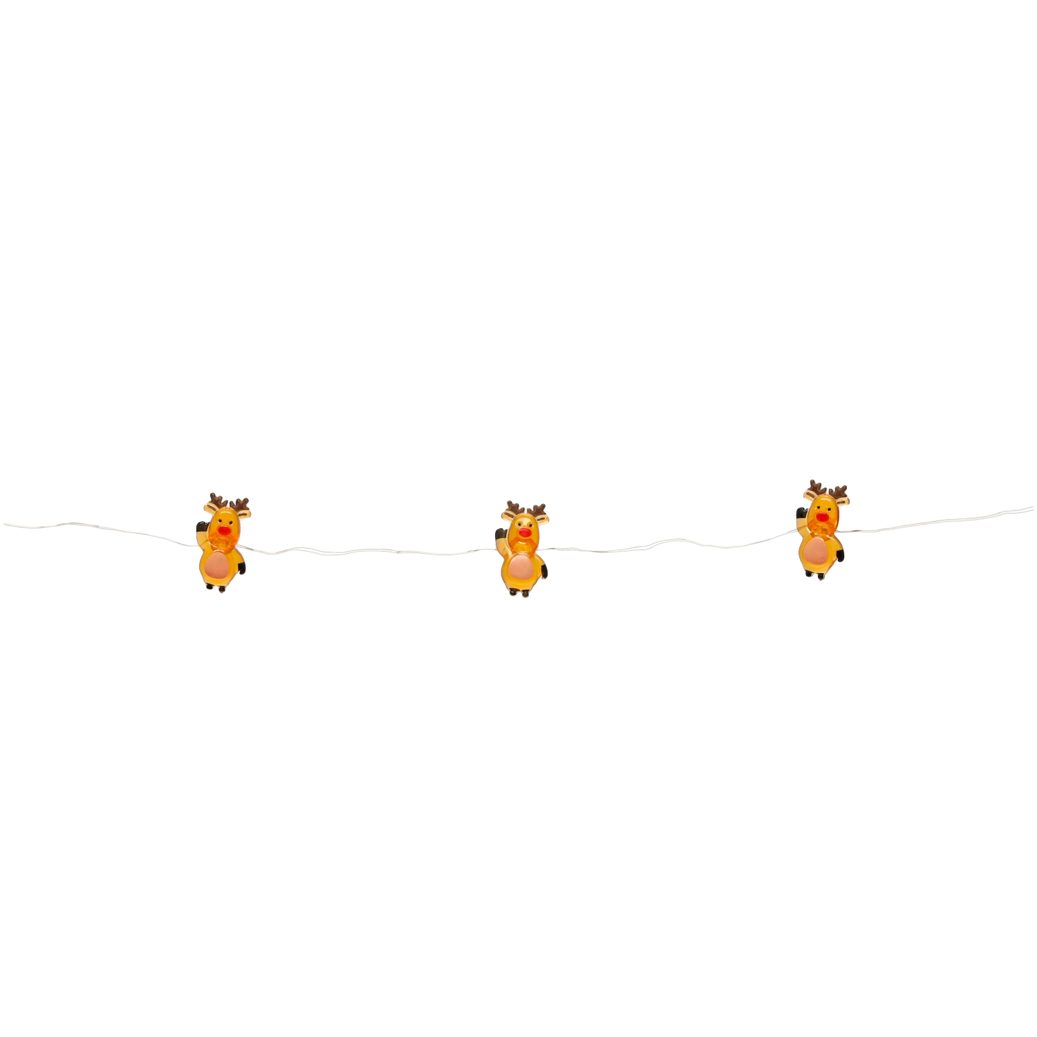 Breng de magie van Kerst in huis met een lichtsnoer met schattige herten. 20 warme LED’s zorgen voor een gezellige sfeer, de flexibele draad wikkel je eenvoudig rond decoraties en dankzij de 2× AA-batterijvoeding plaats je het snoer zonder kabels. Ideaal voor het raam, de schouw, een krans of de kinderkamer.