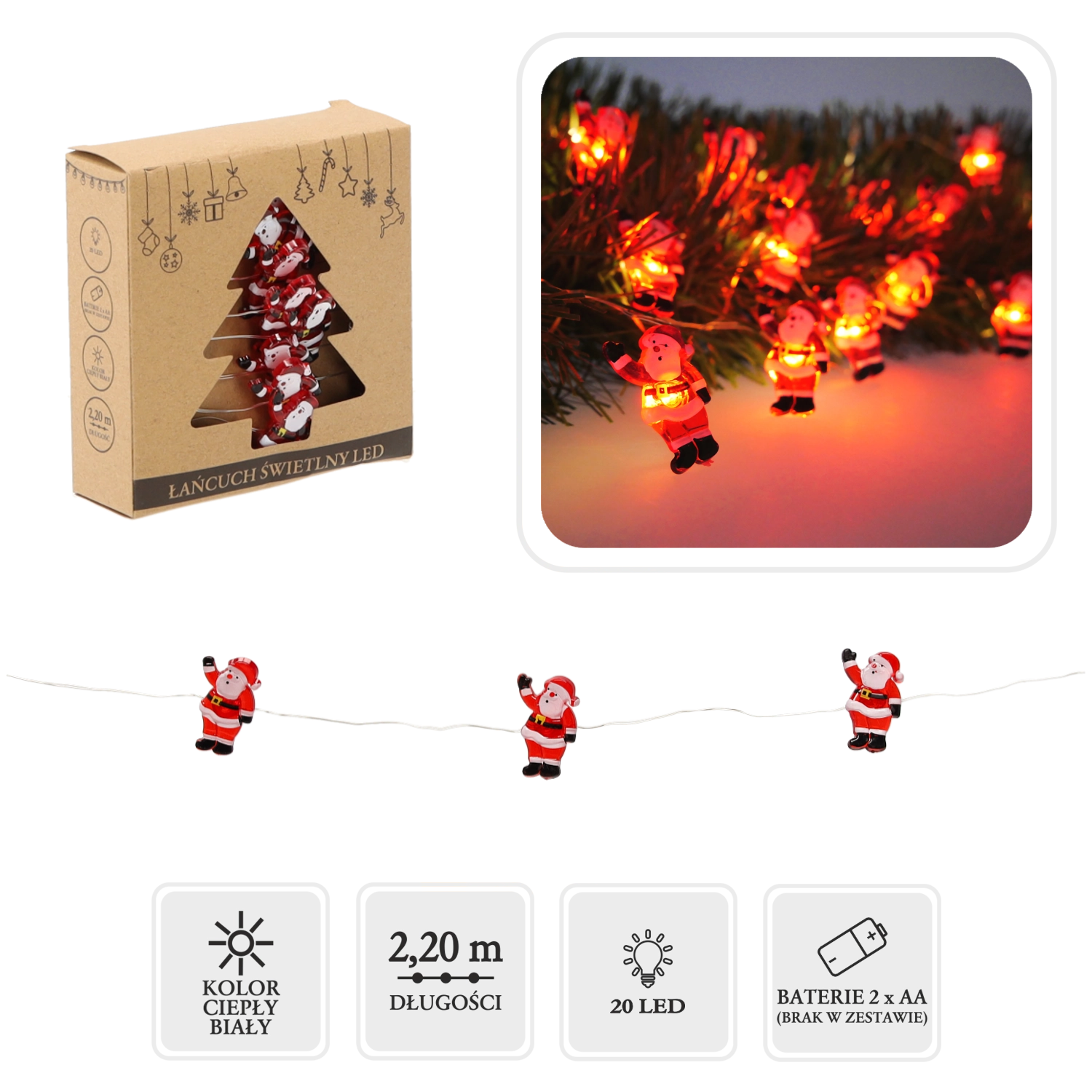 De kerstlichteketting met SANTA is een speelse decoratie die direct een rustige, warme sfeer in je interieur brengt. Elke LED is voorzien van een schattig motief van de Kerstman, dat prachtig staat in de kerstboom, op de schouw of in de kinderkamer.