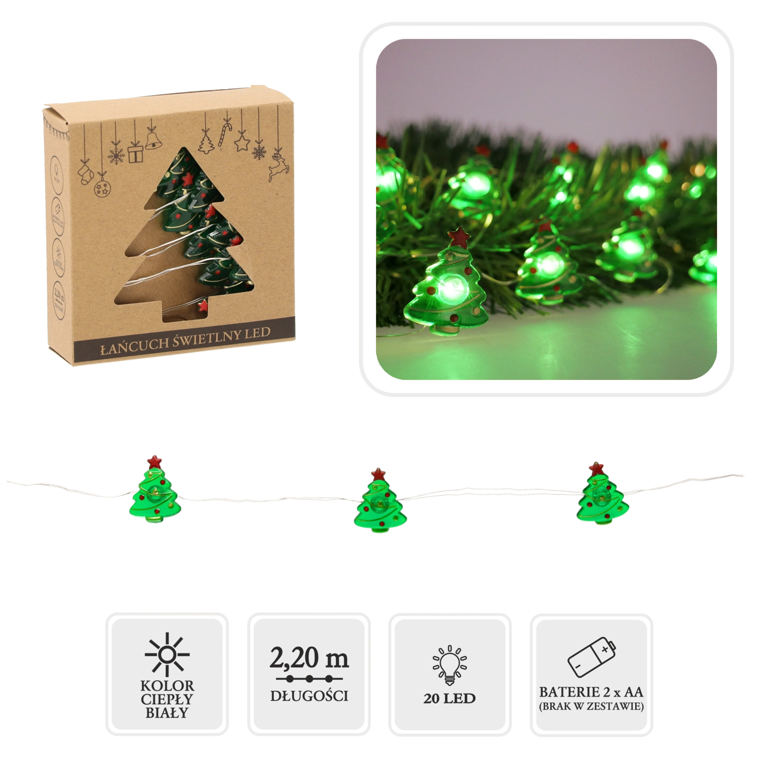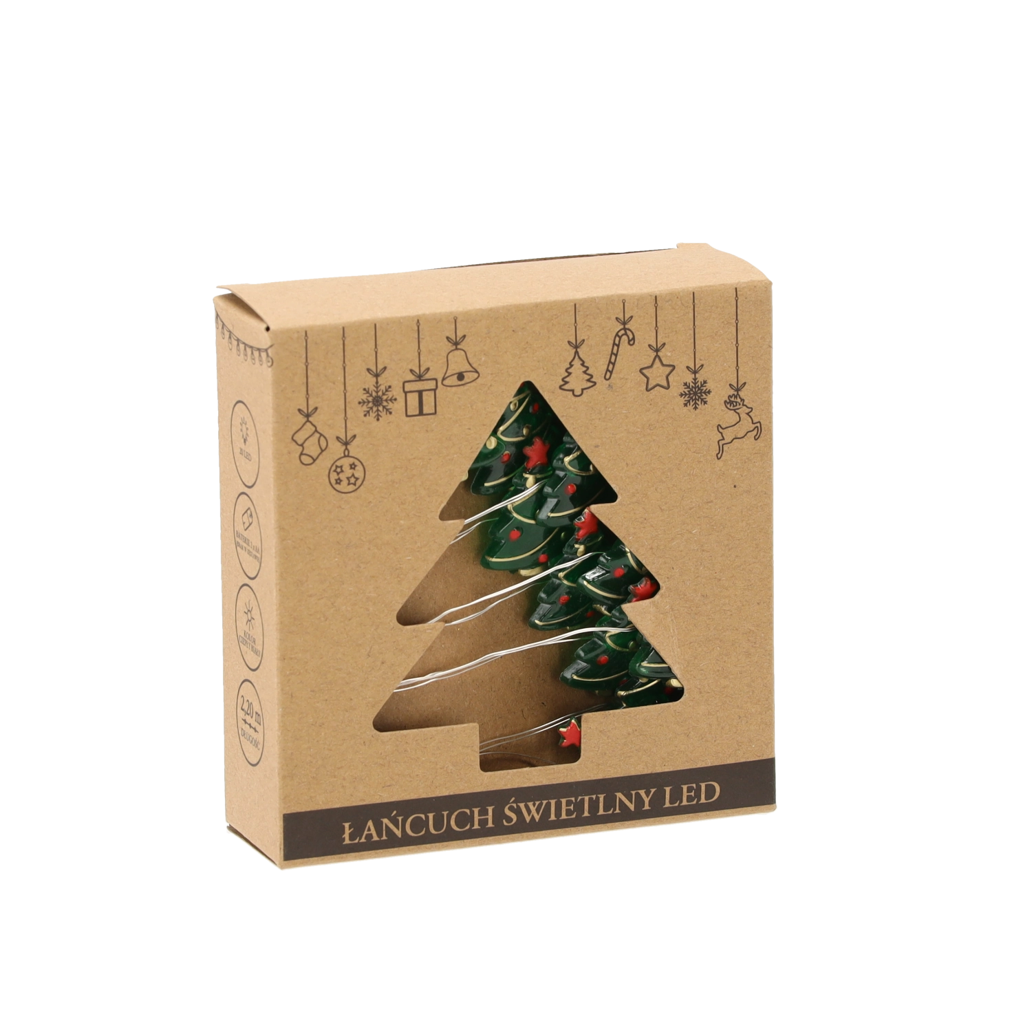 Creëer thuis een magische kerstsfeer met dit LED-lichtsnoer met kerstboompjes. 20 warmwitte LED’s laten planken, ramen en dressoirs stralen, en dankzij de voeding op 2× AA-batterijen plaats je het overal zonder snoeren. Een lichte decoratie met een zachte gloed voor een knusse, feestelijke uitstraling van je interieur.