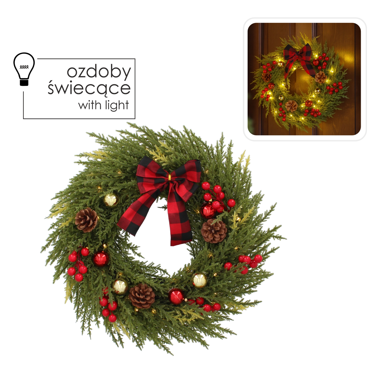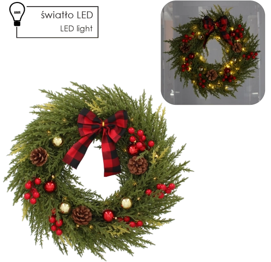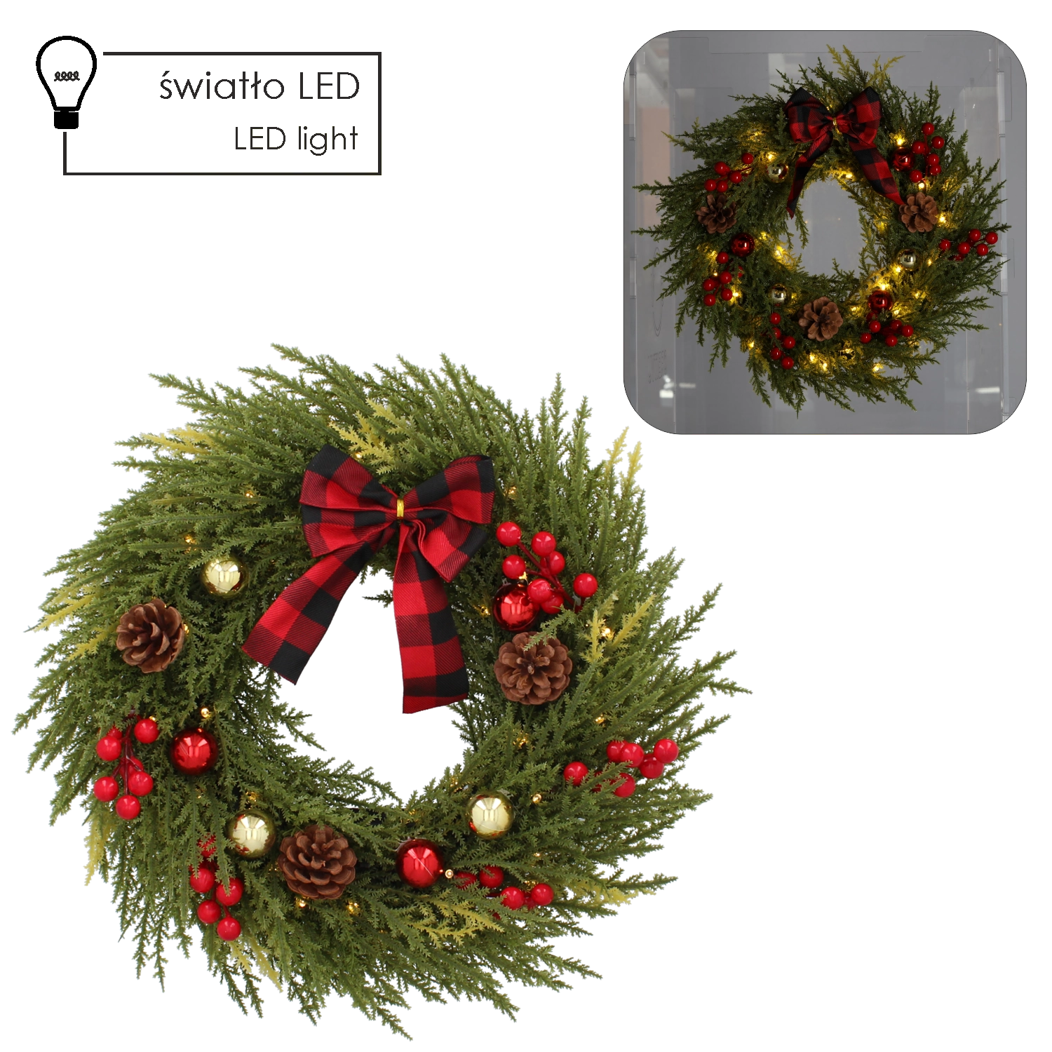 De elegante kerst LED-krans brengt een huiselijke sfeer met warmwit licht en een volle, realistische dennentak-look, aangevuld met decoratieve elementen zoals bessen, dennenappels en een stijlvolle geruite strik. Dankzij de voeding op 3× AA-batterijen hang je hem eenvoudig aan deur, muur of raam zonder zichtbare kabels.
