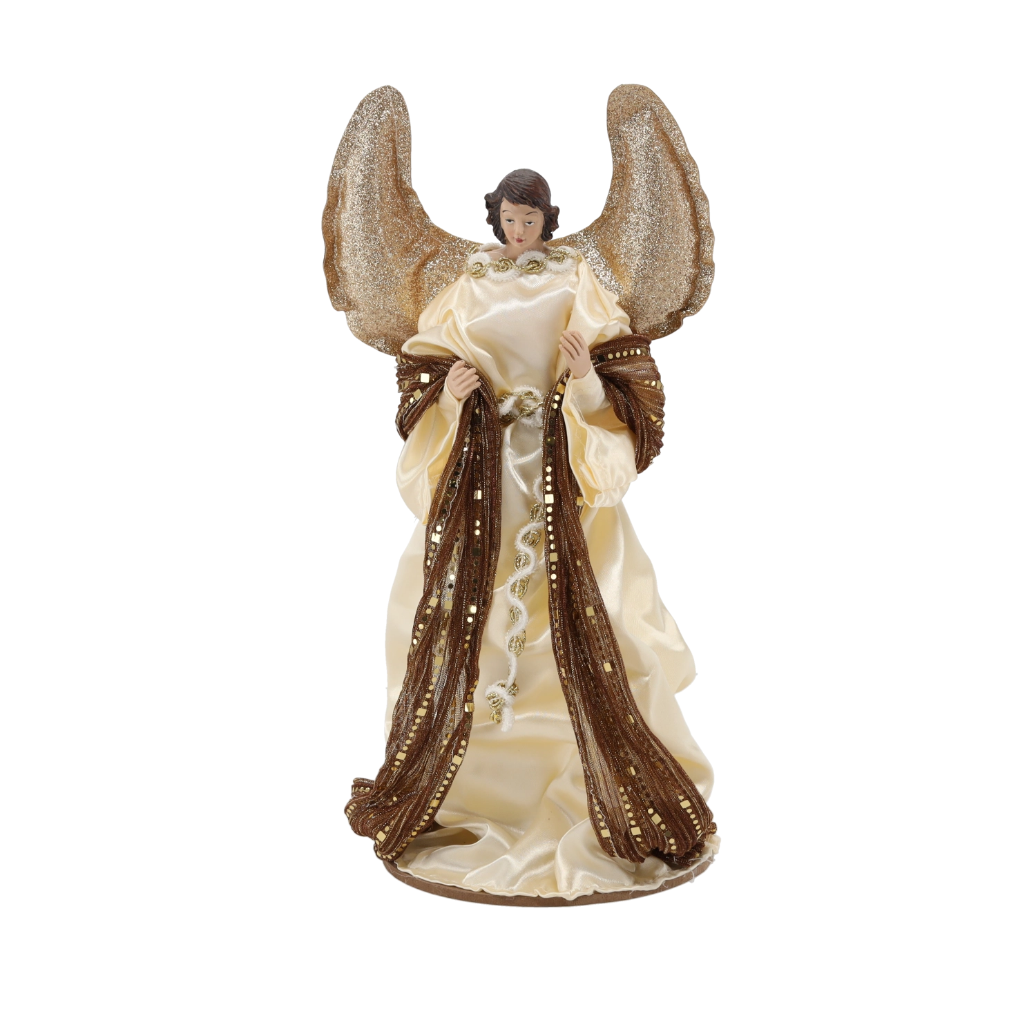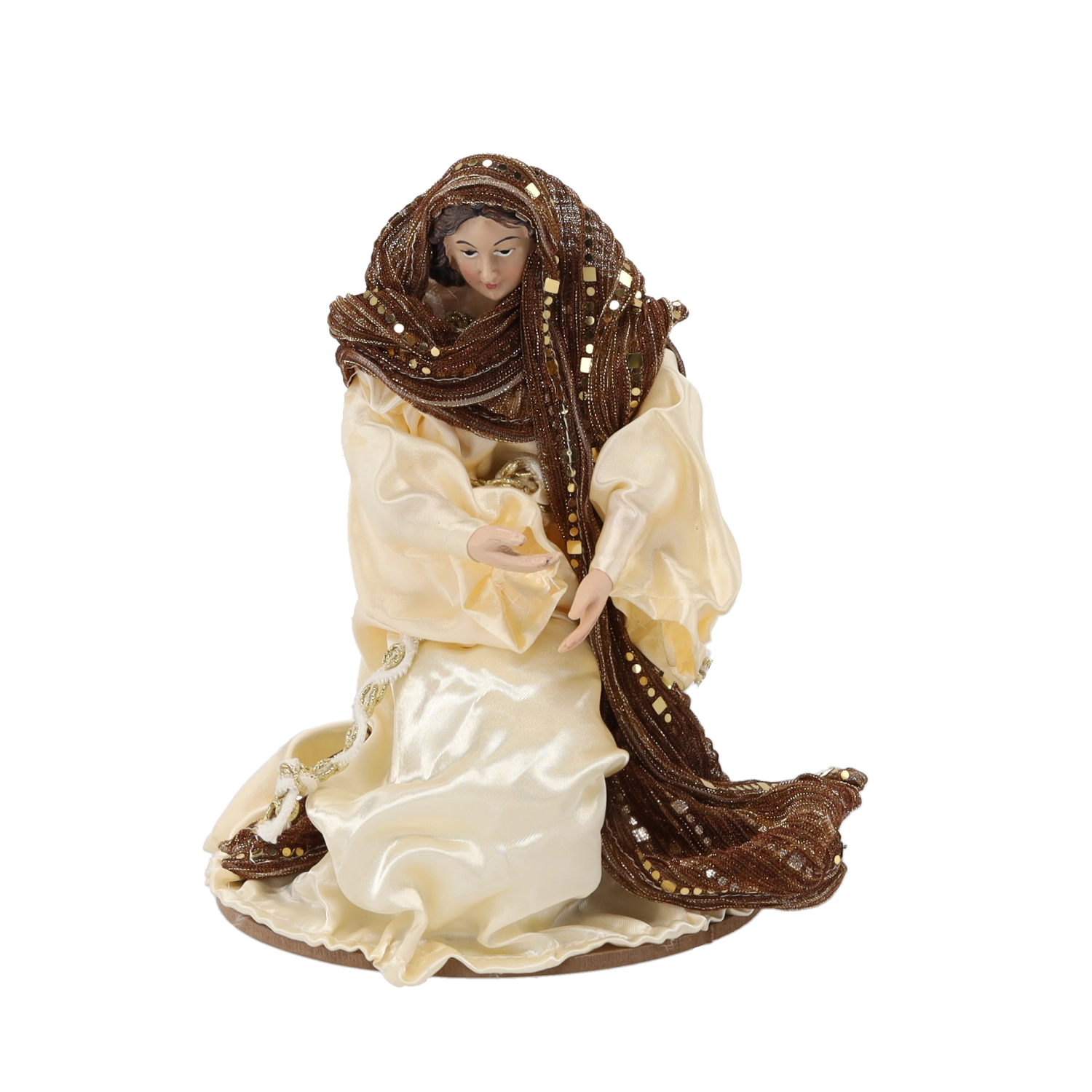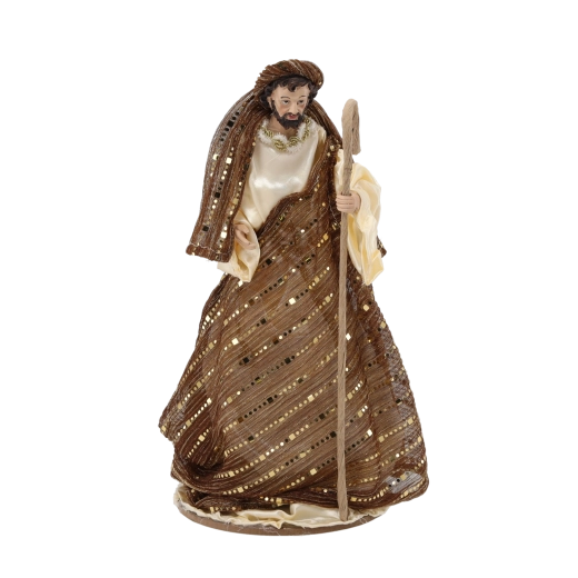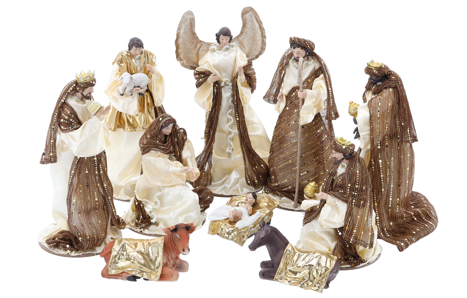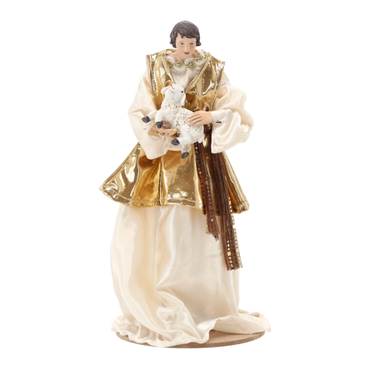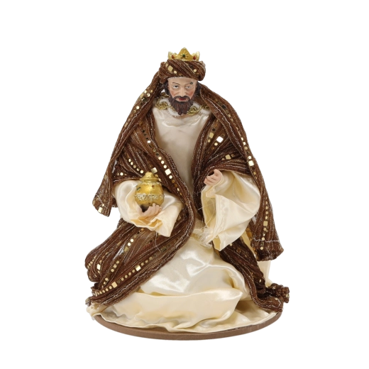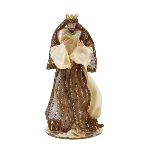 Deze representatieve kerststalset omvat de Heilige Familie, een engel, de drie koningen, een herder en twee dieren. De figuren in crème- en bruintinten met gouden details ogen elegant en tijdloos en passen daardoor perfect in zowel klassieke als moderne interieurs. Het harsmateriaal zorgt voor een lange levensduur en stabiliteit.
