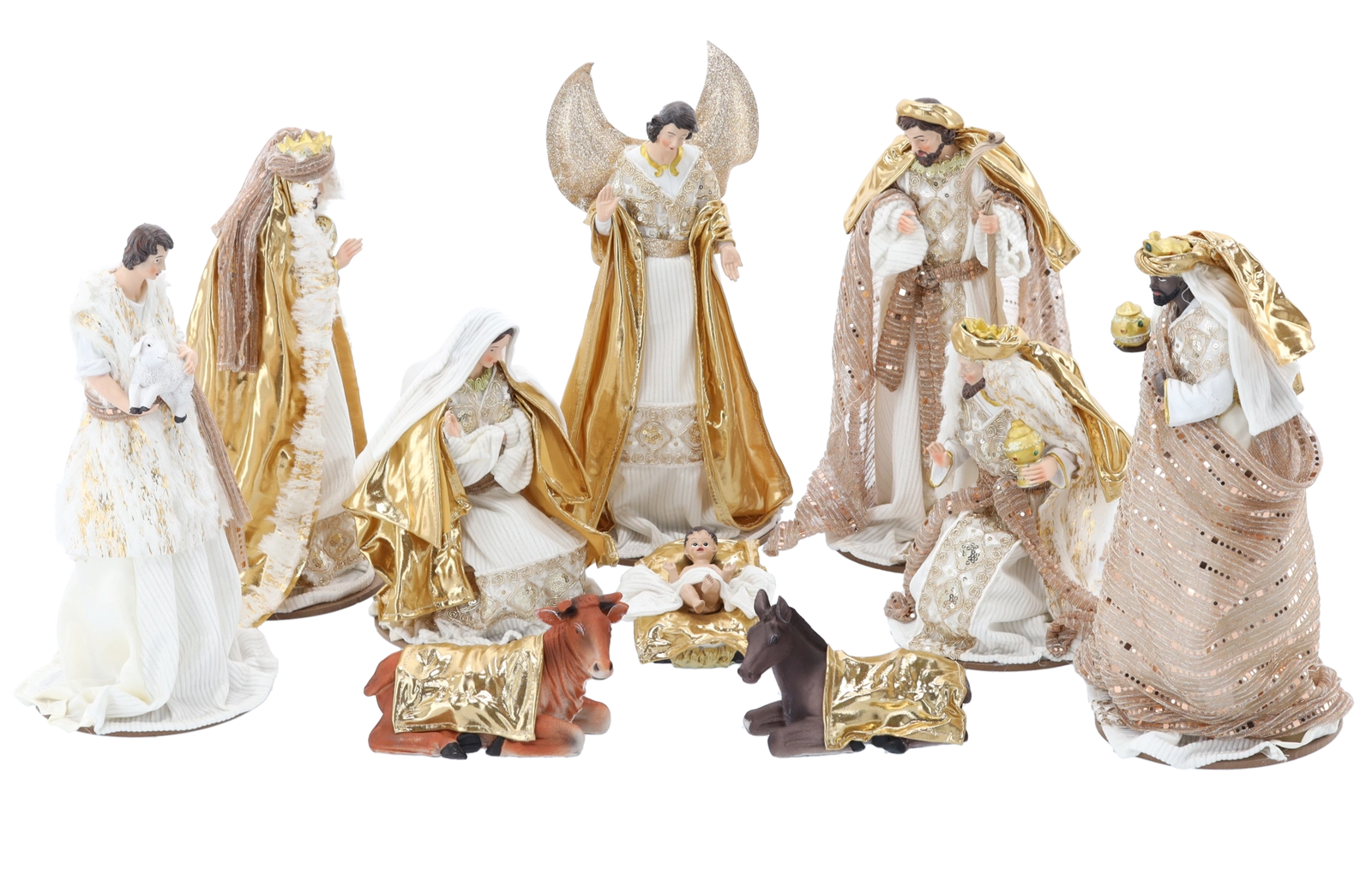 De Heilige Familie, een engel, de Drie Koningen, een herder en dieren vormen een samenhangend en harmonieus geheel dat klaar is om direct tentoon te stellen.