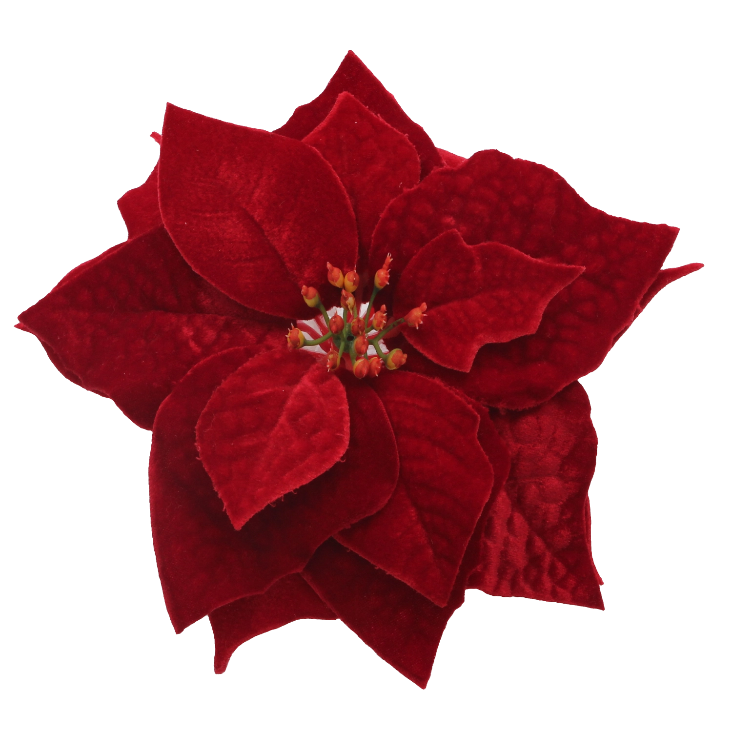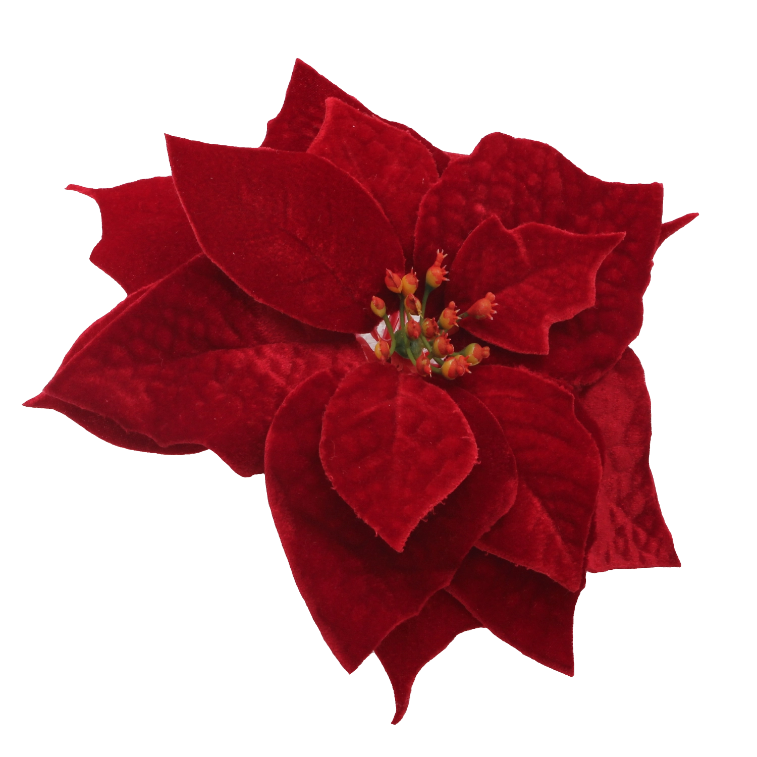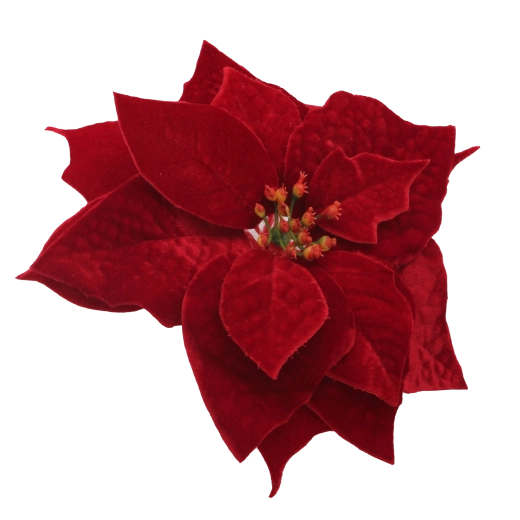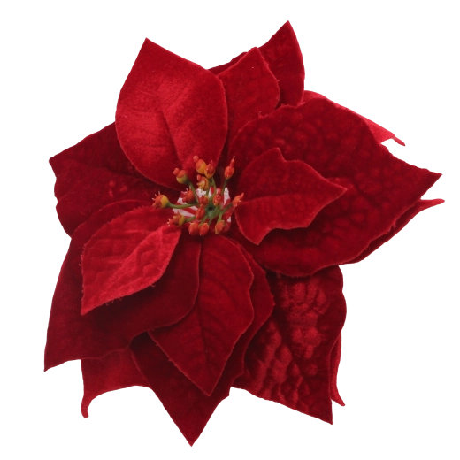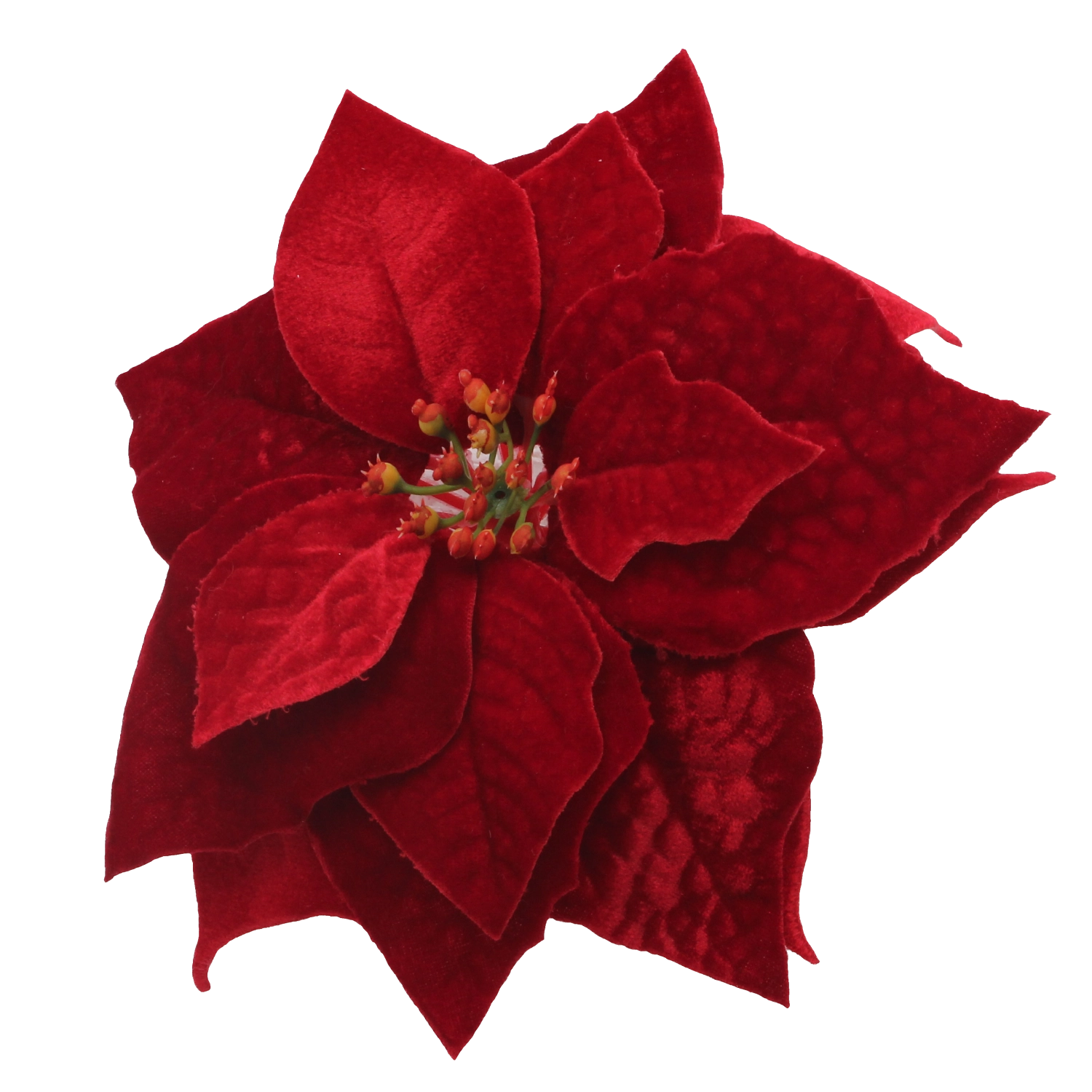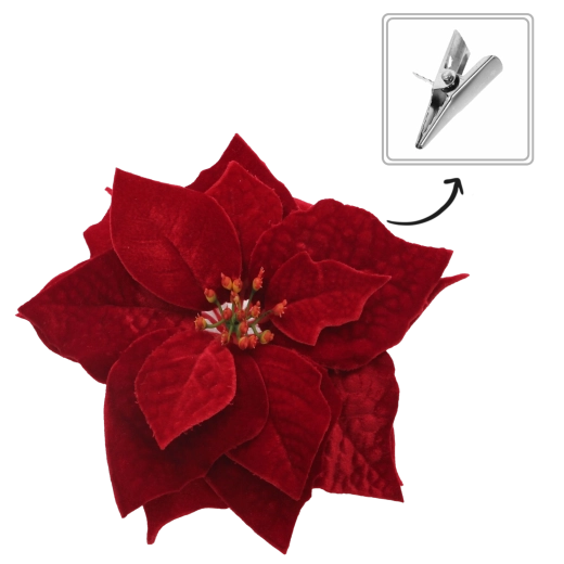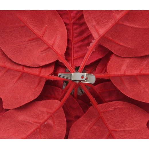 Dankzij de metalen clip bevestig je de bloem eenvoudig en veilig aan takjes, strikken en decoratieve bases zonder extra hulpmiddelen. De duurzame uitvoering garandeert stabiliteit en herhaald gebruik tijdens vele kersten.