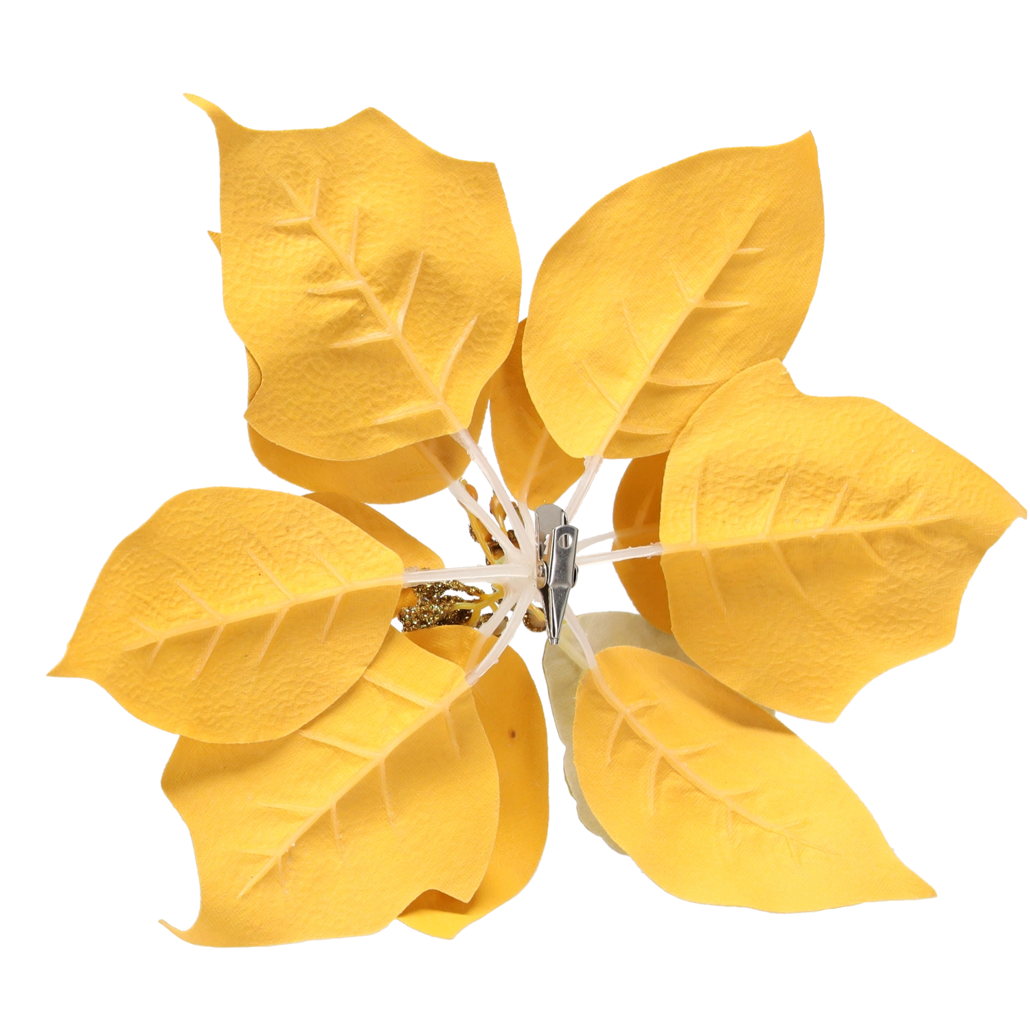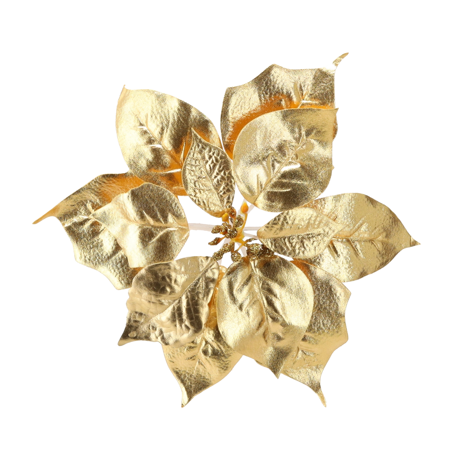 Elegante kunstmatige poinsettia met een diameter van 25 cm in een luxe gouden uitvoering geeft je interieur een feestelijke glans en stijl. Dankzij de praktische clip bevestig je haar eenvoudig aan de kerstboom, kransen, guirlandes of cadeaus. Hoogwaardig materiaal met fijne brokaatversiering garandeert duurzaamheid en een realistische uitstraling zonder onderhoud.
