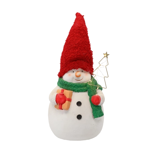 Schattige kerstfiguur van een sneeuwman met een stijlvolle rode muts en subtiele LED-verlichting die elke tafel of plank laat stralen. Dankzij de gedetailleerde afwerking, vrolijke kleuren en directe werking op batterijen creëert hij een knusse, feestelijke sfeer thuis en op kantoor.