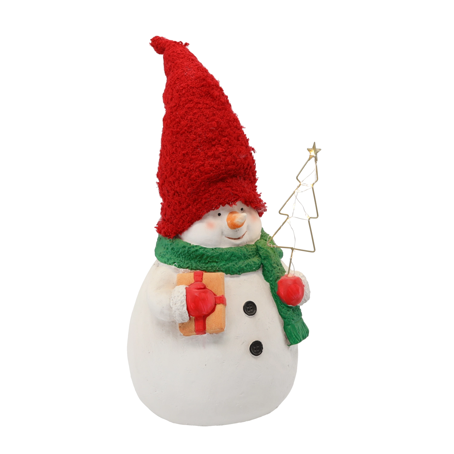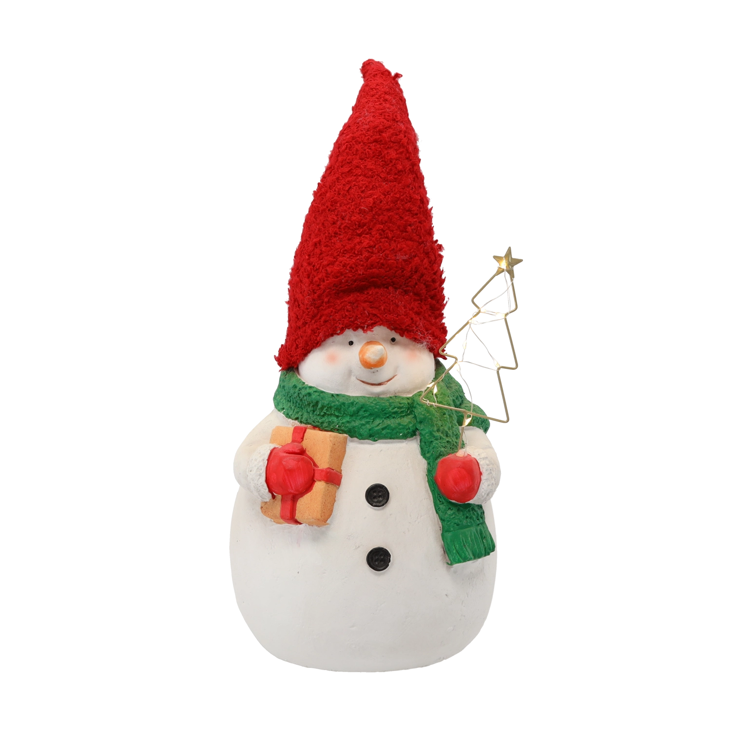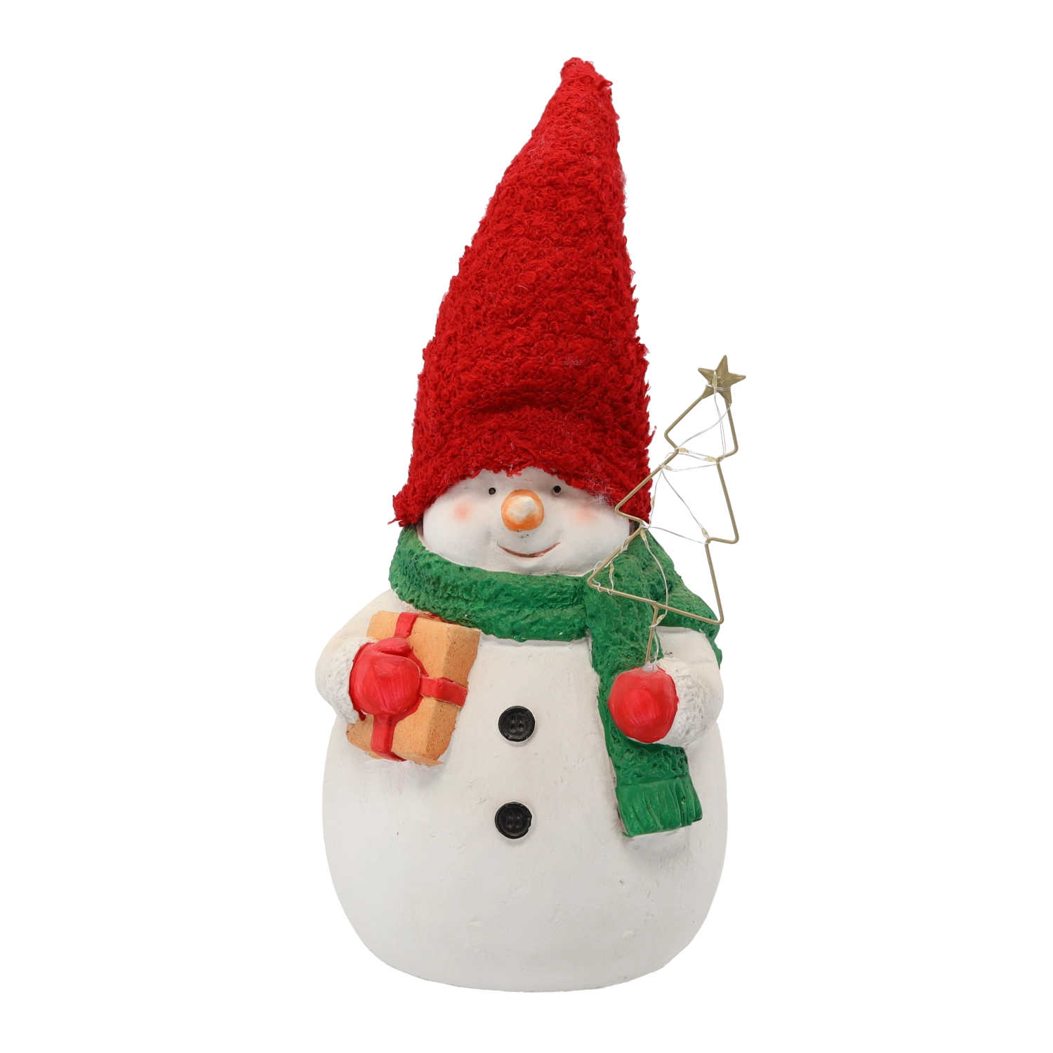 Deze decoratieve sneeuwman is een ideale keuze voor winter- en kerstdecoratie. De hoge rode muts, groene sjaal en kleine accessoires geven samen met de geïntegreerde LED-lichtjes je interieur een warme touch. De figuur is direct klaar voor gebruik na het uitpakken – 2× LR44 zijn inbegrepen.