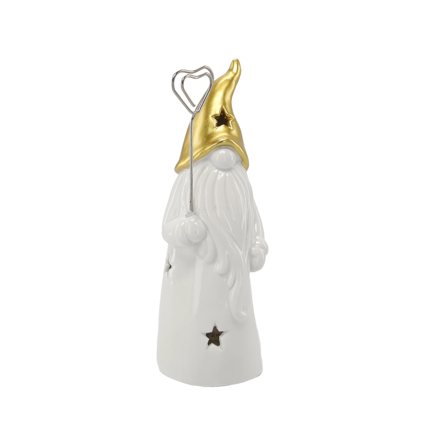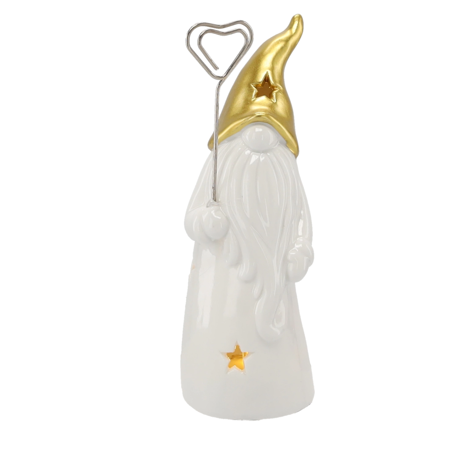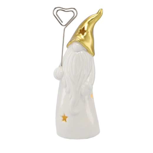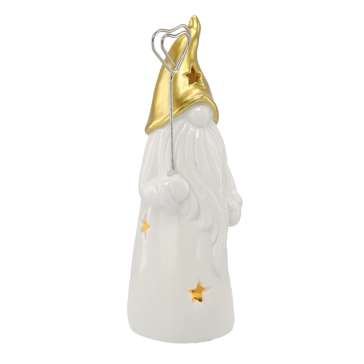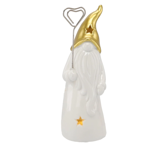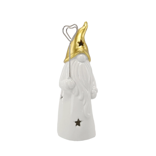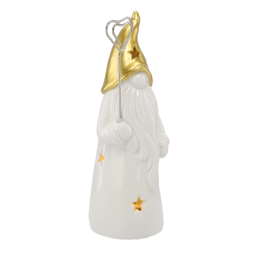 Stijlvol keramisch kabouterbeeldje met LED-verlichting dat je huis vult met warm licht. Het glanzende witte lichaam met stervormige uitsparingen en een gouden spitse muts zorgt voor een magische sfeer, ideaal voor op een plank, tafel of vensterbank. Inclusief 2 LR44-batterijen voor direct gebruik.