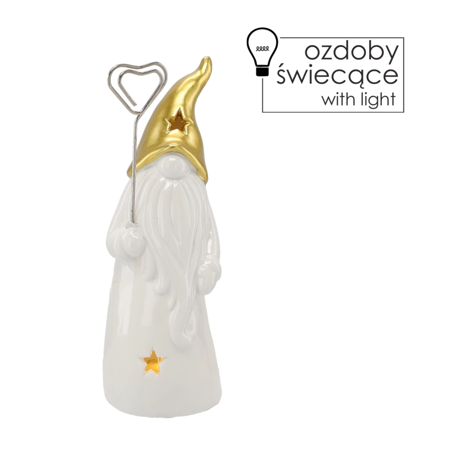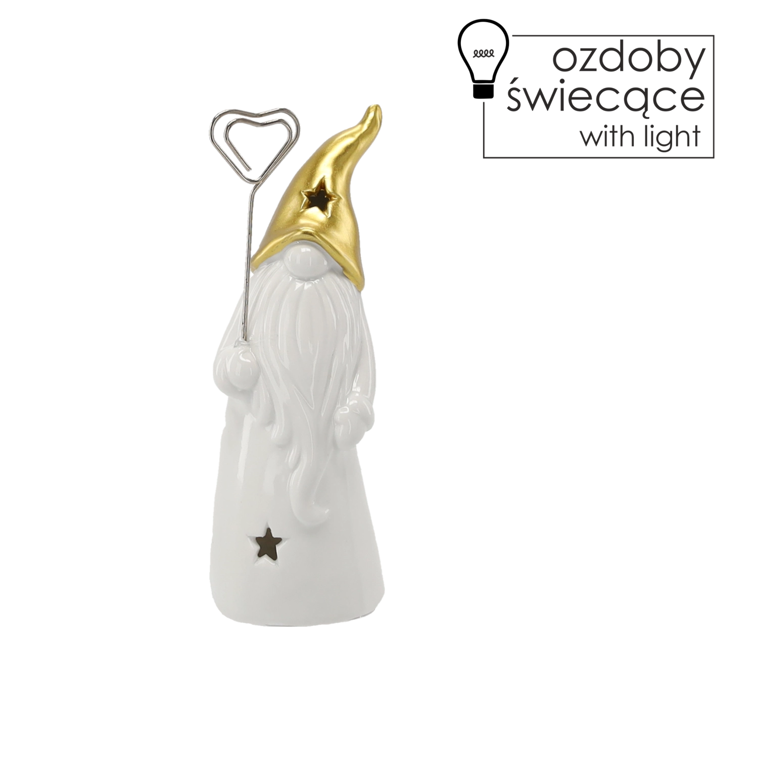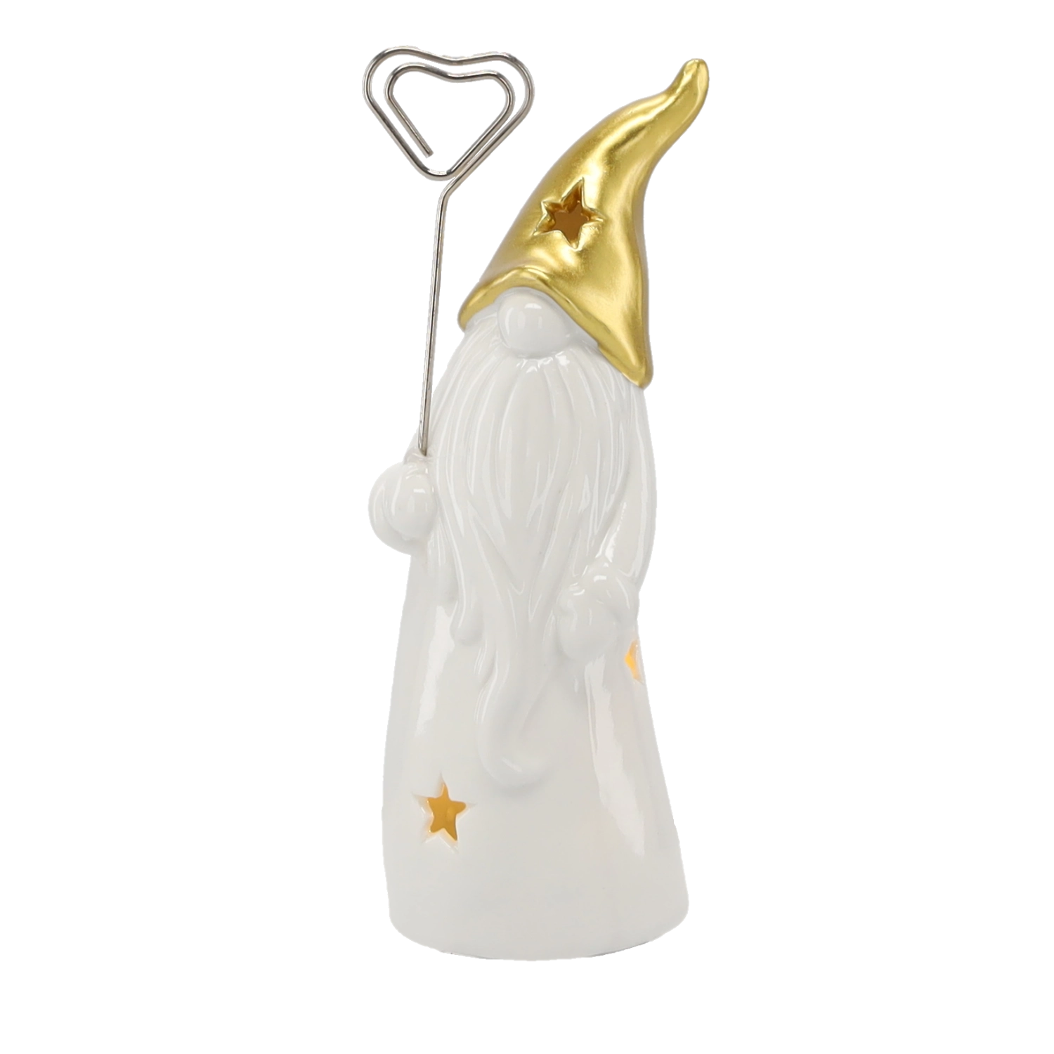 Stijlvol keramisch kabouterbeeldje met LED-verlichting dat je huis vult met warm licht. Het glanzende witte lichaam met stervormige uitsparingen en een gouden spitse muts zorgt voor een magische sfeer, ideaal voor op een plank, tafel of vensterbank. Inclusief 2 LR44-batterijen voor direct gebruik.