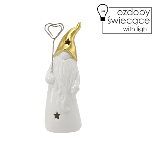Ontdek betoverende kerstdecoratie met dit keramische kabouterbeeldje, dat dankzij het geïntegreerde LED-licht zacht door de sterren in het lichaam en de muts schijnt. De combinatie van glanzend wit keramiek en metalisch goud voegt feestelijke elegantie toe aan je interieur.