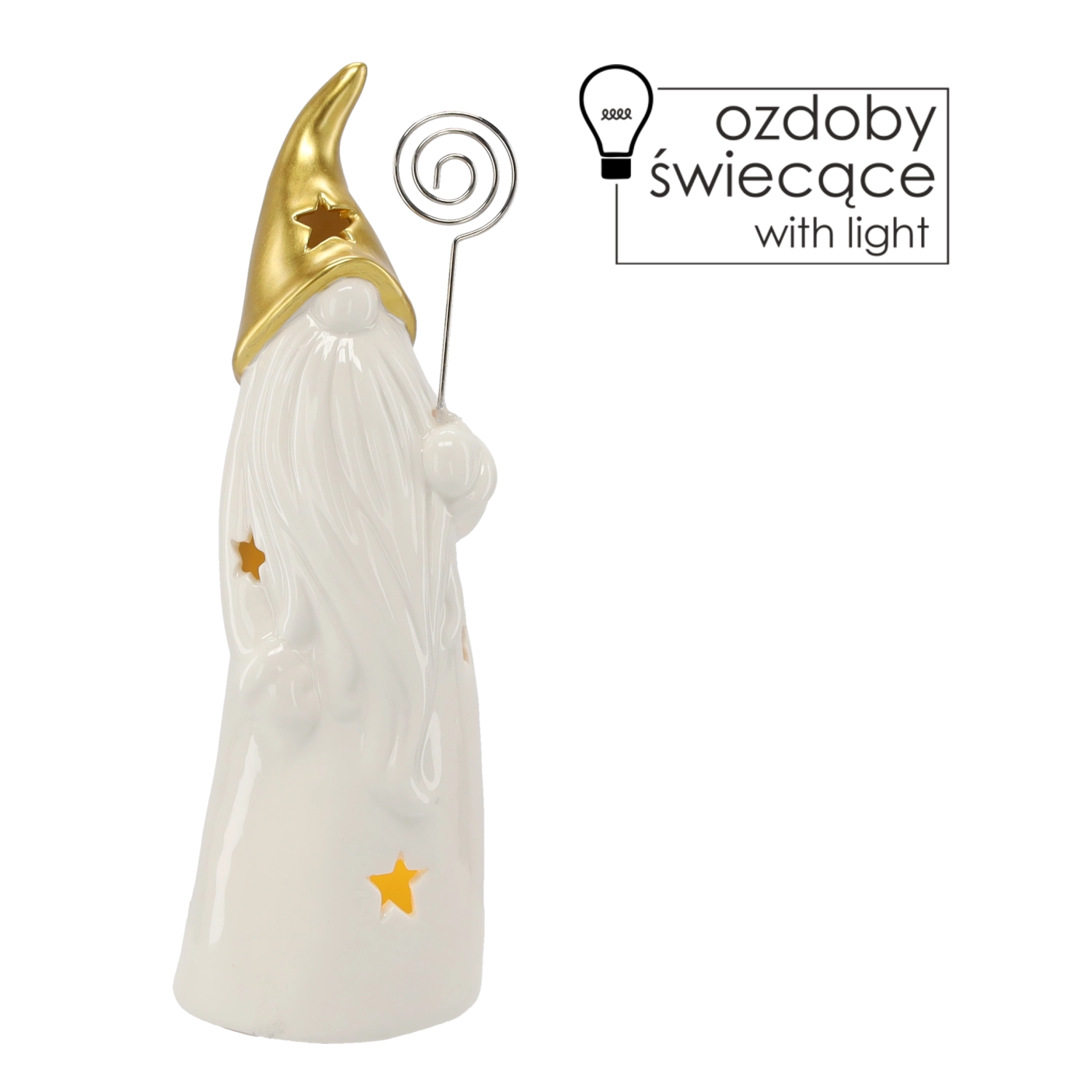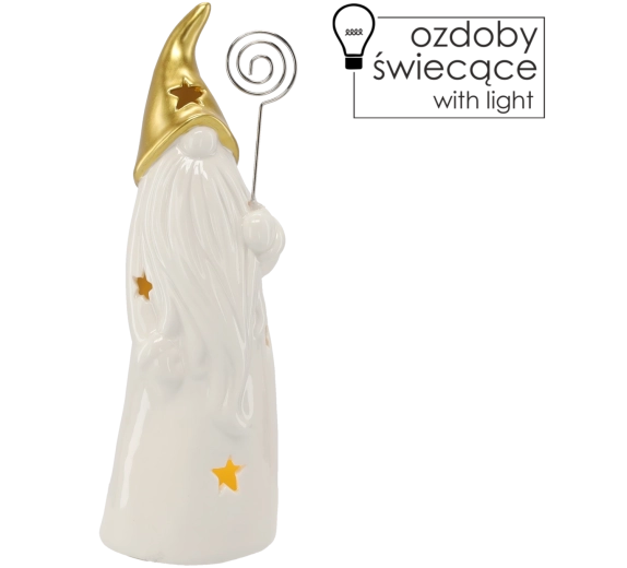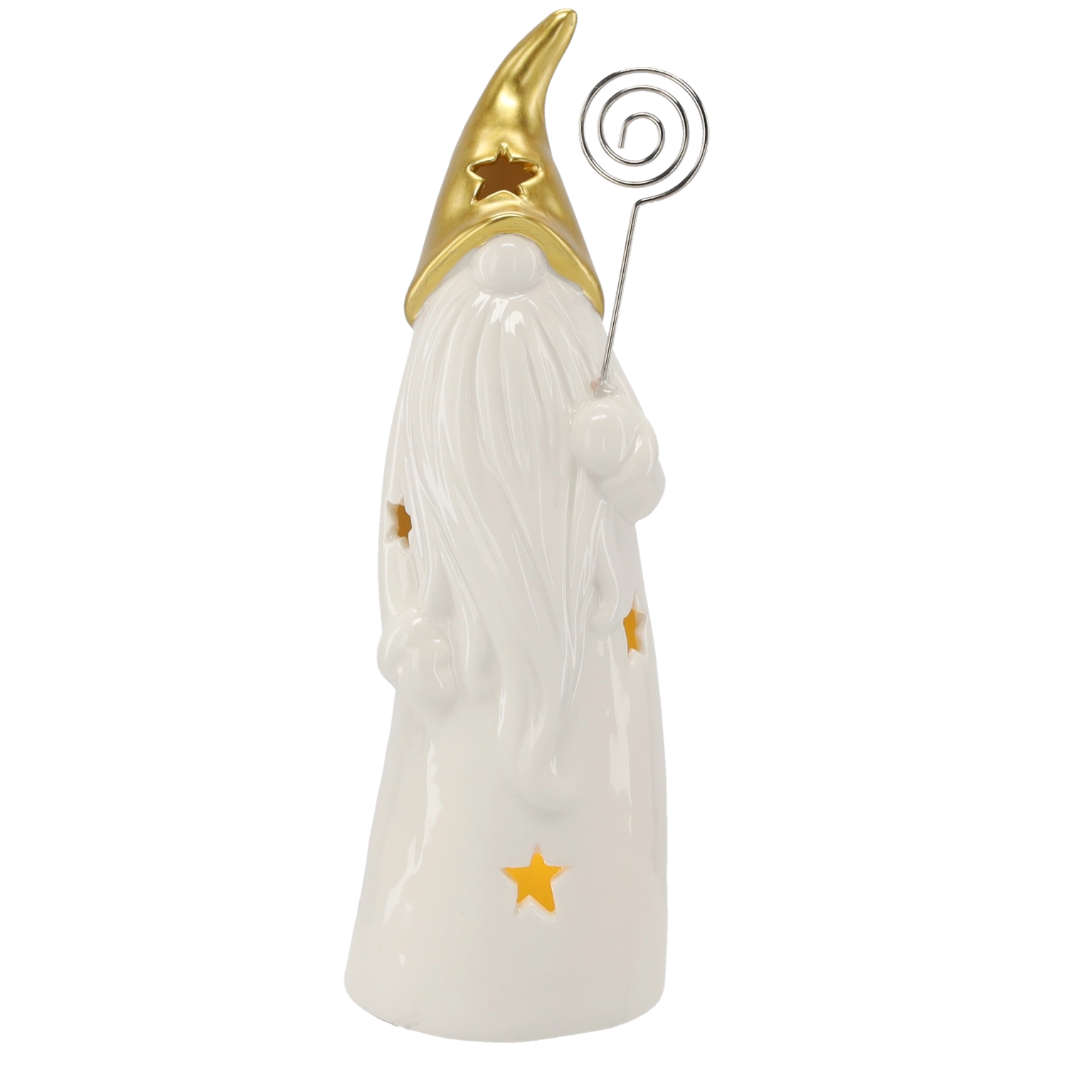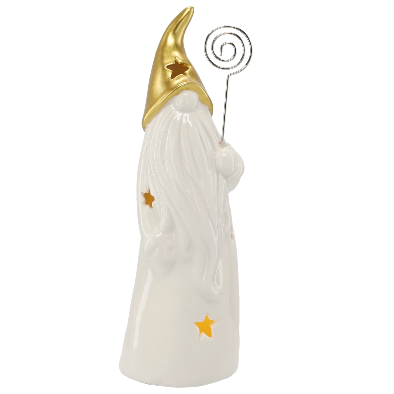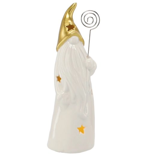 Decoratief keramisch beeldje van een tovenaar met een gouden puntmuts, lange witte baard en stervormige uitsparingen die bij verlichting een subtiele, sfeervolle gloed creëren. Voorzien van LED-verlichting op batterijen (meegeleverd), ideaal als kerst- én jaarronde decoratie voor tafel, dressoir of vensterbank.