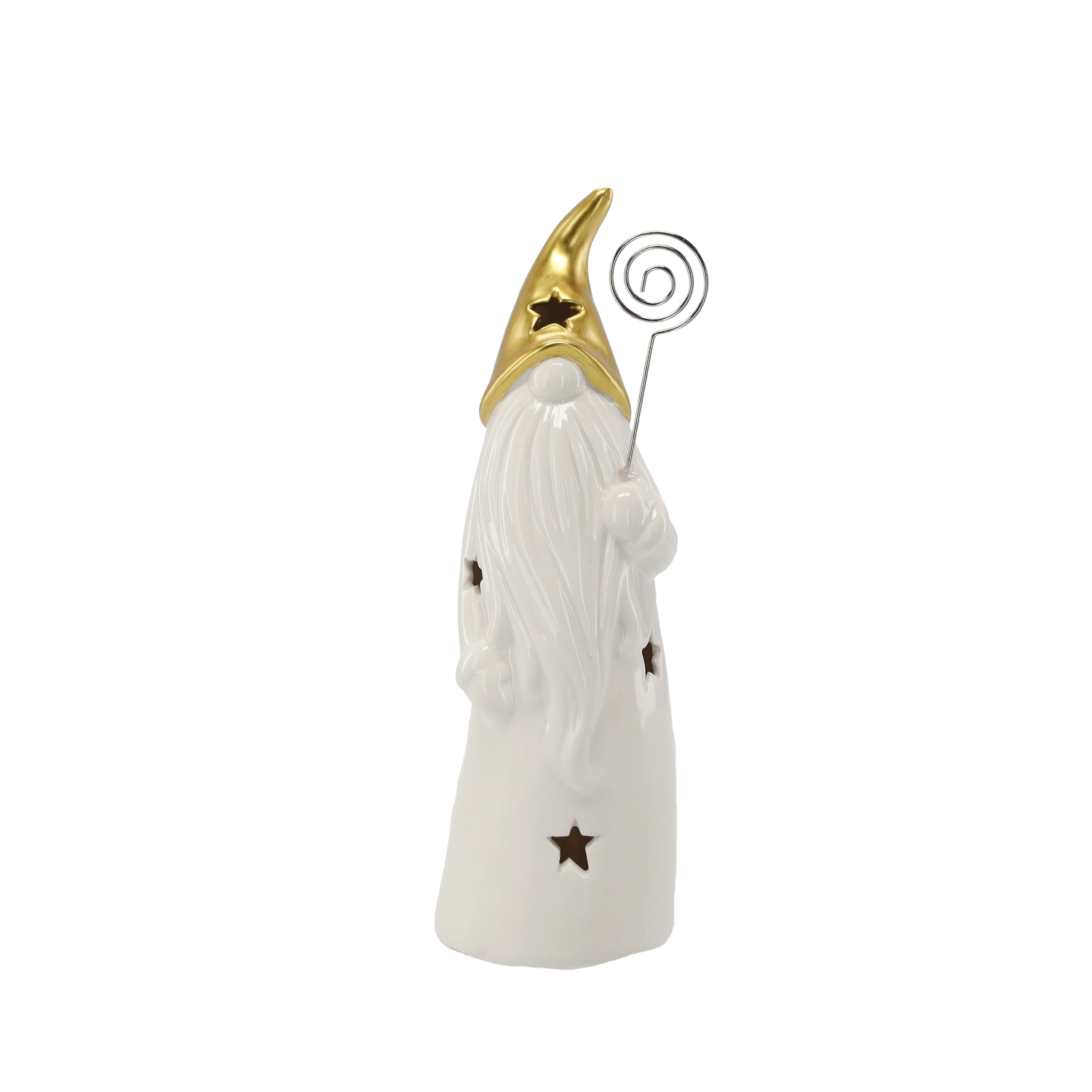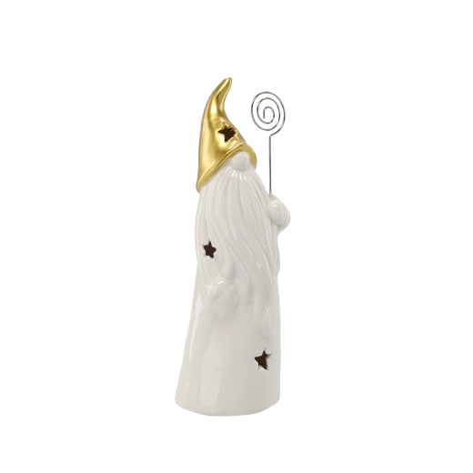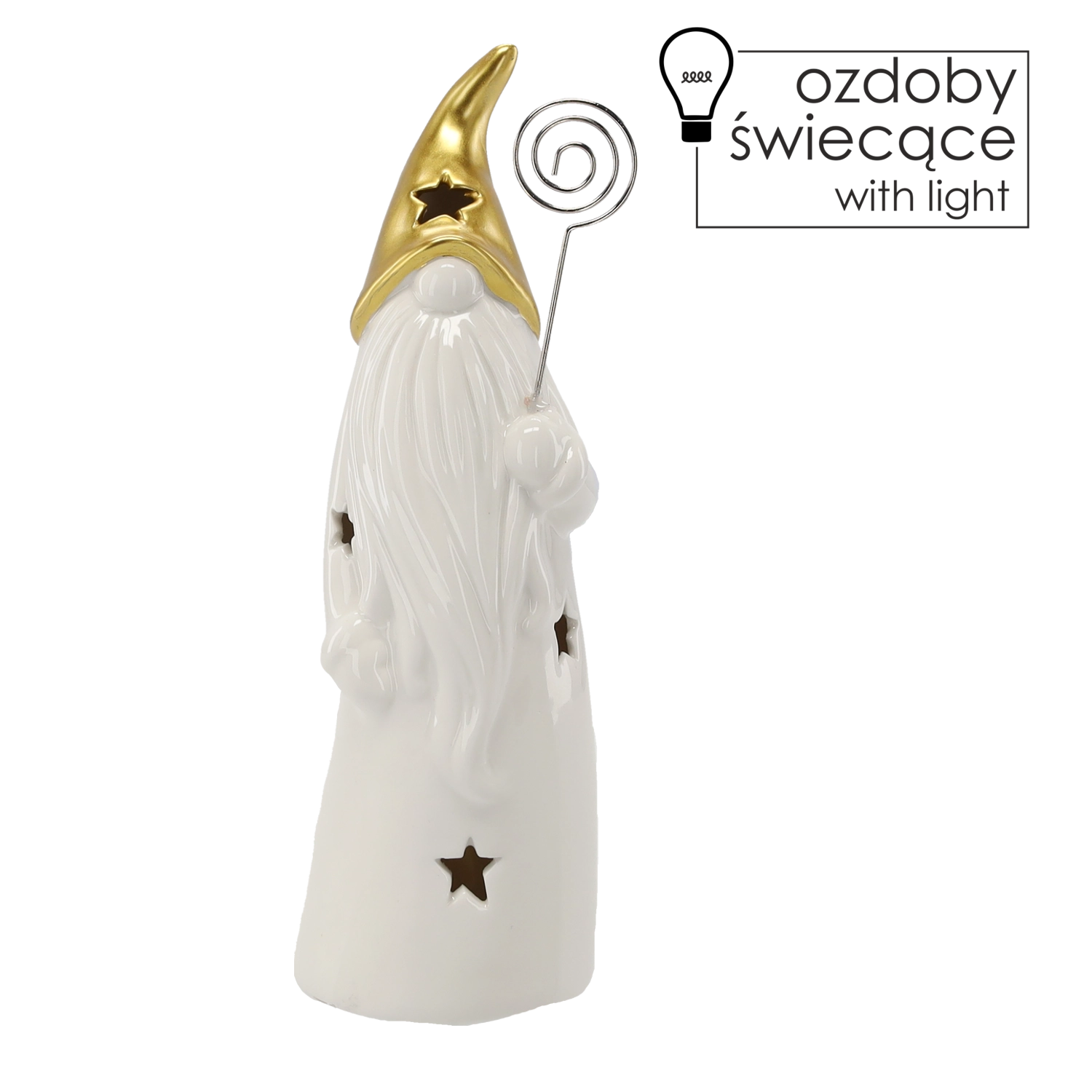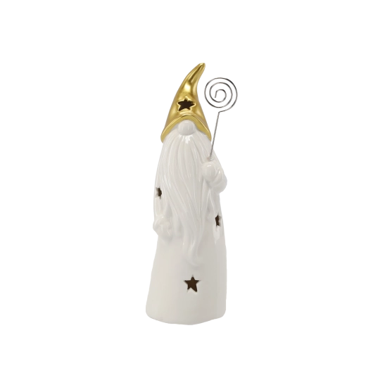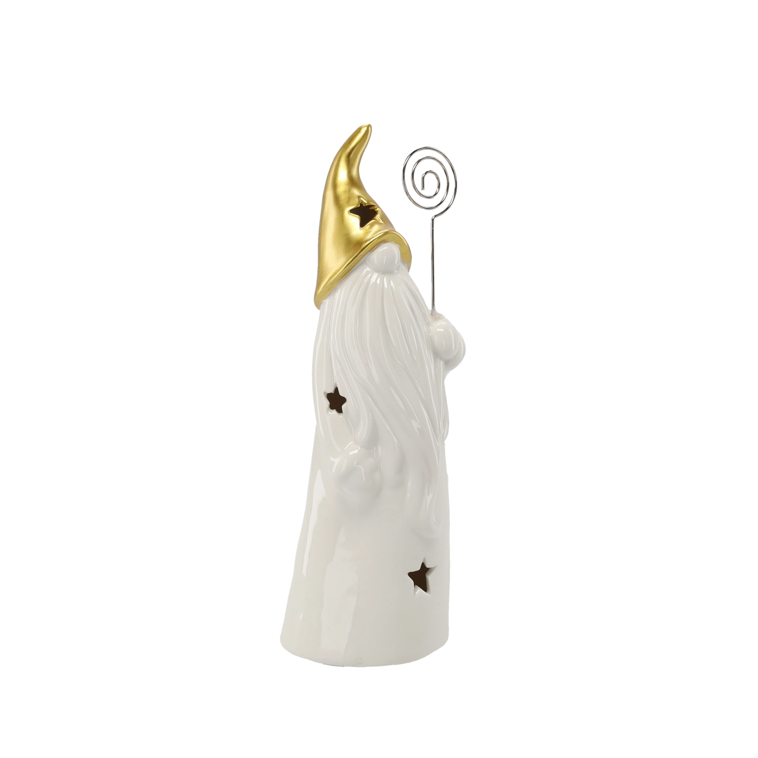 Decoratief keramisch beeldje van een tovenaar met een gouden puntmuts, lange witte baard en stervormige uitsparingen die bij verlichting een subtiele, sfeervolle gloed creëren. Voorzien van LED-verlichting op batterijen (meegeleverd), ideaal als kerst- én jaarronde decoratie voor tafel, dressoir of vensterbank.