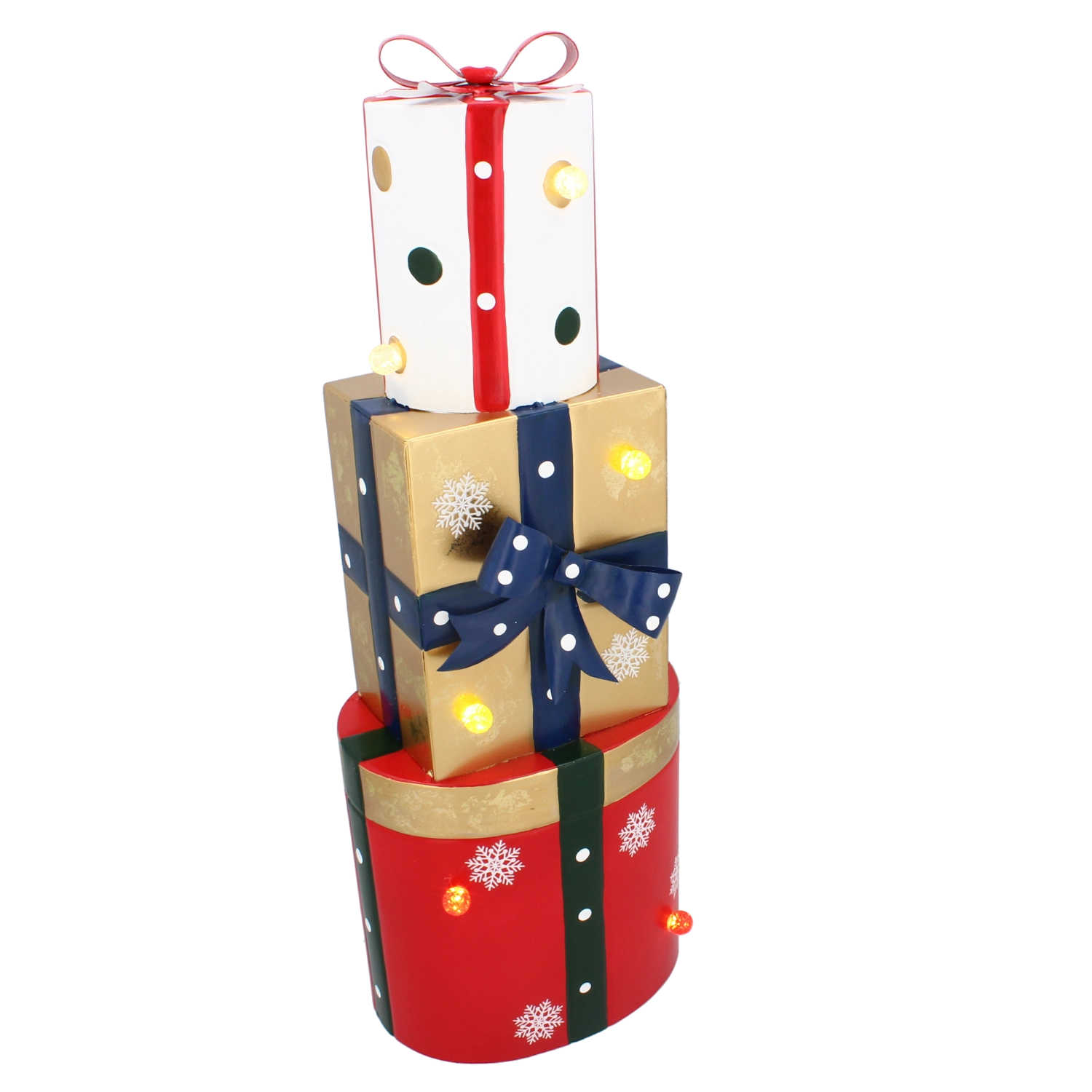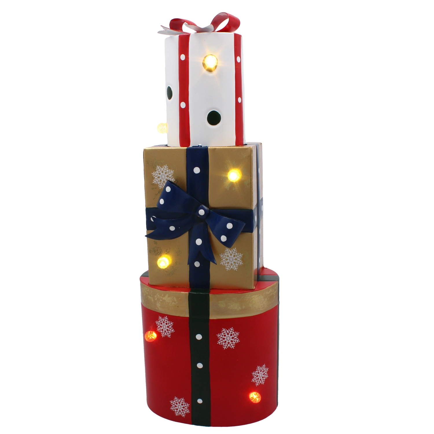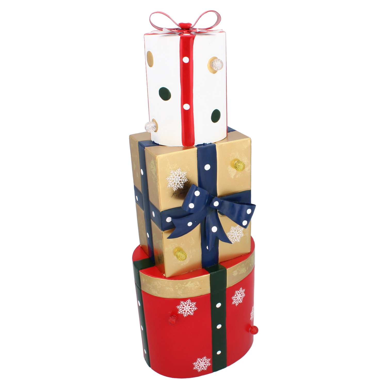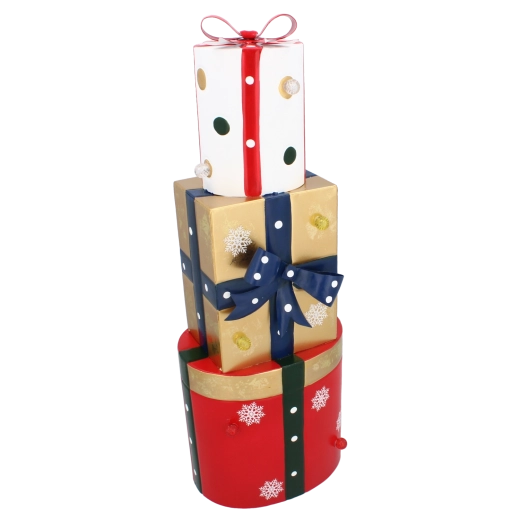 Deze stijlvolle metalen decoratie in de vorm van drie gestapelde cadeaus in rood, goud en wit is voorzien van warmwitte LED’s die voor prettig, zacht licht zorgen. De combinatie van hoogwaardige metalen afwerking en subtiele verlichting oogt modern en tegelijk knus – ideaal voor feestelijke thuisdecoratie.