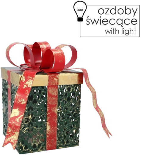 Breng een betoverende feestelijke sfeer in je interieur met een elegante cadeauvormige decoratie van duurzaam metaal. Stijlvolle verlichting in warm wit en een rode strik geven je huis een gezellig licht en een feestelijke uitstraling. De compacte afmetingen 15 × 12 × 20 cm passen op een tafel, dressoir of onder de kerstboom.