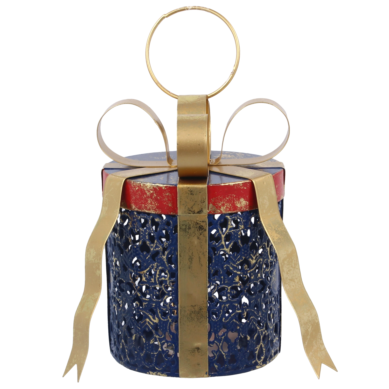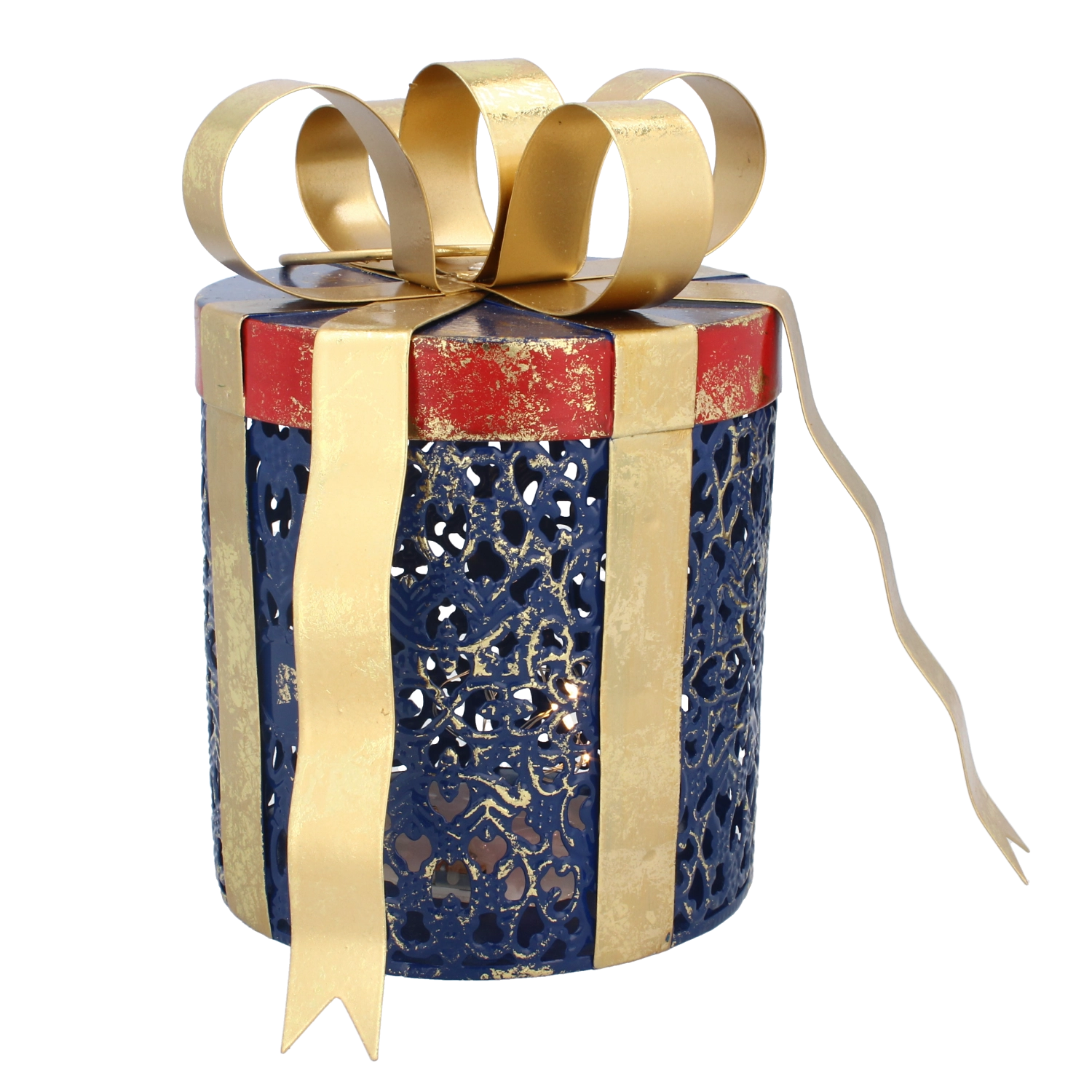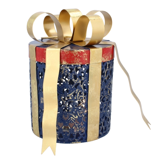 Deze stijlvolle kerstdecoratie in de vorm van een ronde cadeauverpakking zorgt direct voor een knusse, feestelijke ambiance. Het zachte warme licht van de LED’s schijnt door de decoratieve perforaties en geeft je interieur een aangename gloed en visuele diepte. De combinatie van blauw metaal en een gouden strik past perfect bij zowel traditionele als moderne arrangementen.