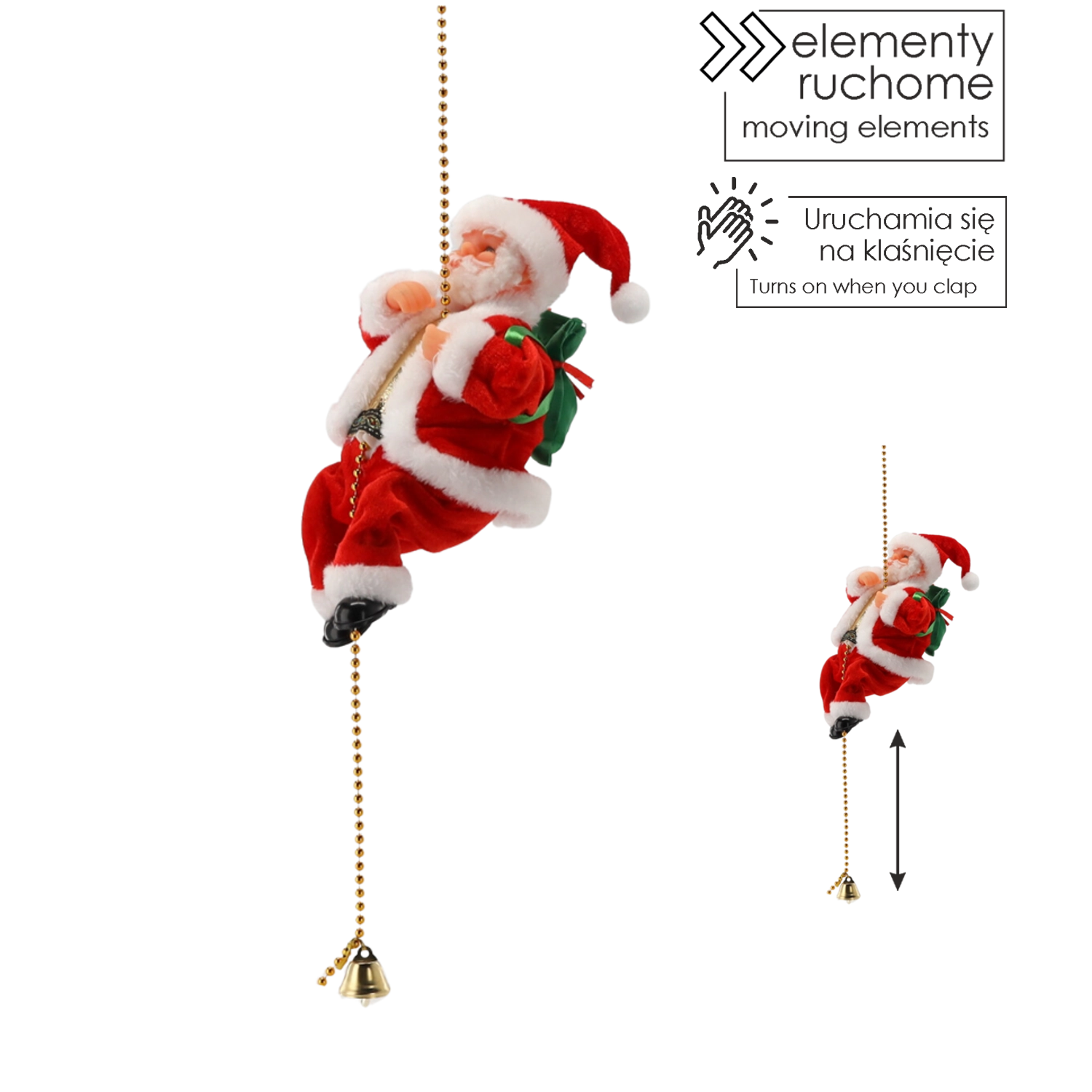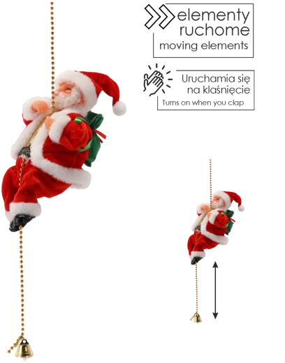 Breng je huis in kerstsfeer met deze bewegende Kerstman die “klimt” aan een gouden kettinkje met belletje. Het figuurtje in klassieke rode jas met witte rand en groene zak met cadeaus biedt indrukwekkende op-en-neer beweging, textiele afwerking met oog voor detail en eenvoudig ophangen als feestelijke decoratie in de woonkamer, kinderkamer of etalage.