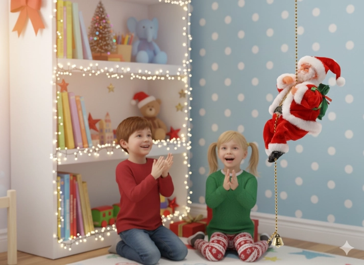 De Kerstman “klimt” langs een gouden kettinkje en zorgt voor een levendige kerstsfeer in elk interieur – van woonkamer tot kinderkamer.