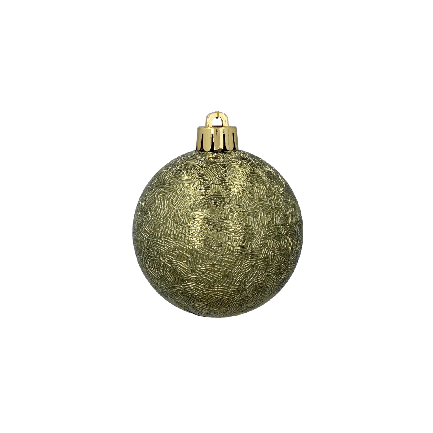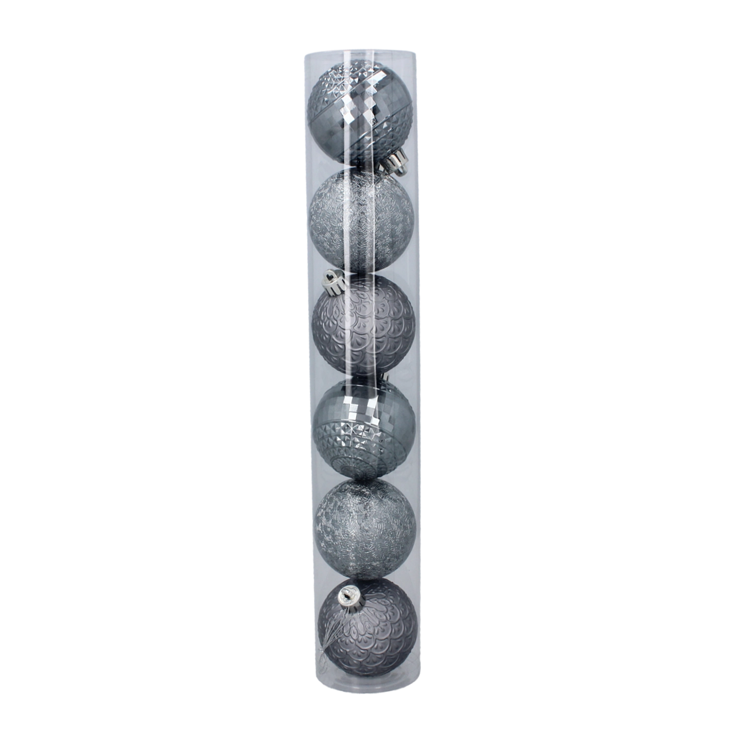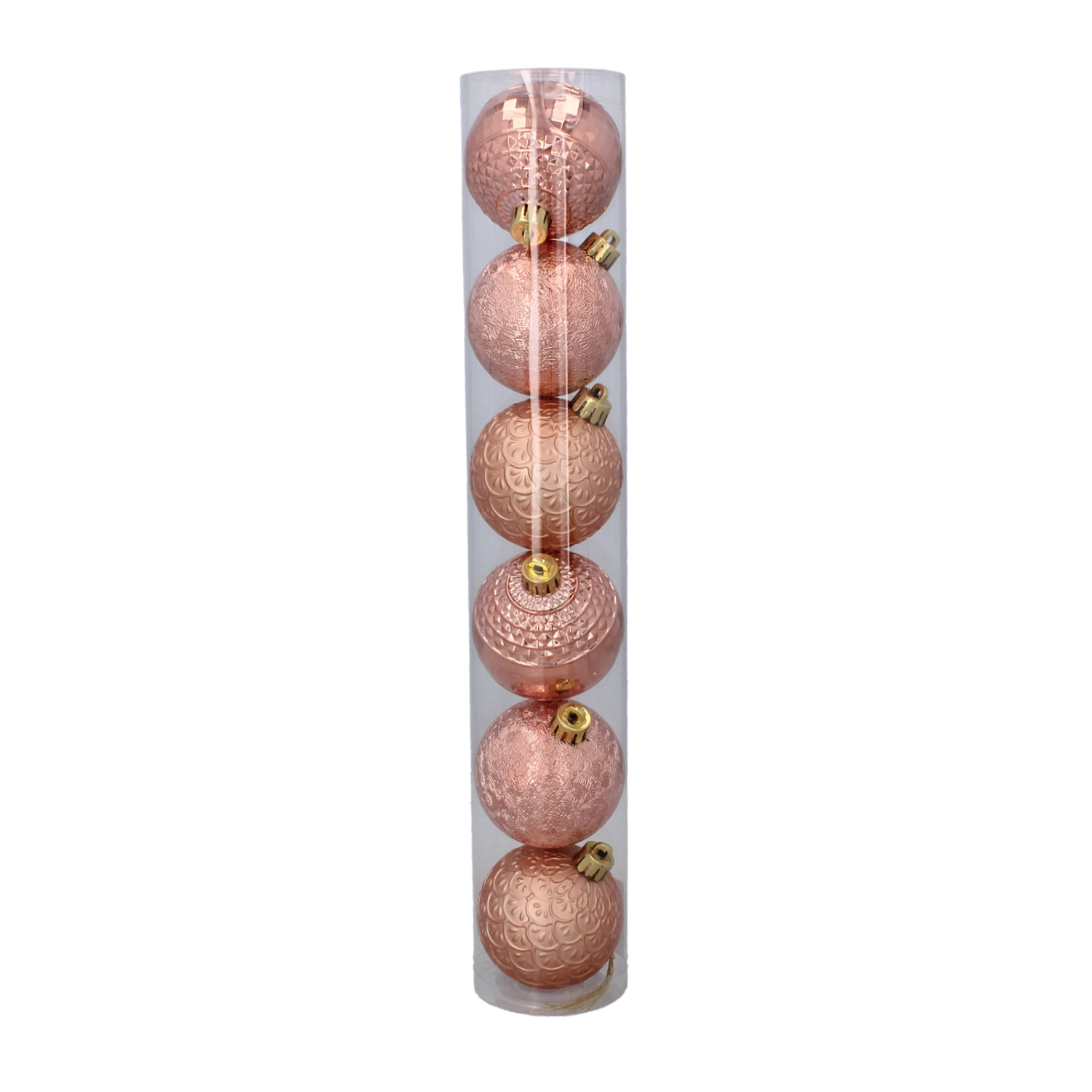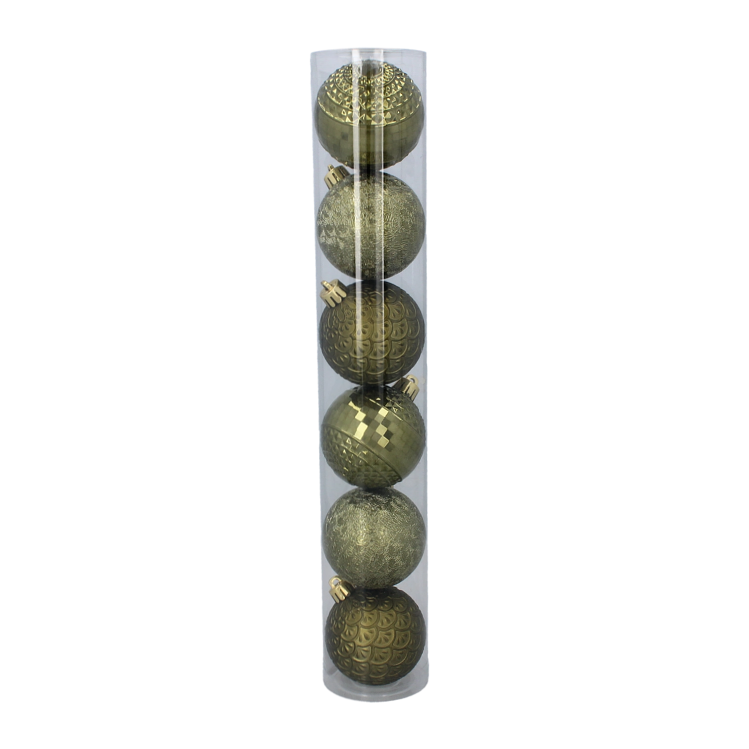 Een elegante set van zes kerstornamenten met een diameter van 6 cm in de tinten olijfgroen, koper en grafiet die elke boom laten stralen. Elke bal heeft een uniek patroon voor een stijlvolle, gevarieerde decoratie, is duurzaam uitgevoerd in kunststof en wordt geleverd in een praktische koker voor veilige opslag.