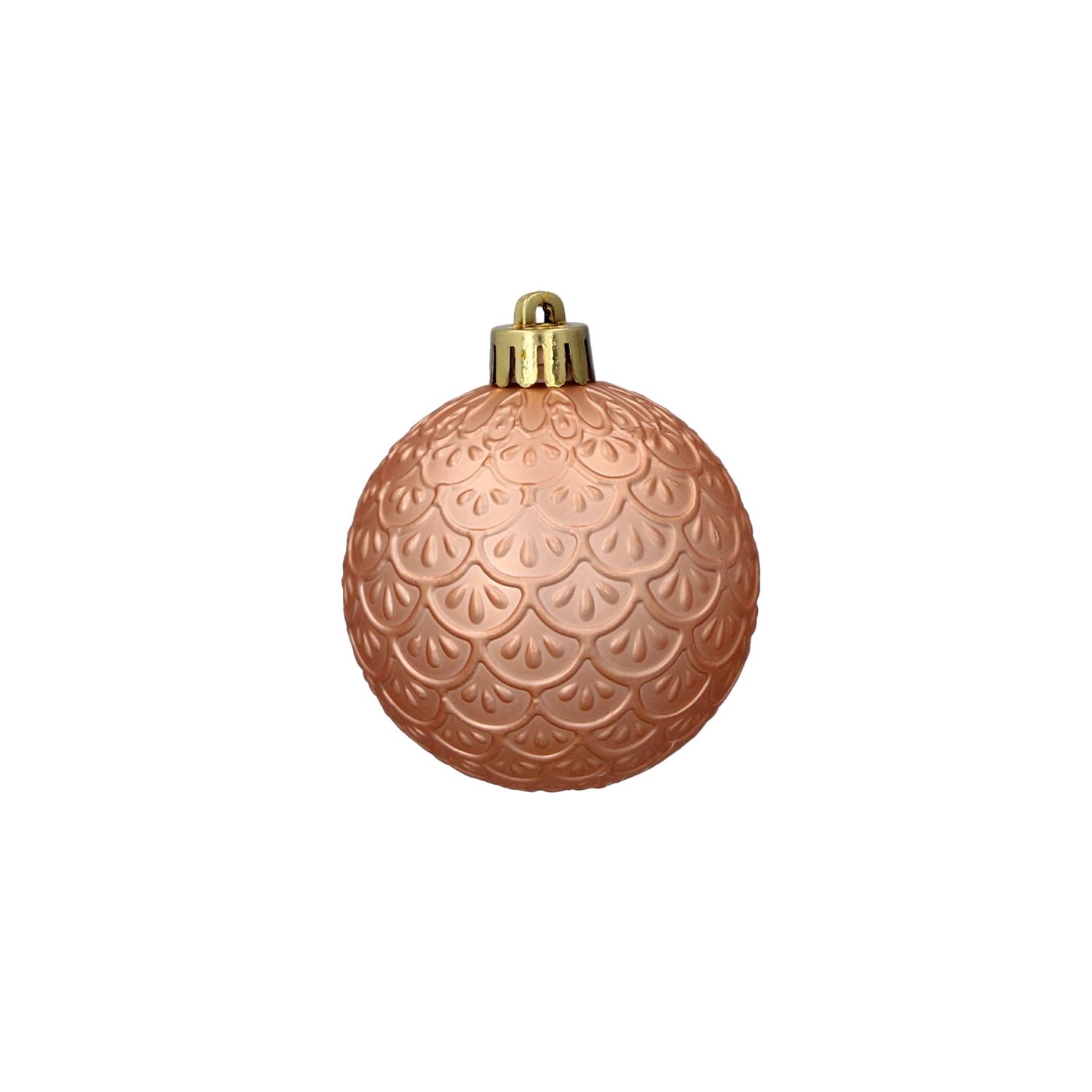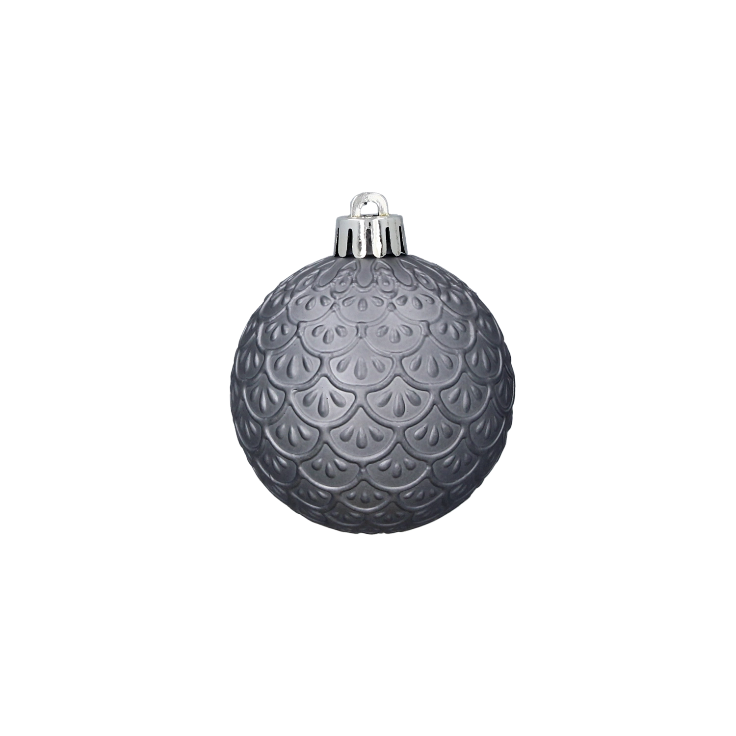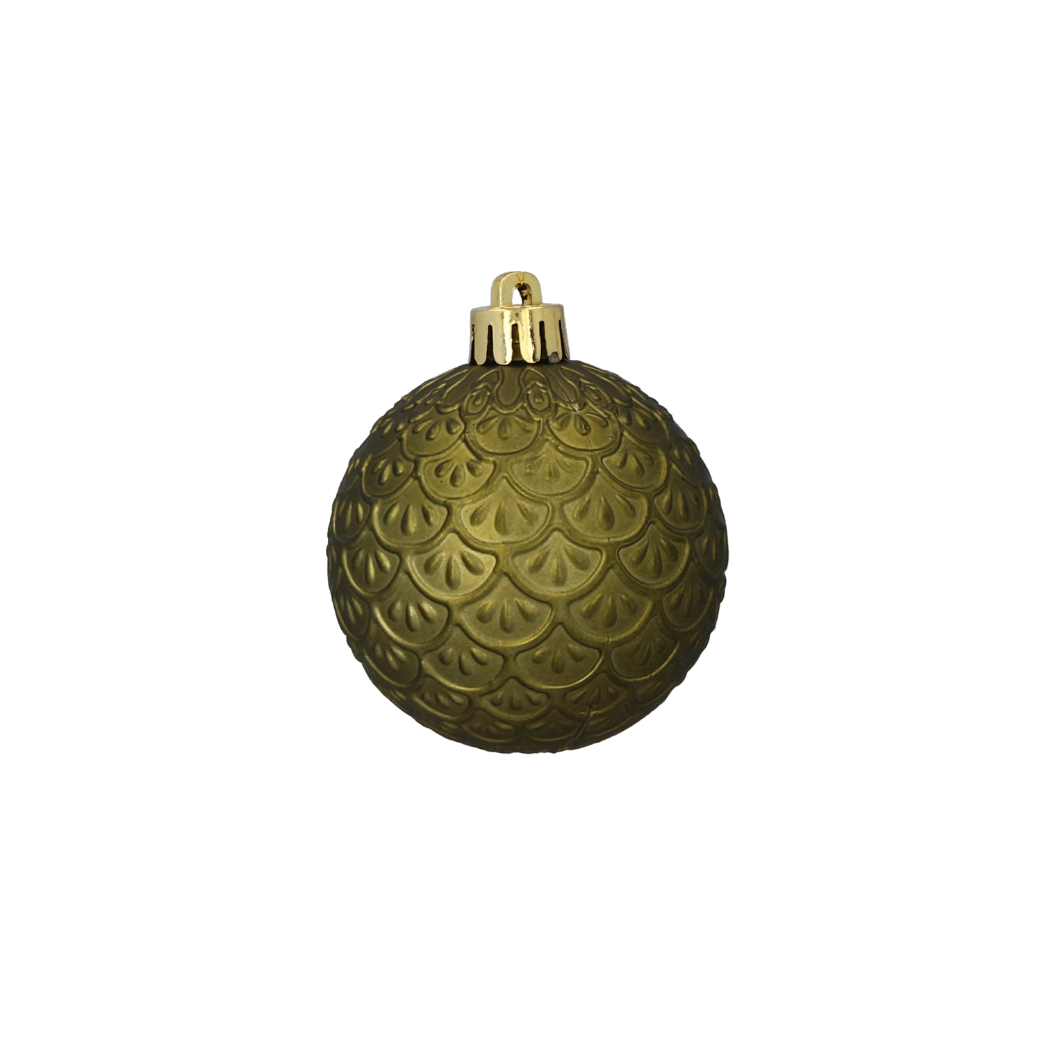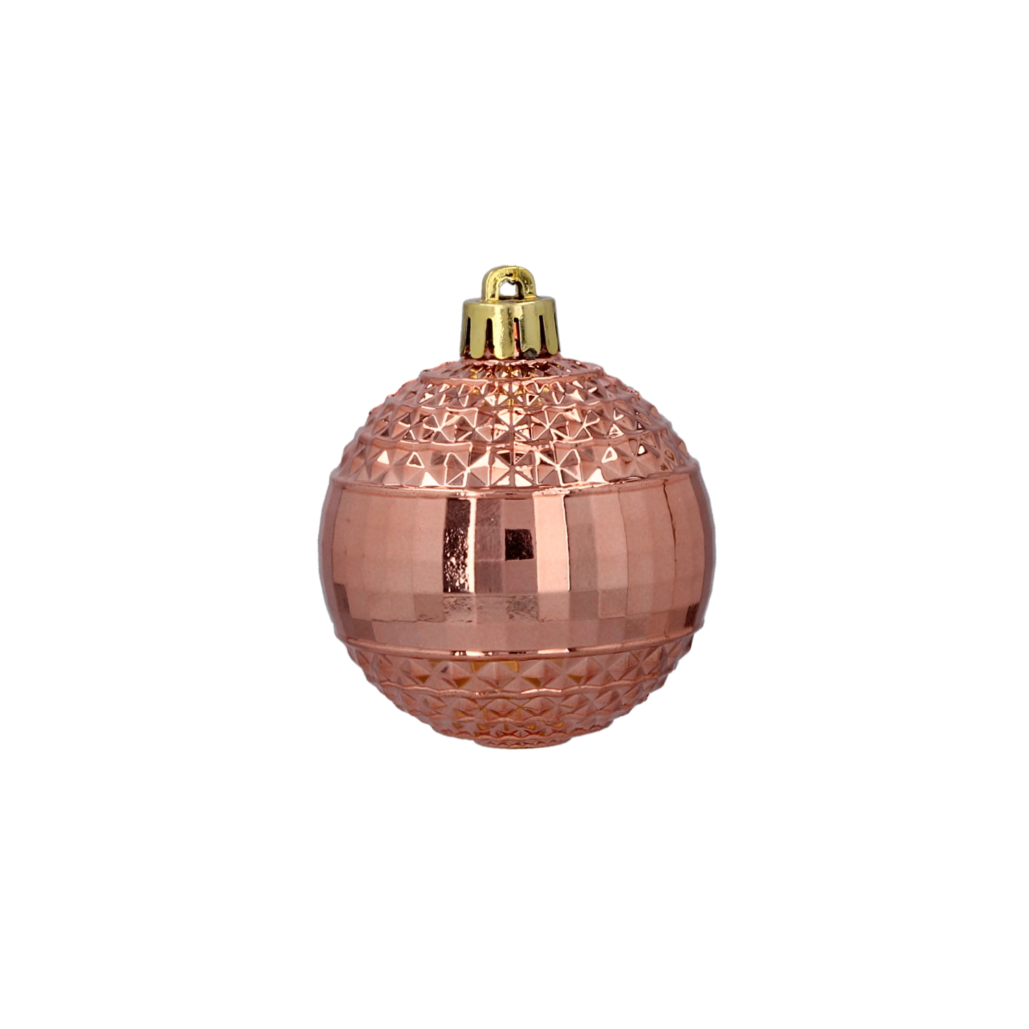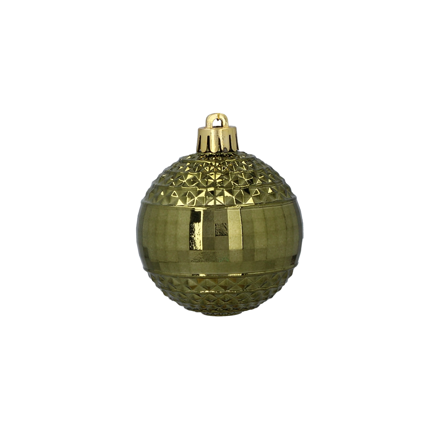 Een elegante set van zes kerstornamenten met een diameter van 6 cm in de tinten olijfgroen, koper en grafiet die elke boom laten stralen. Elke bal heeft een uniek patroon voor een stijlvolle, gevarieerde decoratie, is duurzaam uitgevoerd in kunststof en wordt geleverd in een praktische koker voor veilige opslag.