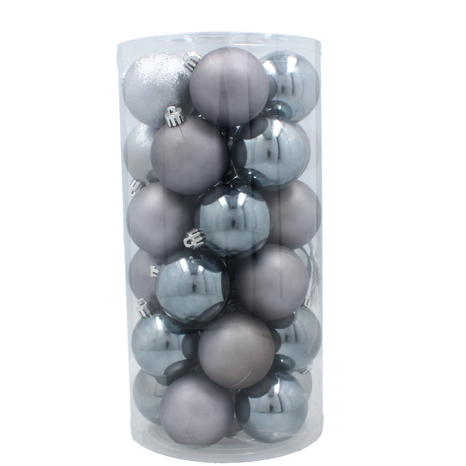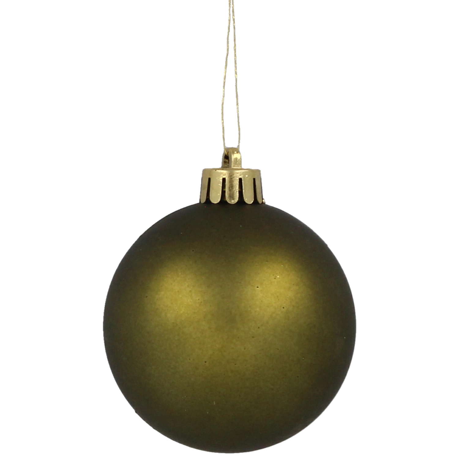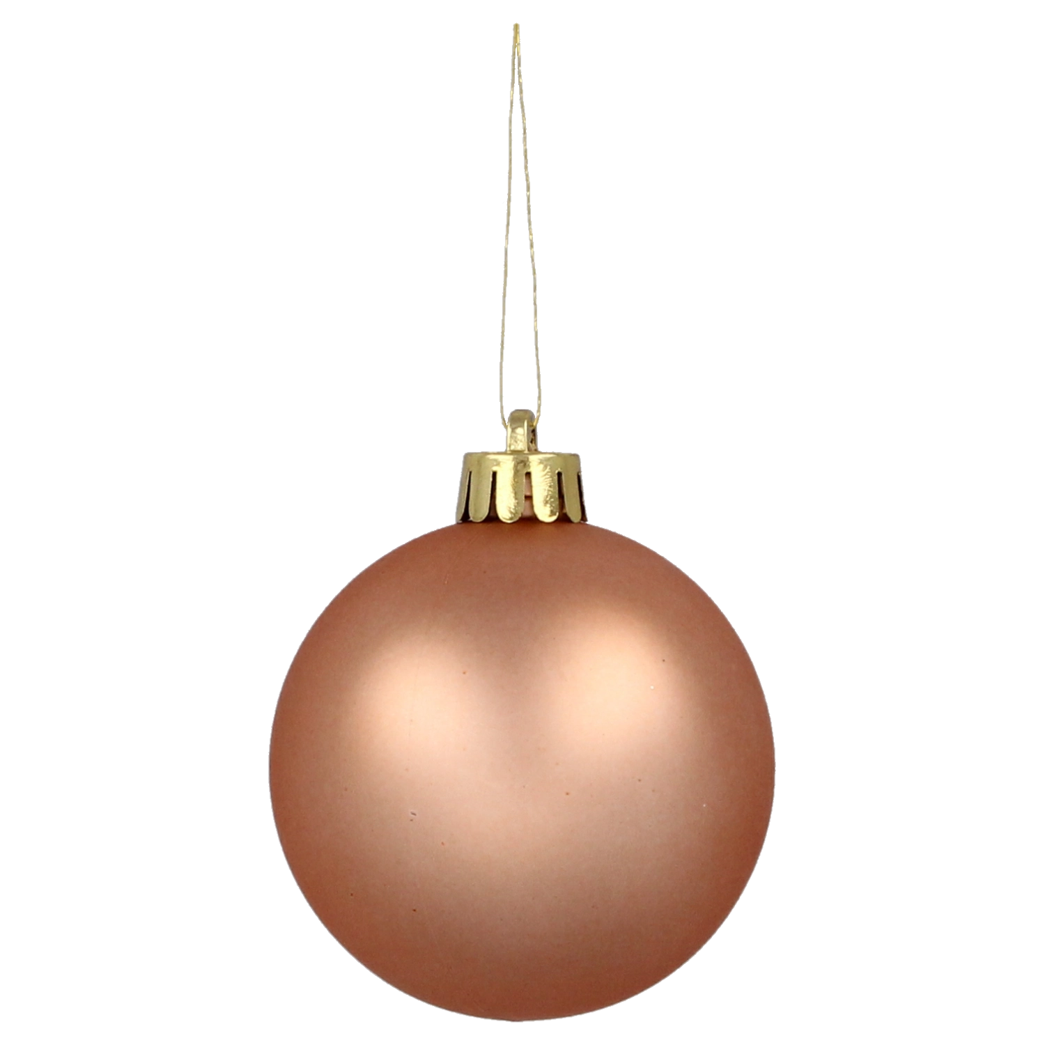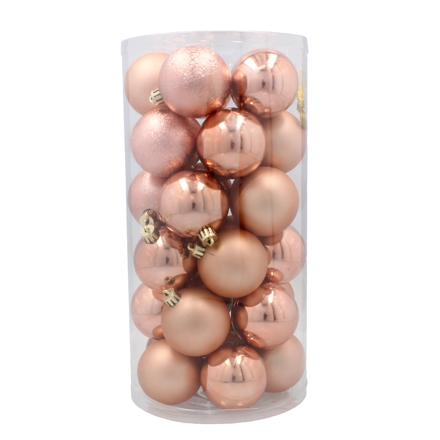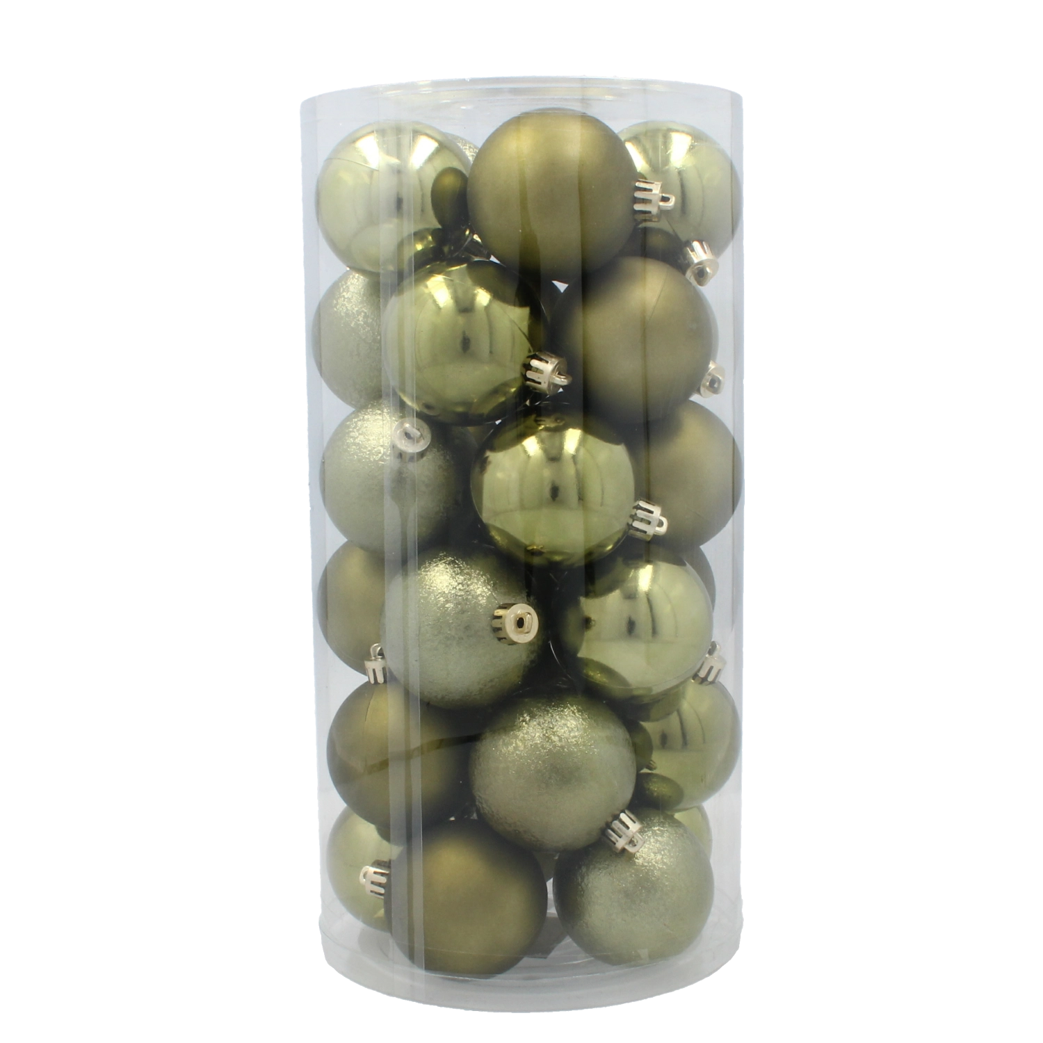 Stijlvolle set van 30 kerstornamenten met een diameter van 6 cm in elegante tinten olijfgroen, koper en grafiet geeft je huis een moderne feestelijke sfeer. Duurzame kunststof ballen met een glanzende, matte en glitterende afwerking zijn licht, onbreekbaar en veilig voor kinderen en huisdieren.