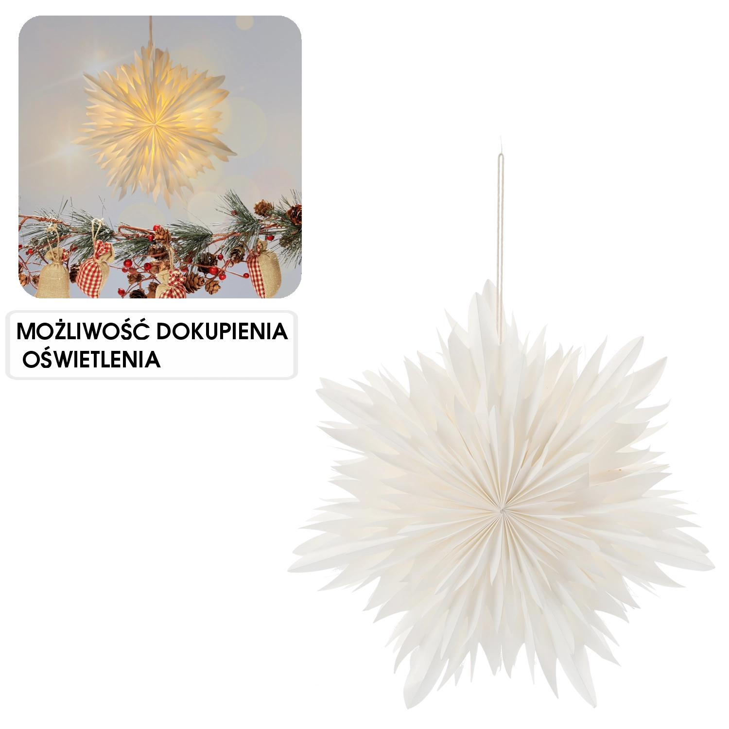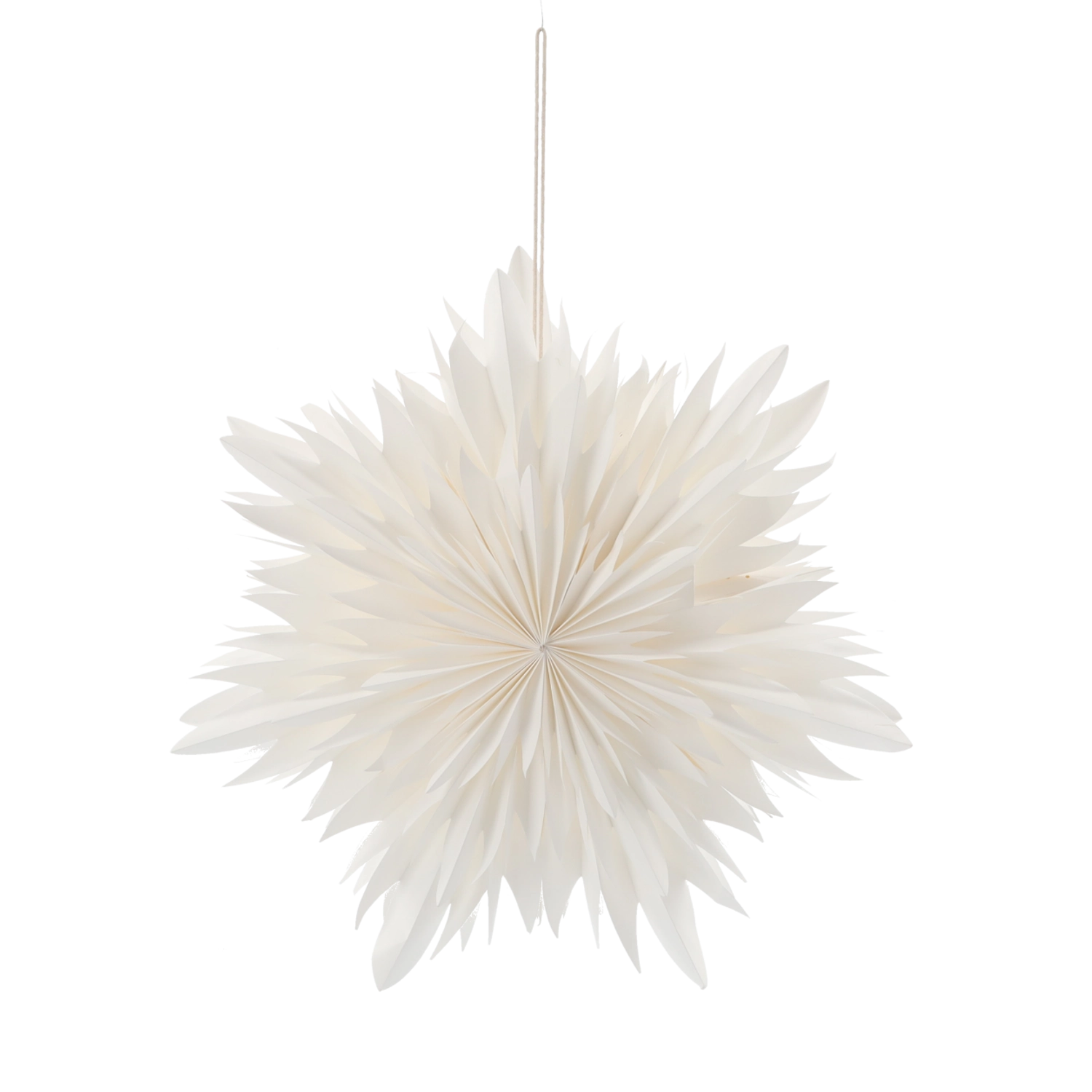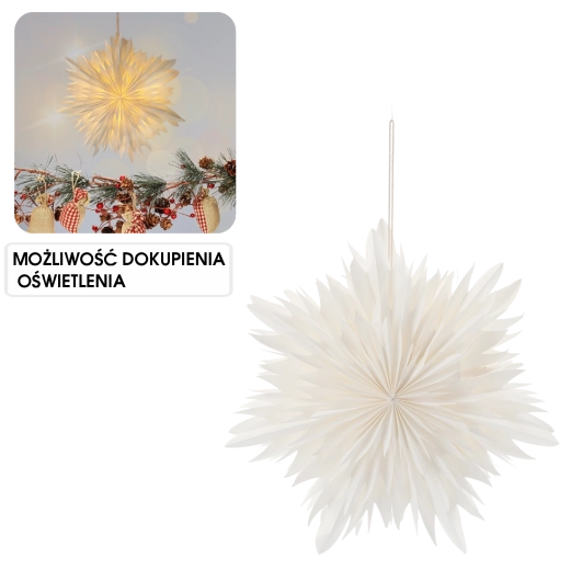 Ontdek pure elegantie in de vorm van een witte papieren ster die elke ruimte direct gezelliger maakt. Licht papier met een doordachte vouw zorgt voor een uitgesproken 3D‑effect en weerkaatst het licht prachtig. Ideaal om voor het raam, boven een tafel of in een etalage te hangen.