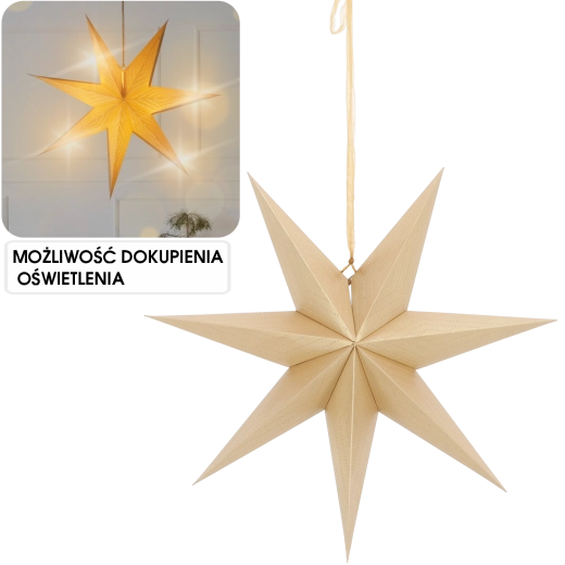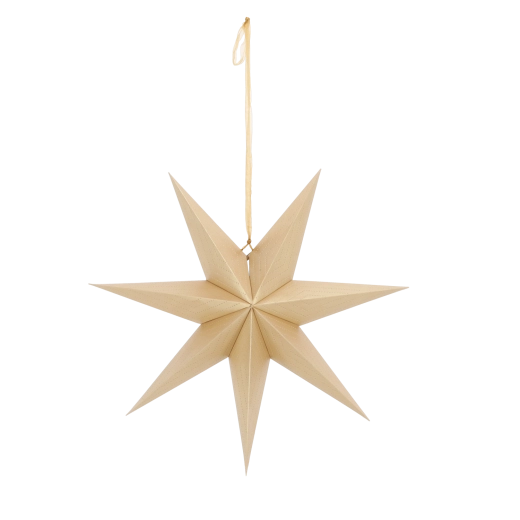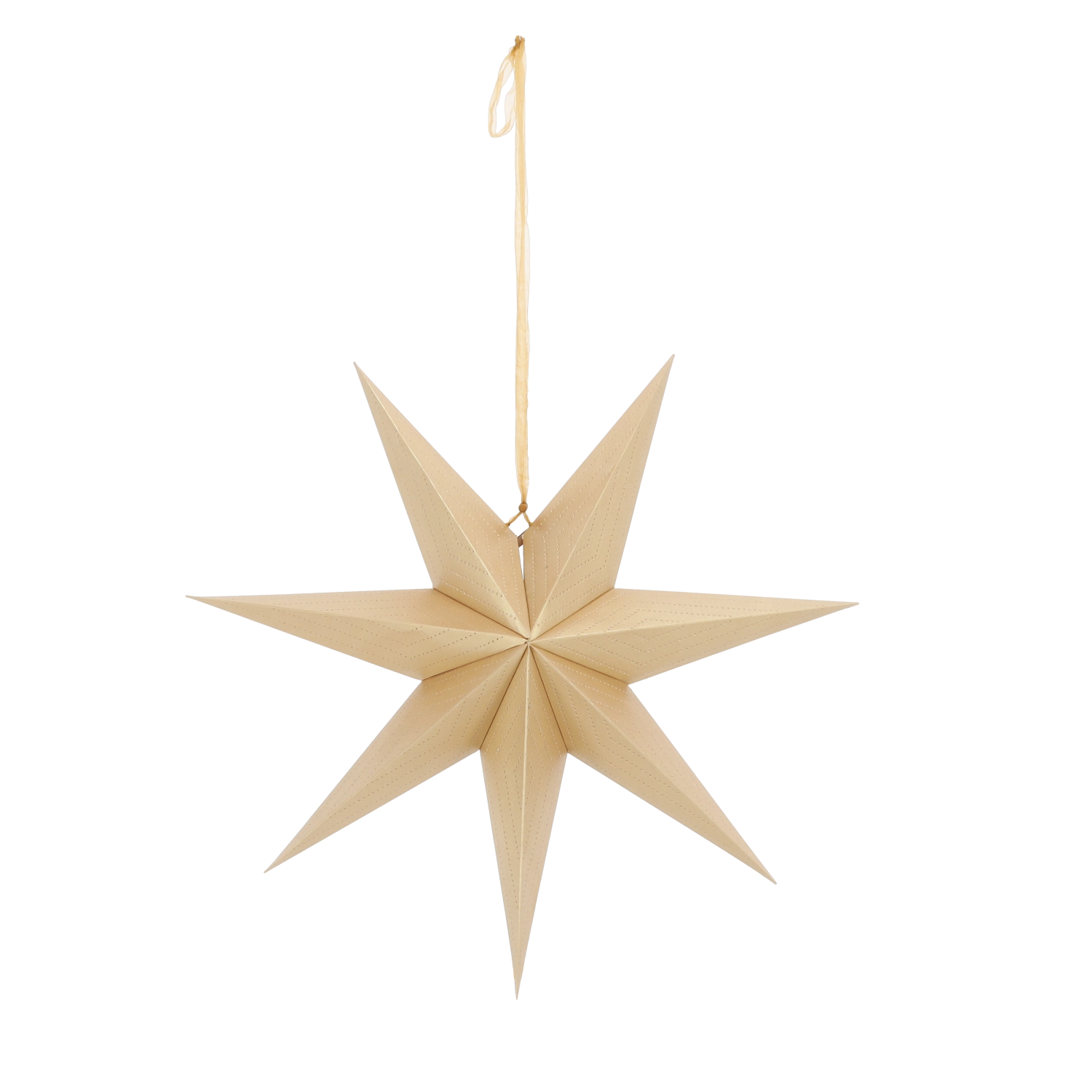 Elegante decoratieve ster met een diameter van 60 cm in luxe goud geeft je huis een feestelijke sfeer. De zevenpuntige vorm en het fijne geperforeerde patroon zorgen voor indrukwekkende lichteffecten, vooral bij een lichtbron. Eenvoudig op te hangen, opvouwbaar en gemaakt van FSC-gecertificeerd papier – een mooie en milieuvriendelijke keuze voor het raam, aan de muur of boven de tafel.