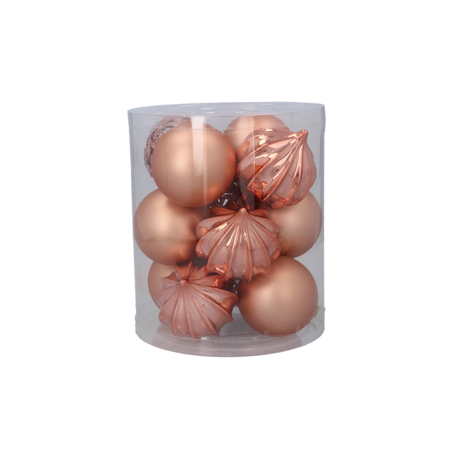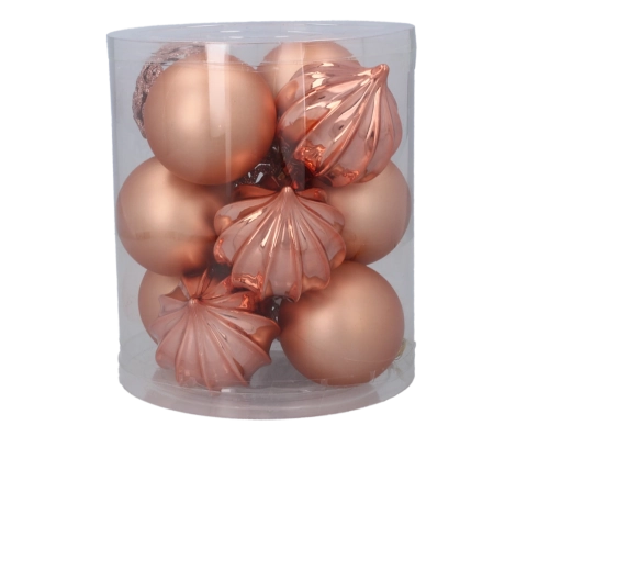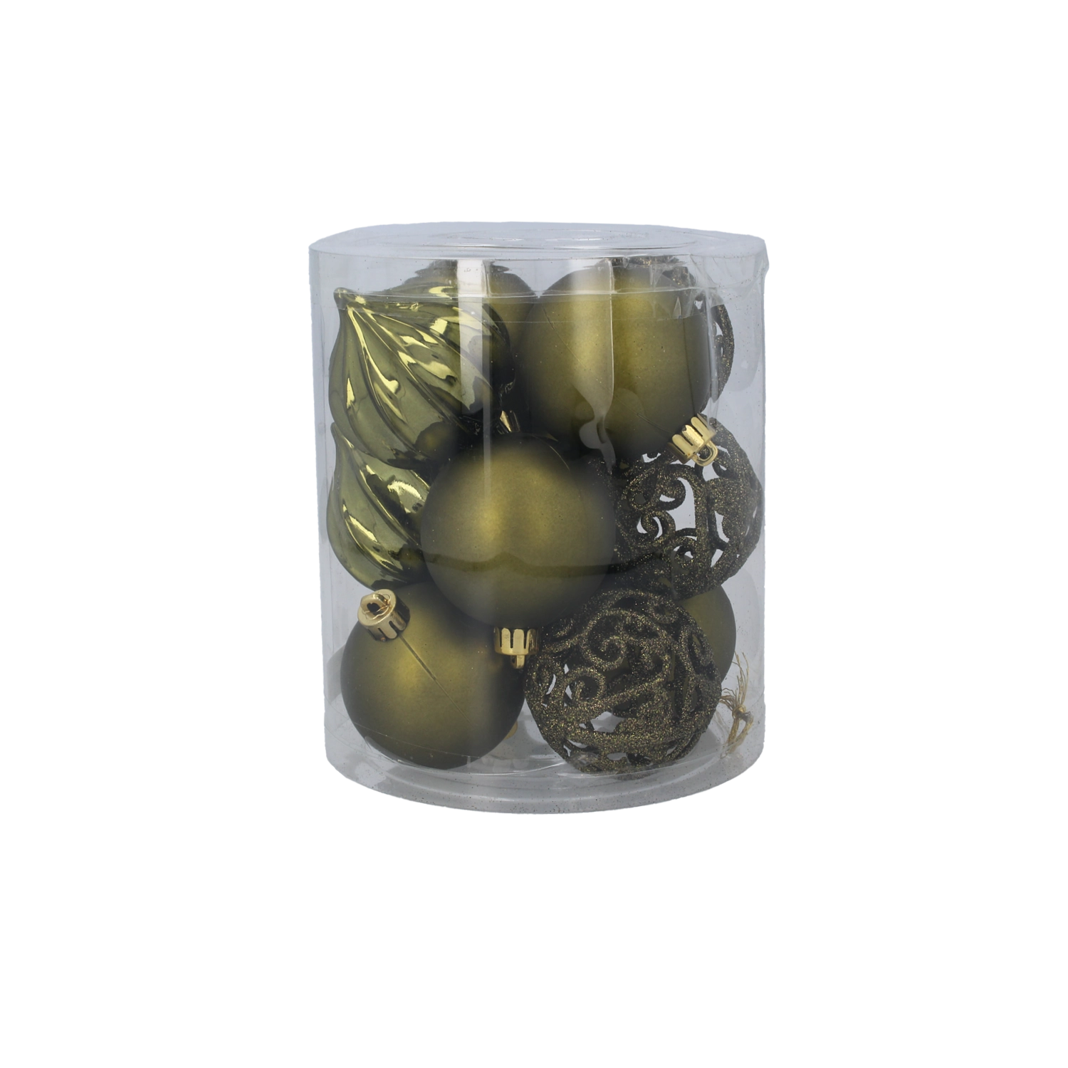 Elegante set van 12 kerstballen met een diameter van 6 cm in een combinatie van olijfgroen, koper en grafiet die je boom een moderne en verfijnde uitstraling geeft. De ornamenten zijn van duurzaam kunststof, waardoor ze niet snel breken, en dankzij de transparante koker berg je ze gemakkelijk op tijdens en buiten het seizoen.