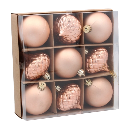 Deze uitgebalanceerde collectie brengt harmonie in kleuren en texturen voor zowel klassieke als moderne kerstarrangementen. Het lichte materiaal maakt ophangen aan takken eenvoudig en dankzij de stevige constructie blijven de ballen mooi, ook bij veelvuldig hanteren.