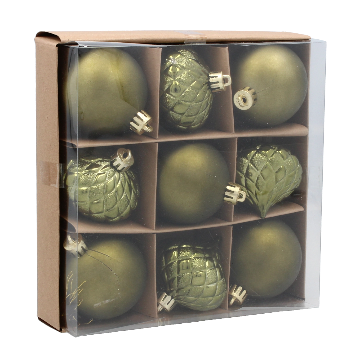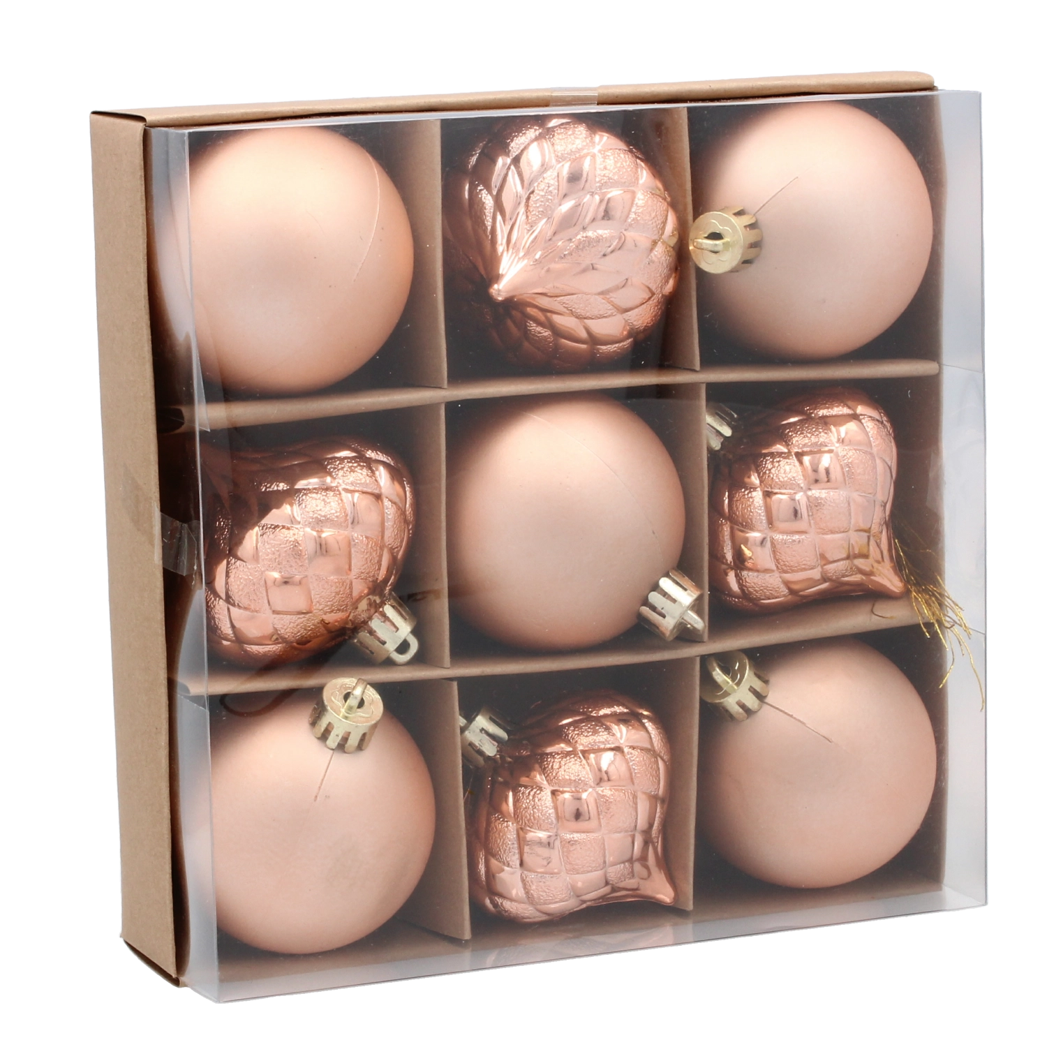 De diverse reliëf- en gladde patronen geven de decoratie diepte en sprankeling, waardoor de boom voller en stijlvoller oogt zonder extra accessoires.