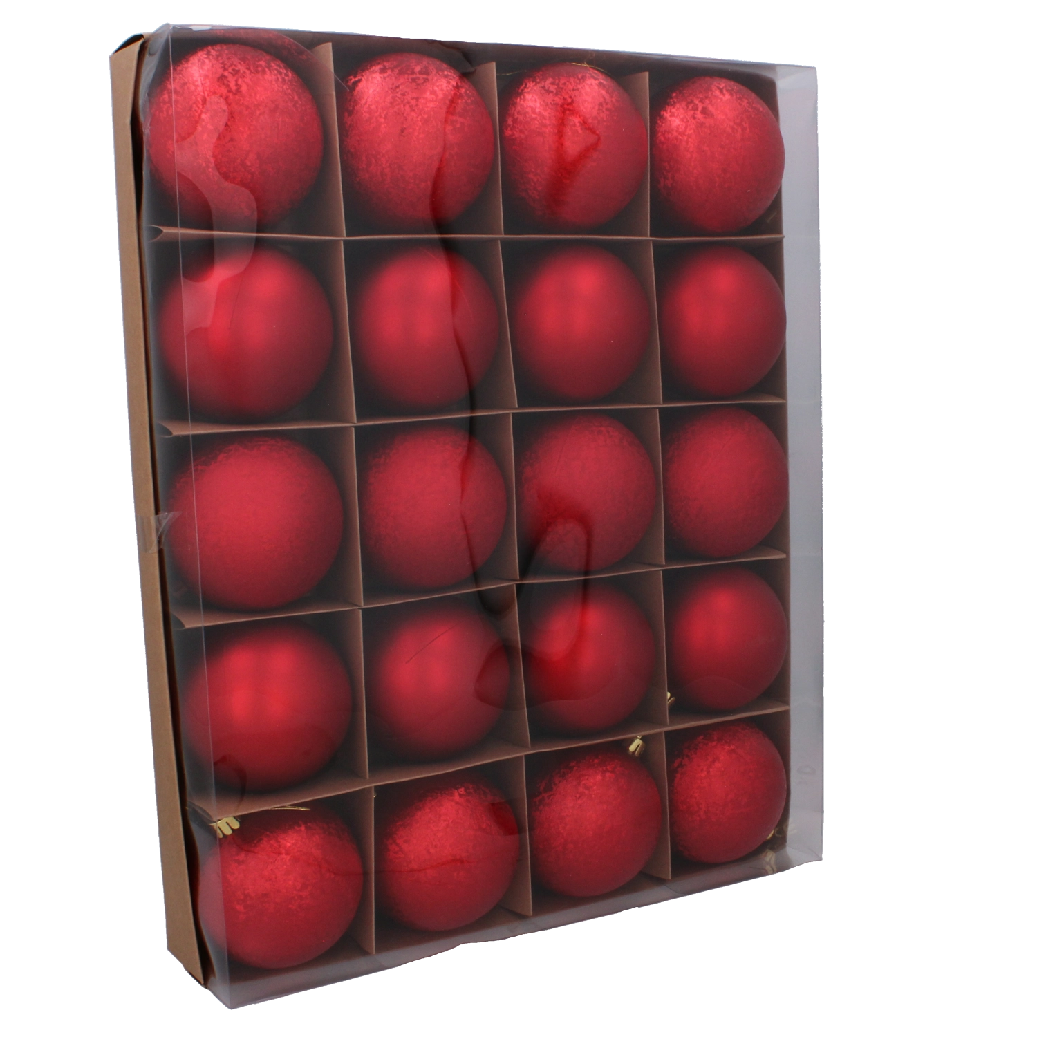 Elegante set van 20 kerstornamenten met een diameter van 8 cm in een harmonische mix van rode, gouden en zilveren tinten. De combinatie van matte, gestructureerde en glanzende afwerkingen zorgt voor een evenwichtige en uniforme look van de kerstboom. Ideaal voor een snelle en stijlvolle feestelijke decoratie met perfect op elkaar afgestemde tonen.