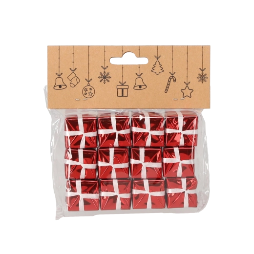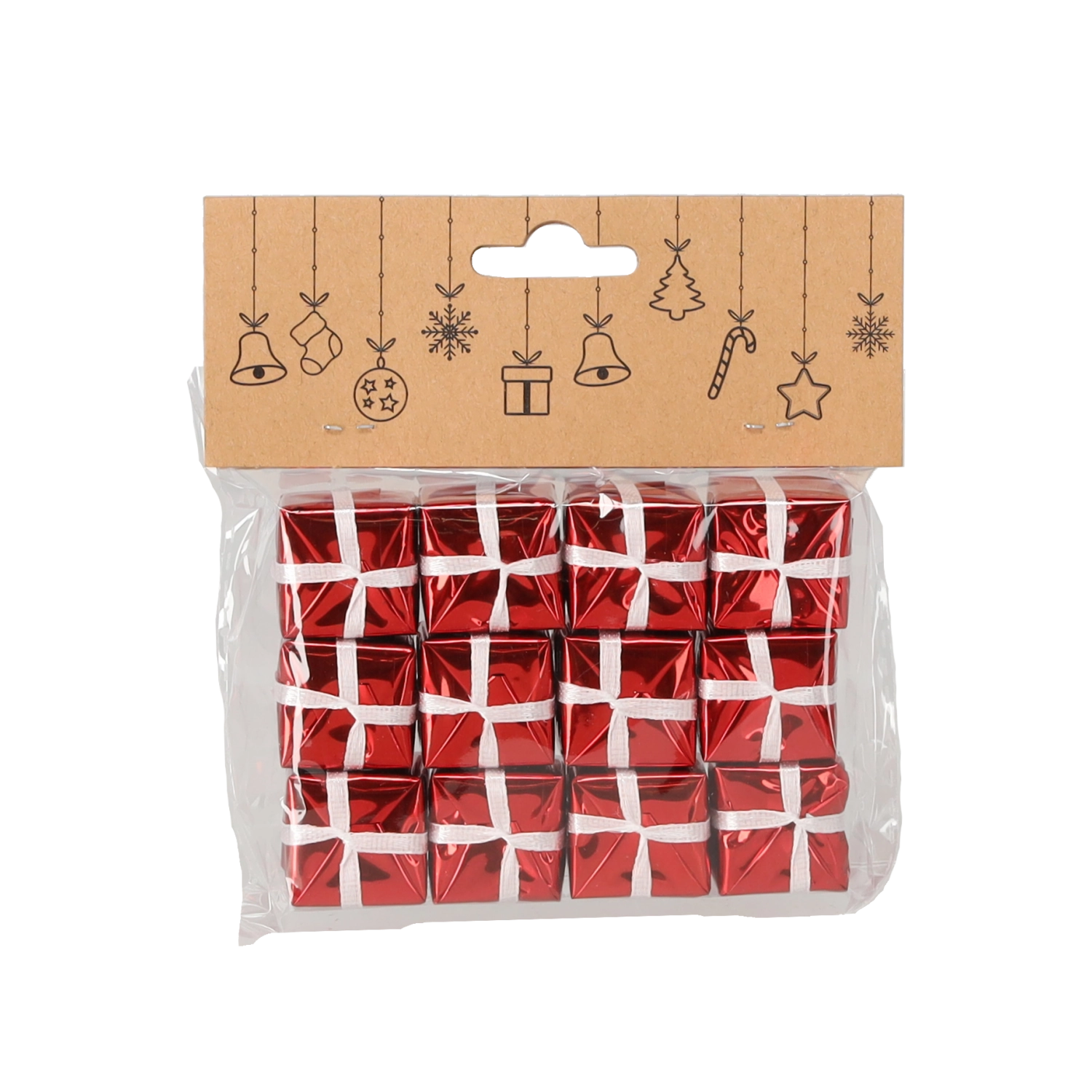 Geef je huis een vleugje kerstsfeer met een set van 12 kleine ornamenten in de vorm van cadeautjes van 2,5 cm. Deze lichte decoraties zijn eenvoudig op te hangen aan de kerstboom, guirlandes of kransen en benadrukken de feestelijke sfeer. Dankzij het universele design combineer je ze moeiteloos met zowel traditionele als moderne decoraties.