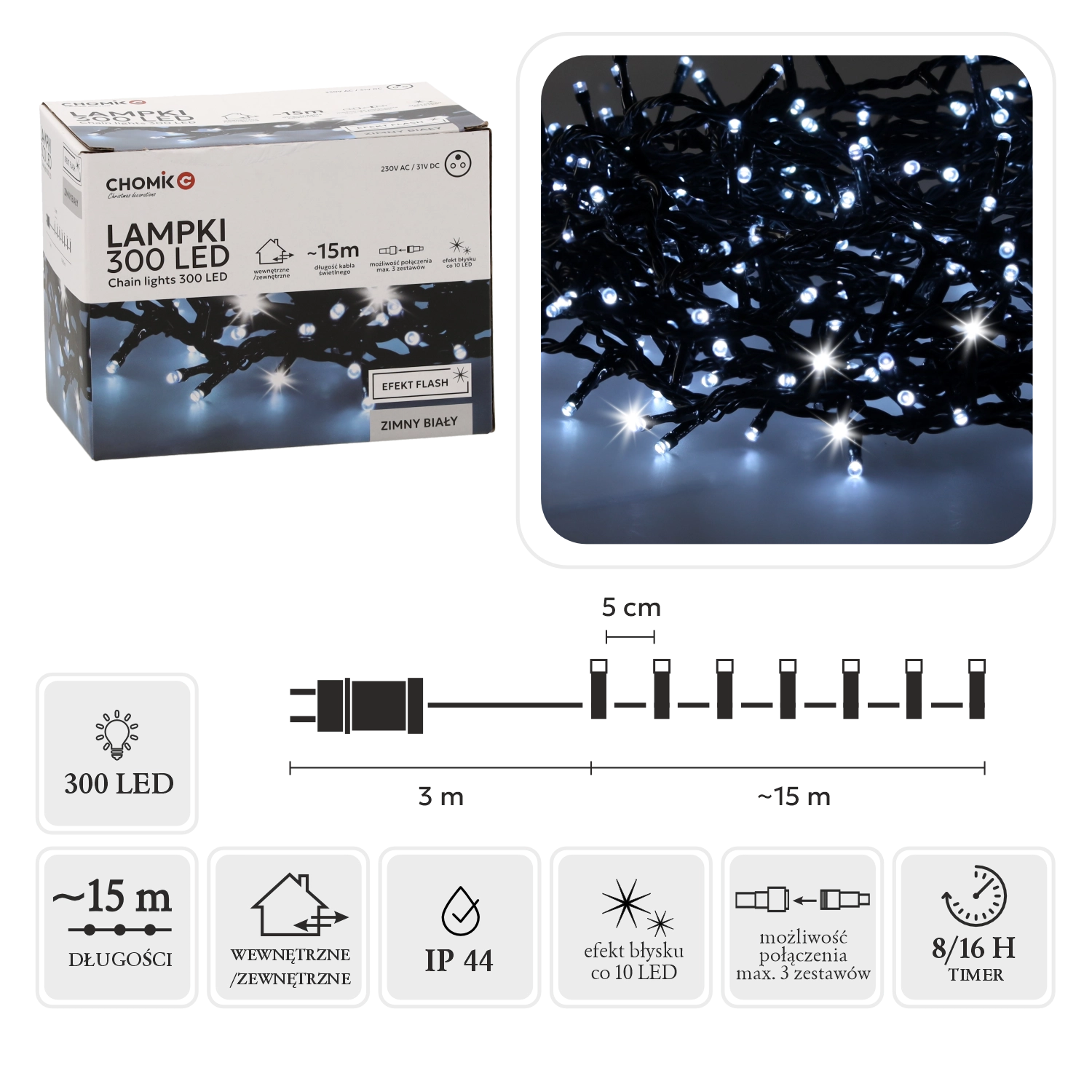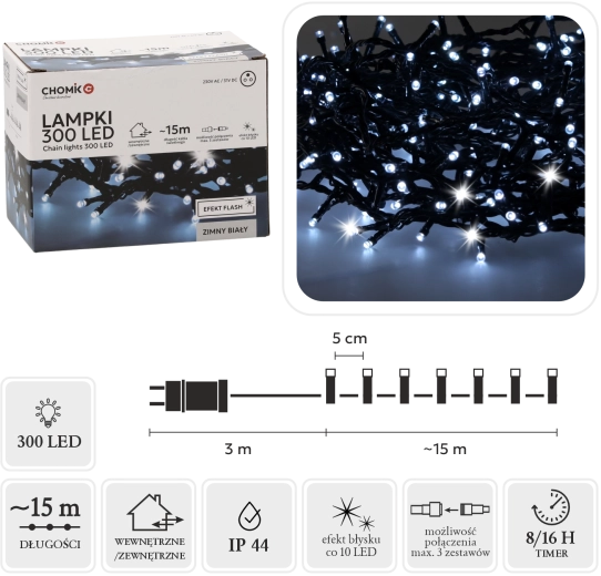 Dit universele LED-lichtsnoer met 300 hoogwaardige diodes in koud wit met koud flitseffect is ideaal voor het decoreren van huis, tuin, bomen en ramen. De totale lengte van 18 m (waarvan 15 m lichtend deel) biedt voldoende licht voor grotere oppervlakken, terwijl de 3 m voedingskabel het aansluiten op een stopcontact vergemakkelijkt.