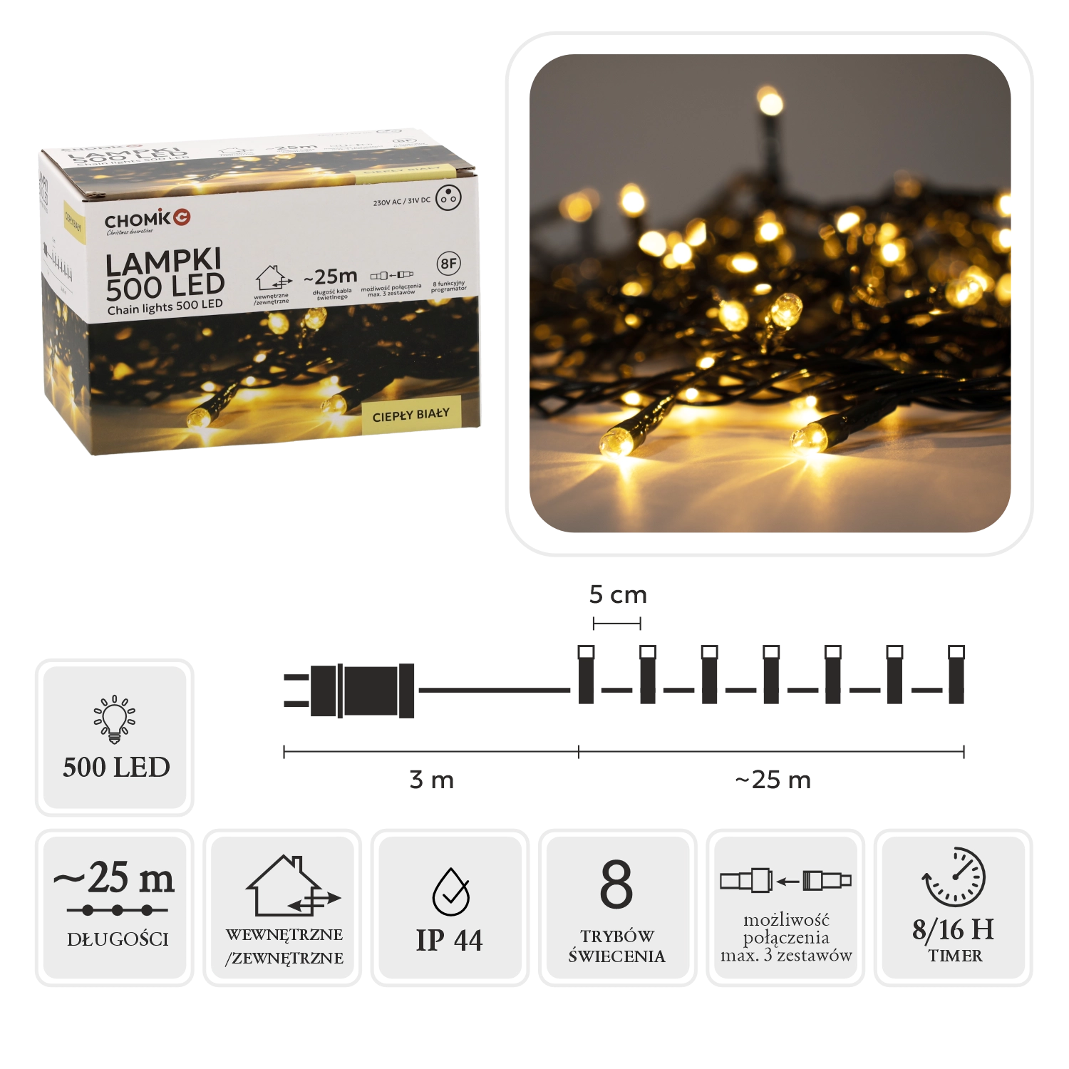 De ingebouwde controller met 8 functies, geheugen en 8/16 u timer zorgt voor comfortabel gebruik en het onthouden van de laatste instelling. De mogelijkheid om tot 3 sets te koppelen laat je lange, opvallende lichtinstallaties maken zonder compromissen. IP44-bescherming en de laagspanningsvoeding van 31 V verhogen de veiligheid voor gebruik binnen en buiten.