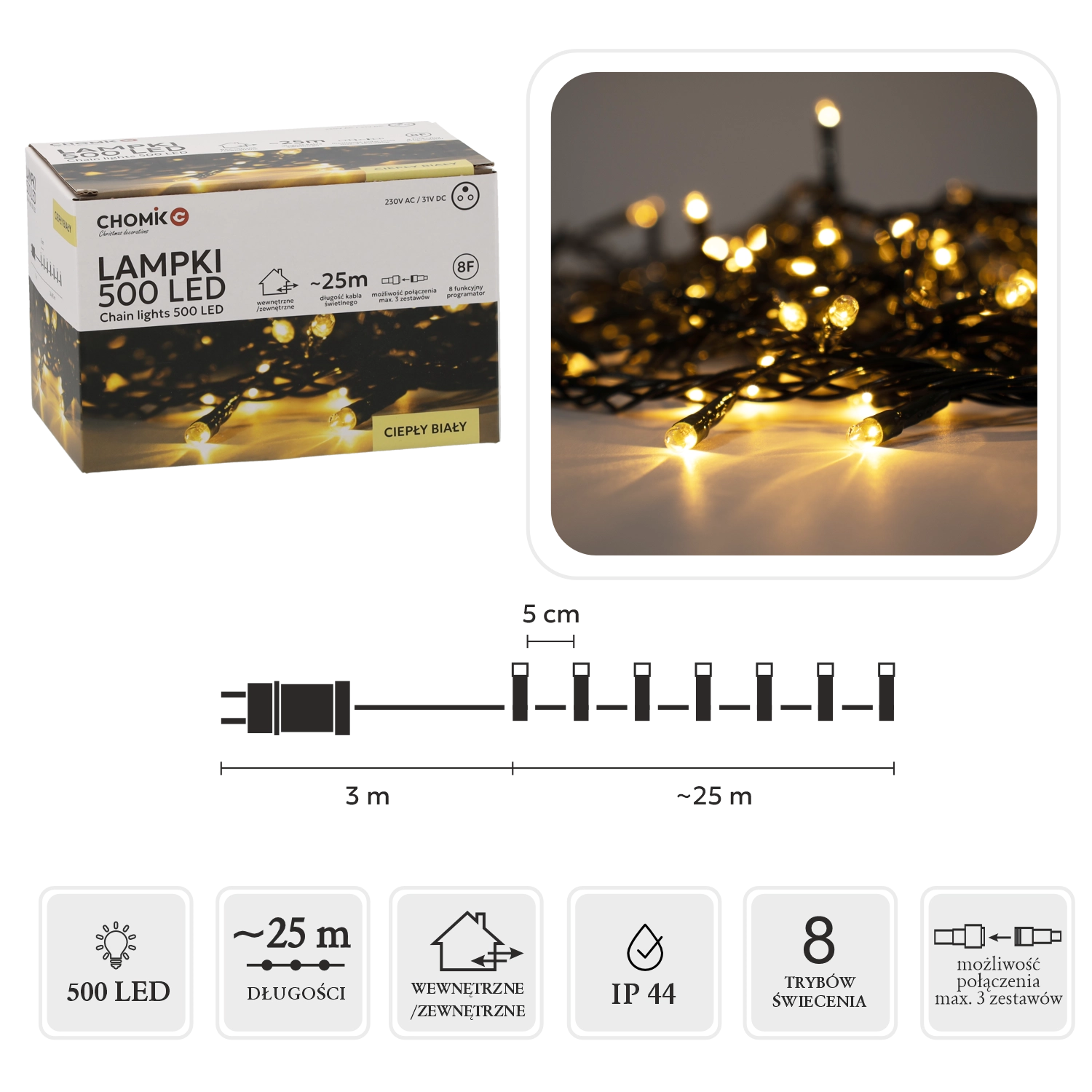 Op zoek naar betrouwbare en elegante kerstverlichting? Deze LED-lichtslinger met 500 diodes in warm wit geeft jouw ruimte een gezellige, feestelijke sfeer. Dankzij de lengte van het verlichte deel van 25 m en de LED-afstand van 5 cm bedekt hij gelijkmatig de boom, gevel of balustrade.