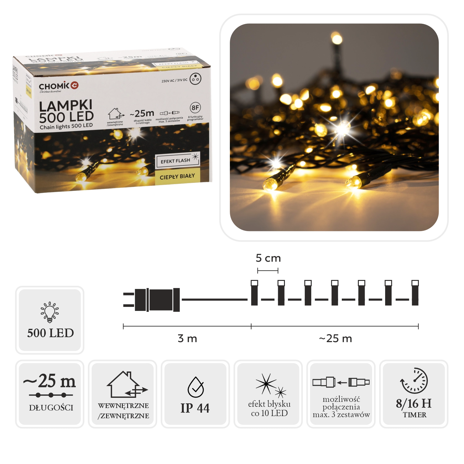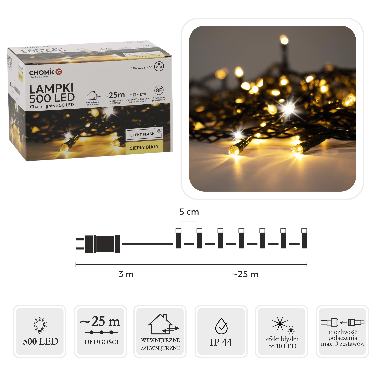 Elegant lichtsnoer met 500 LED's, ideaal voor grote bomen, gevels, balustrades en ruime interieurs. De combinatie van warm wit met een subtiele koele flits creëert een dynamisch maar smaakvol effect voor een feestelijke sfeer. De groene kabel gaat op in naalden en donkere achtergronden; de discrete voedingsadapter verstoort het totaalbeeld niet.