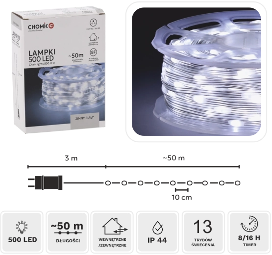Versier je huis met helder licht met dit LED microlightsnoer van 50 m met koud wit licht en 500 LED’s. Biedt 8 lichtstanden met geheugenfunctie en timer 8/16 u, IP44 voor buiten en binnen, transparante isolatie en veilige voeding 31 V met 3 m aanvoerkabel.